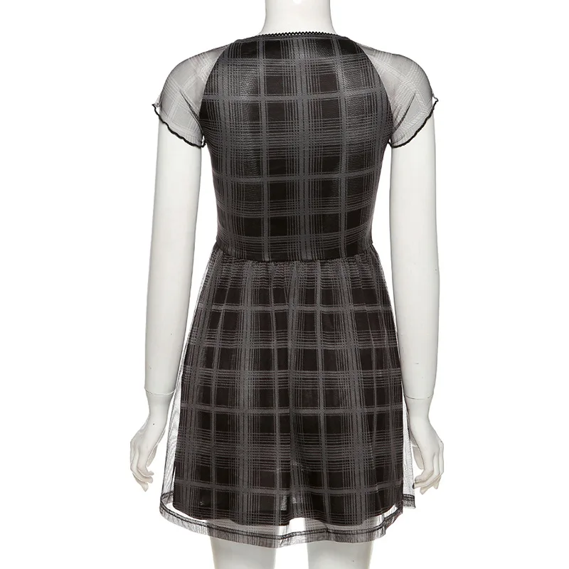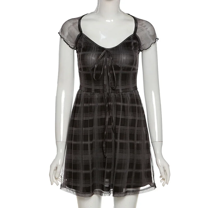 Goth Dark Gothic Plaid Black Lace Up Women Mini Dresses Harajuku Girl Short Sleeve ALine Party Dress Summer Fashion Streetwear