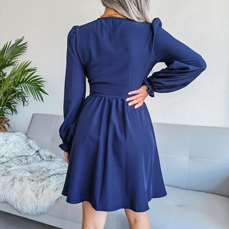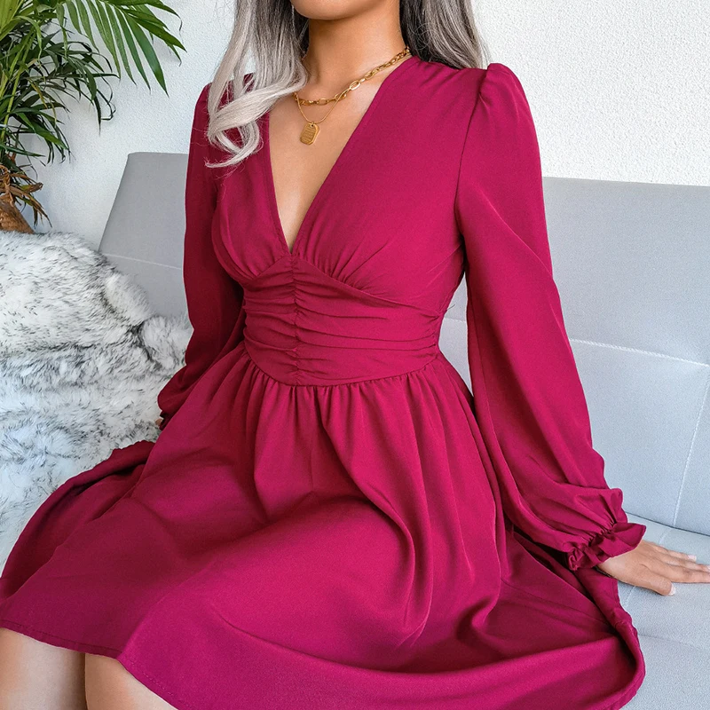 INS Style Fashion Spring Autumn Sexy Women V Neck Casual Solid Color Chiffon Pleated Mid Dress Long Sleeves Sweet Party Dresses