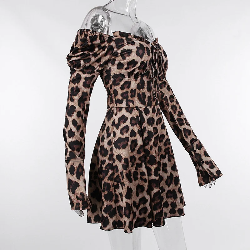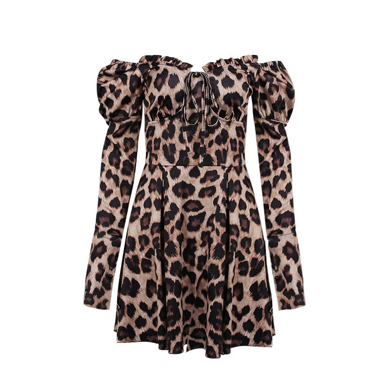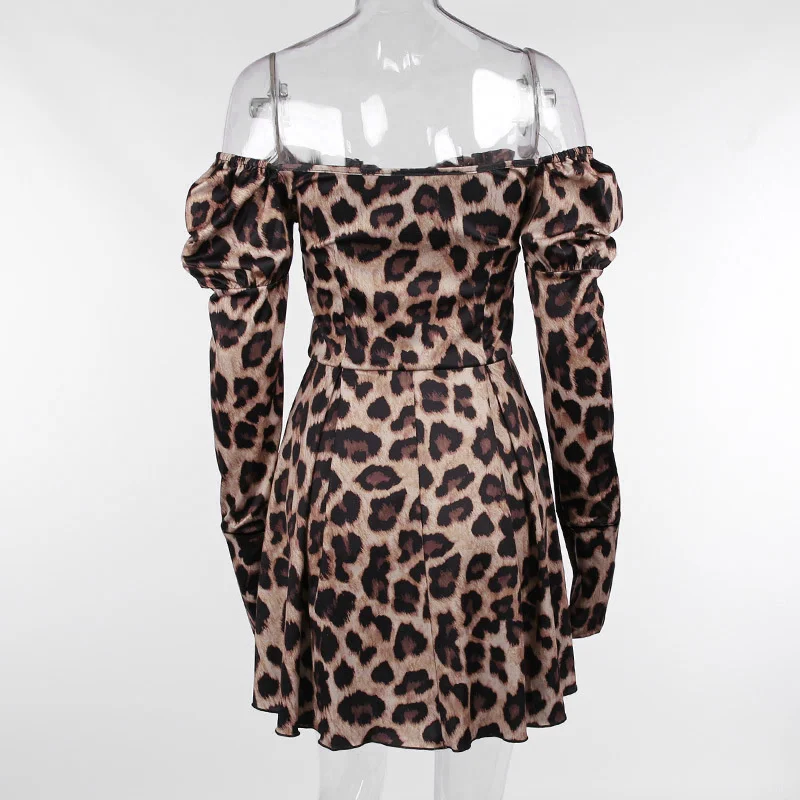 Leopard Long Sleeve Dress One Word Collar Low Neck Mini Dress Clubwear Elegant Puff Sleeve Sexy Party Dresses Woman Dress