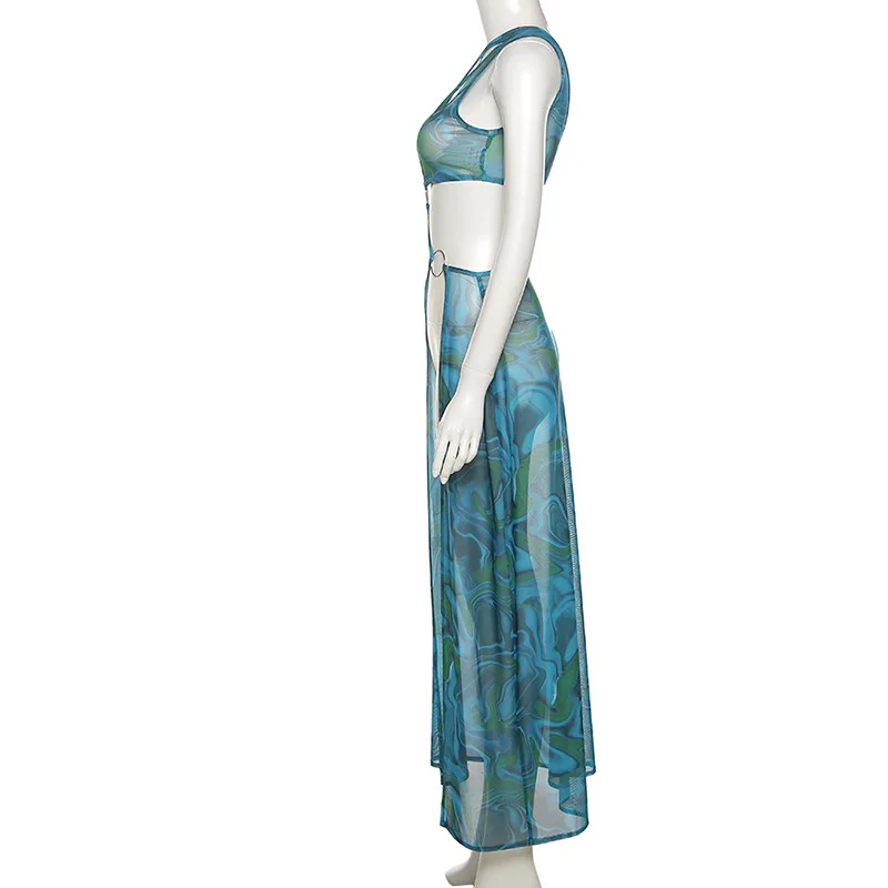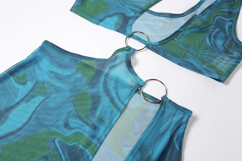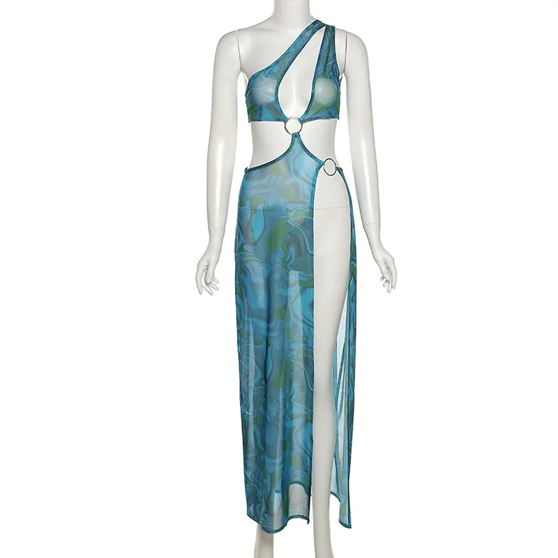 Sexy Chiffon Boho Vacation Beach Maxi Dresses Women One Shoulder Print Slit Summer See Through Cut Out Club Party Long Dress