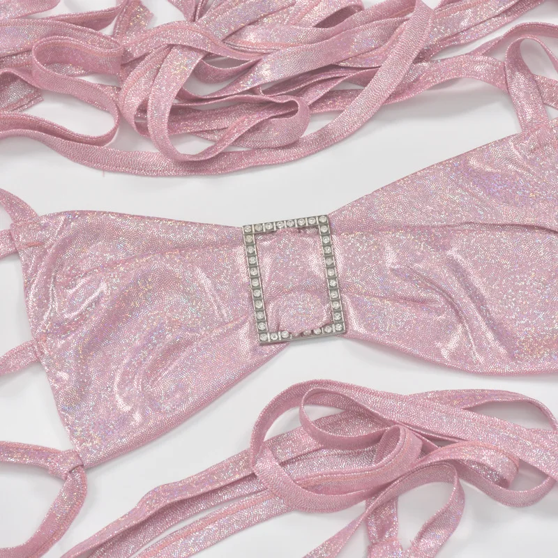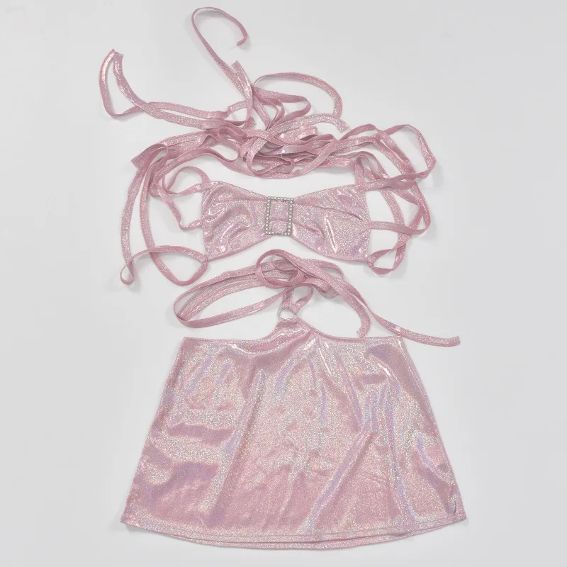 Sexy Lace Up Backless Cut Out Party Beach Dresses Women Summer Two Piece Set Pink Halter Crop Top and Bodycon Mini Skirts Suits