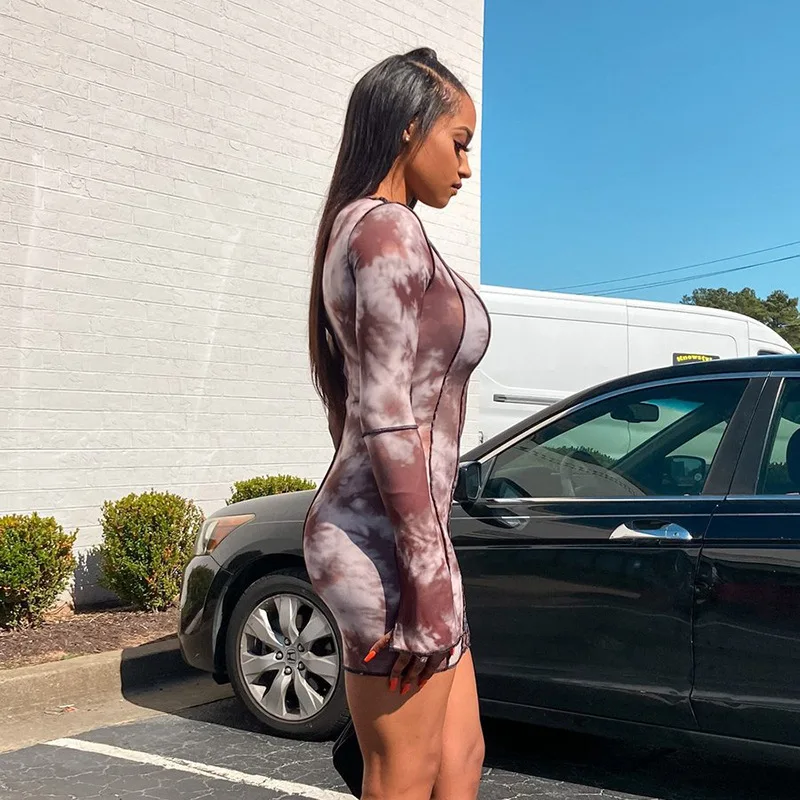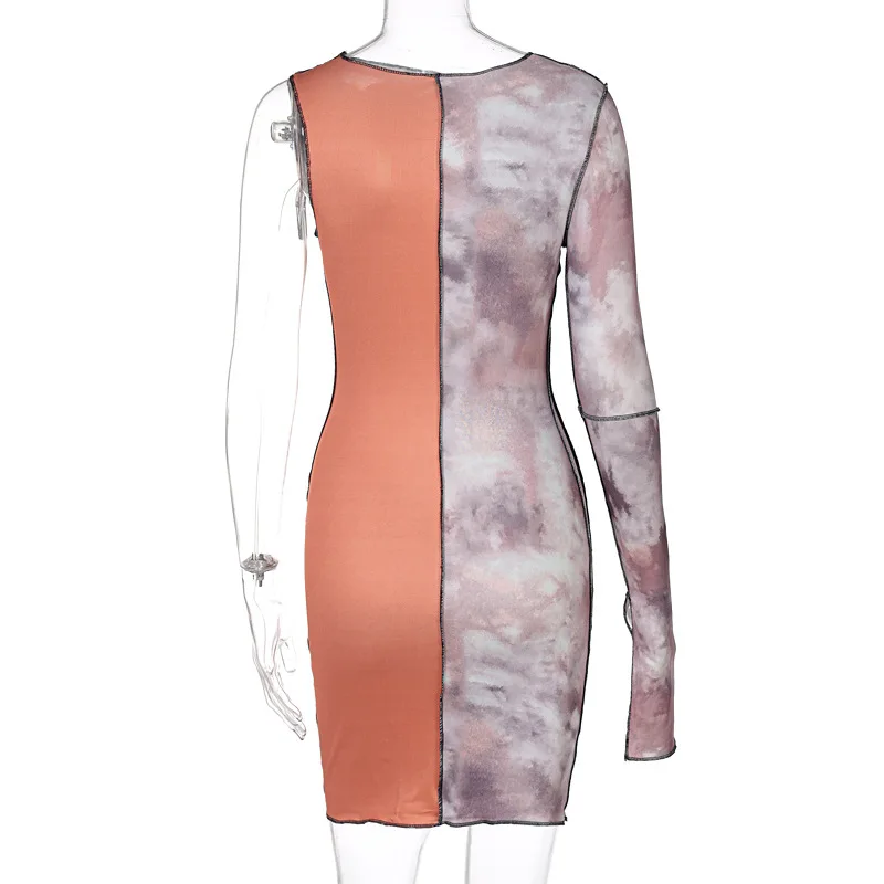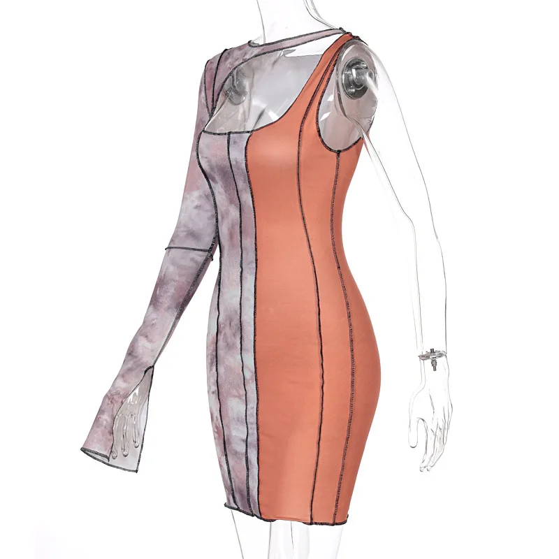 Sexy Print One Shouler Long Sleeve Bodycon Dress Clothes for Women Elegant Tie Dye Chic Party Mini Dresses Hollow Out Clubwear
