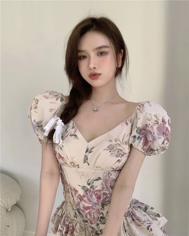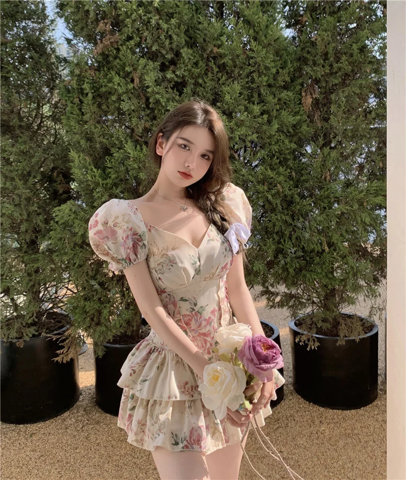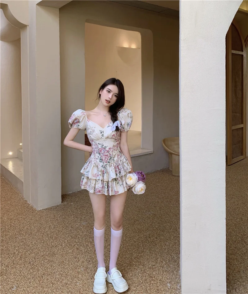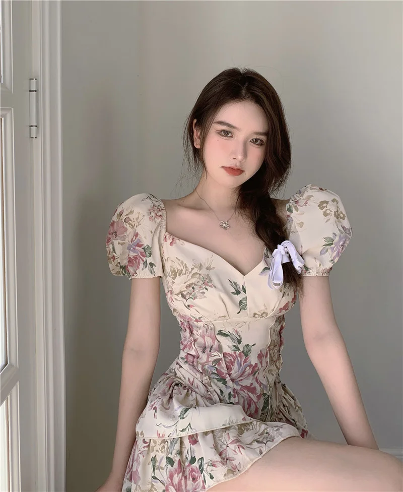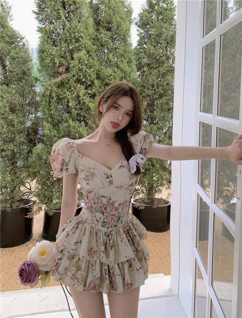 Sexy V-neck Party Mini Dresses Summer 2021 Ladies Print Puff Sleeve Women Bodycon Beach Vintage Bud Robes Boho Fashion Vestidos