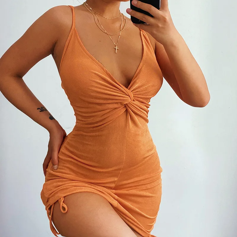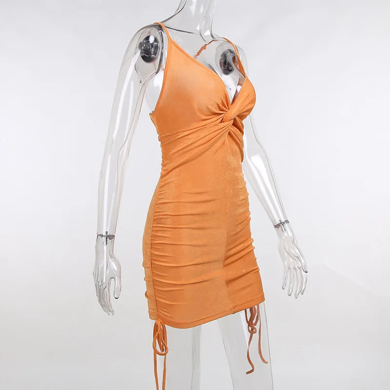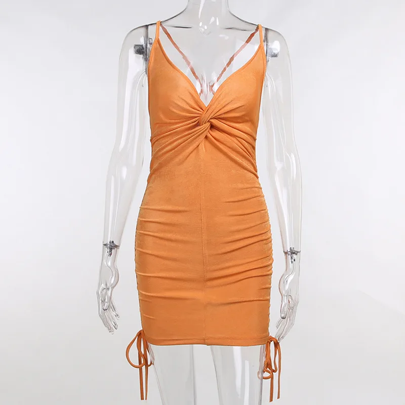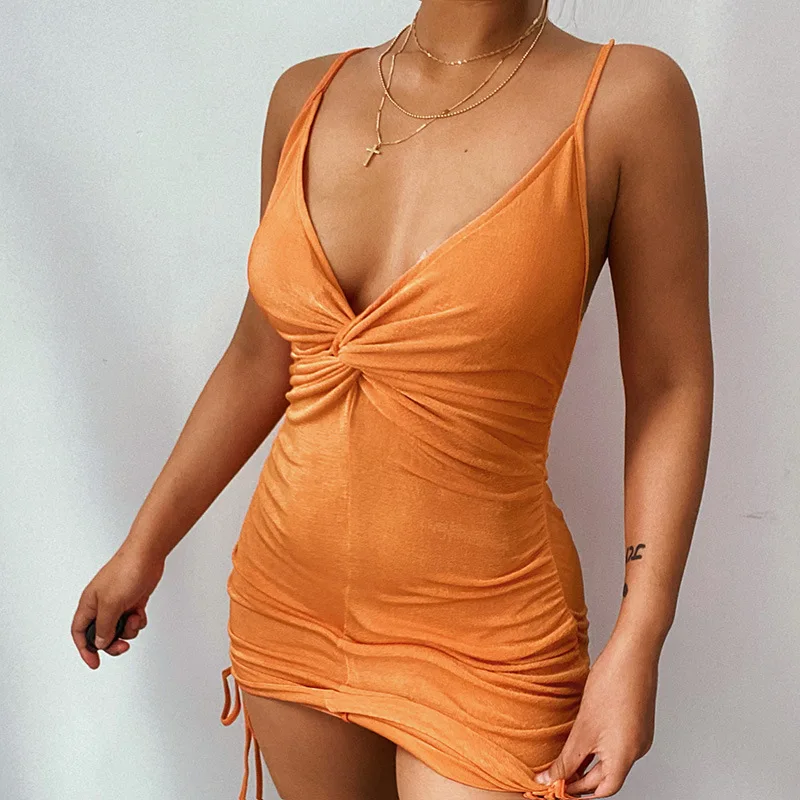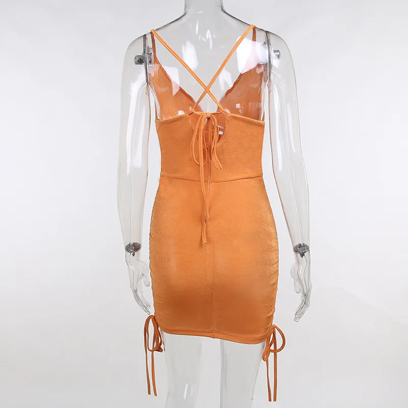 Spaghetti Strap Sexy Knitted Bodycon Mini Dresses Women Deep V Neck Backless Drawstring Party Club Short Dress Summer Vacation