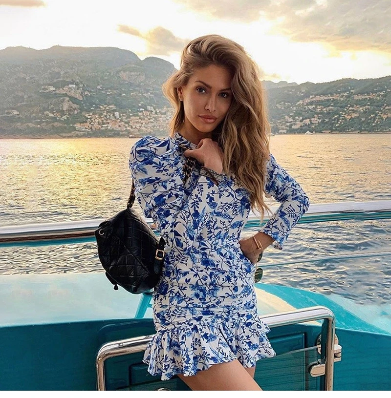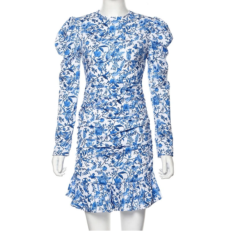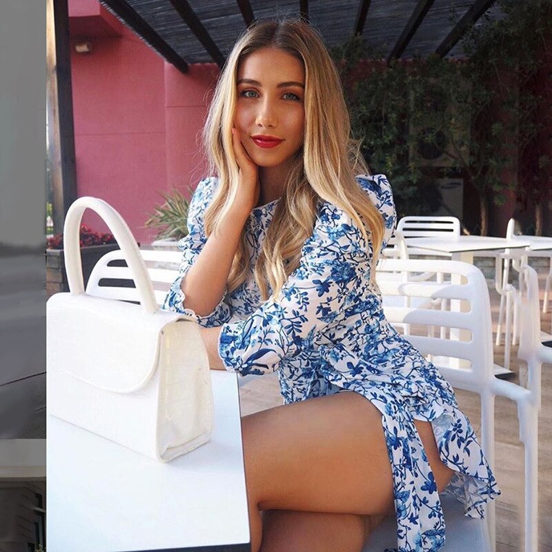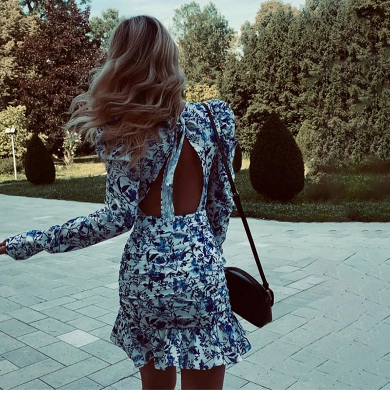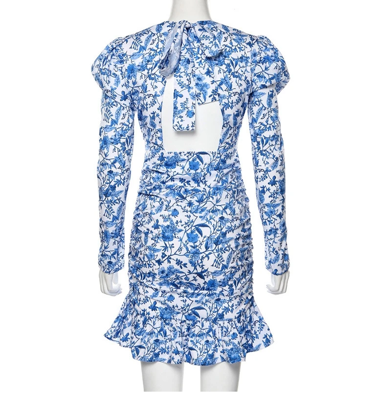 Spring Summer Sexy Short Floral Dress Women 2021 New Full Sleeve Backless Ruffles Mini Dress Ladies O Neck Print Hip Dresses