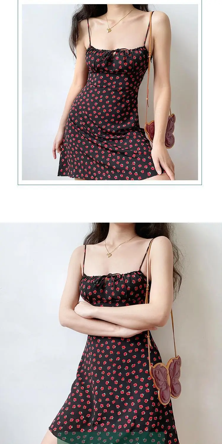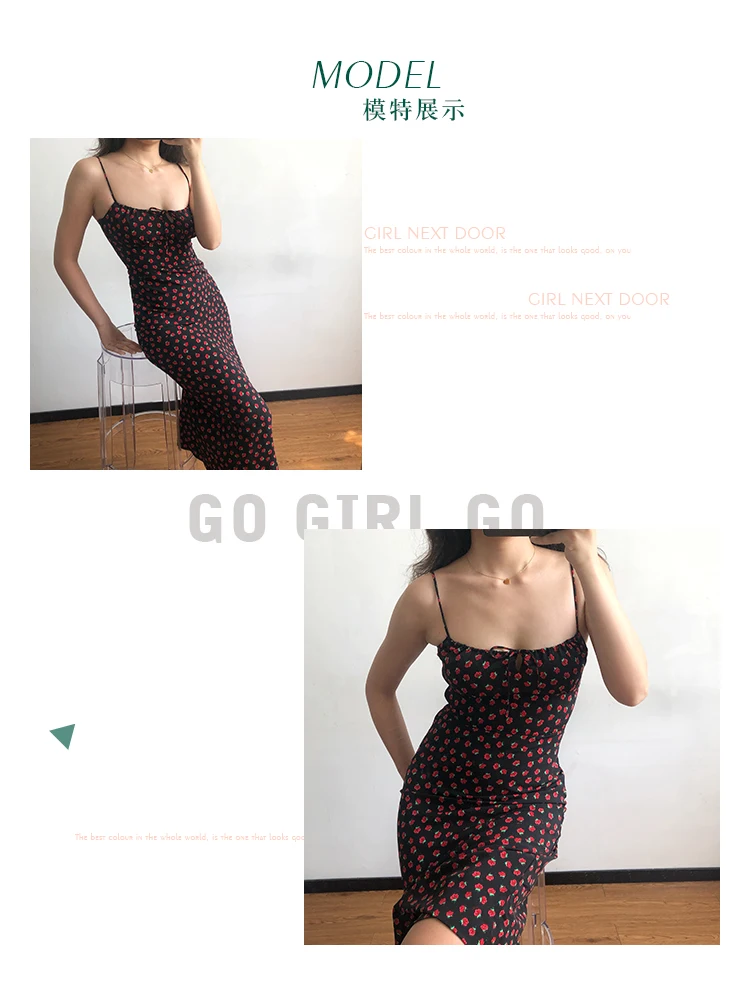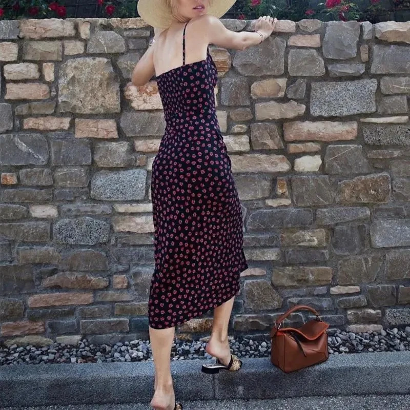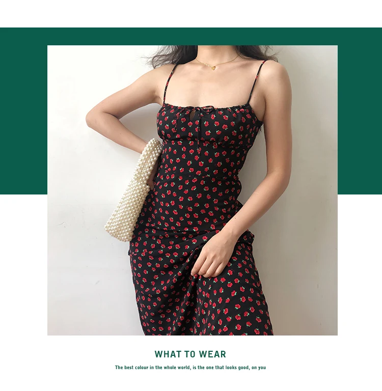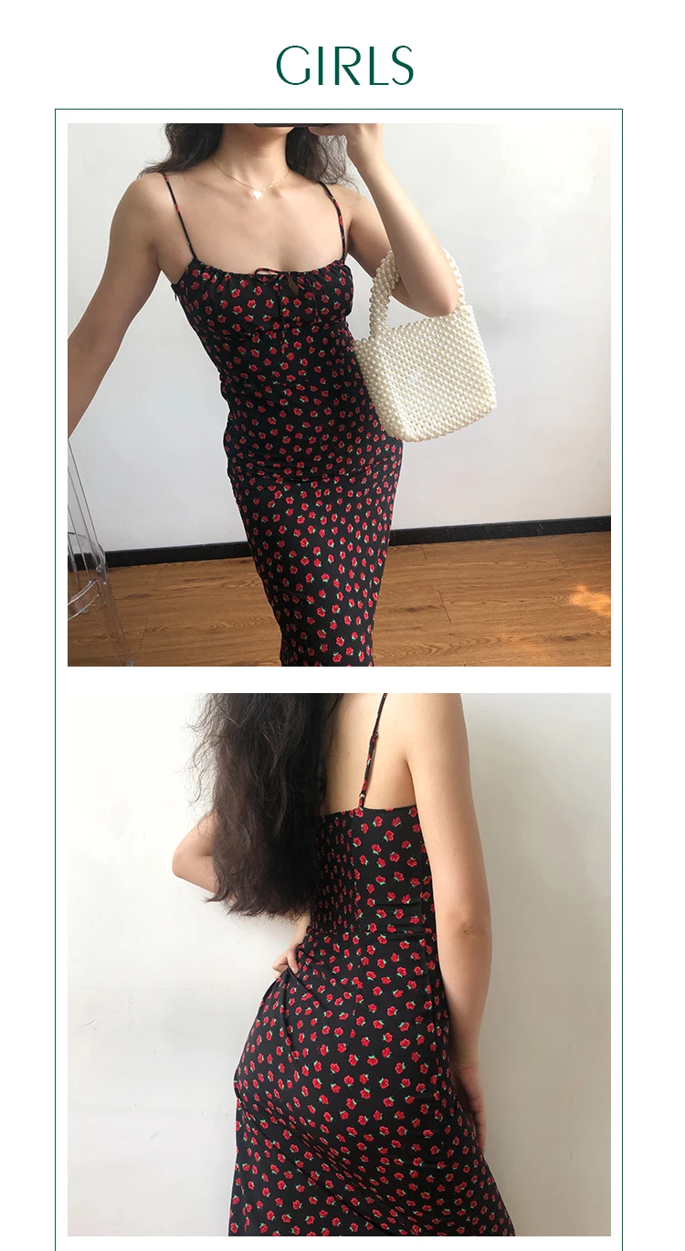 Summer Boho Red Strawberry Floral Print Spaghetti Strap Dress Women Black Elegant Sleeveless Sexy Beach Party Long Dresses 2021