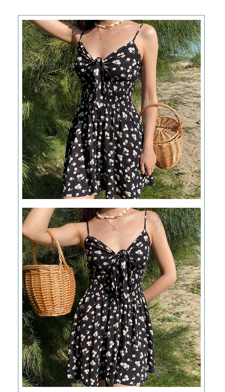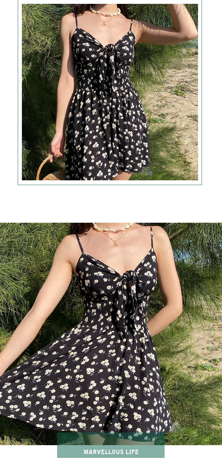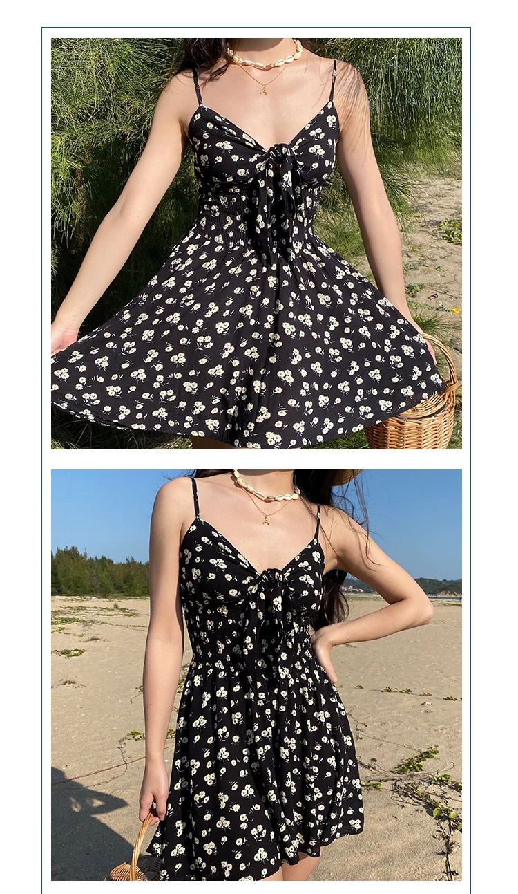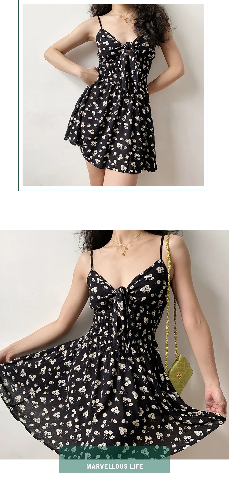 Summer Dress Retro Boho Women Tie Neck Floral Print Floral Mini Sexy Black Dress Elegant Spaghetti Straps Dresses Vestidos 2021