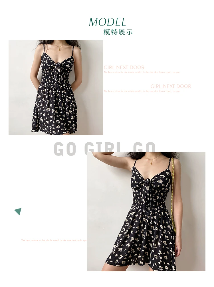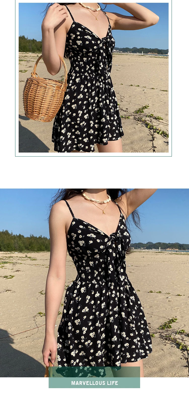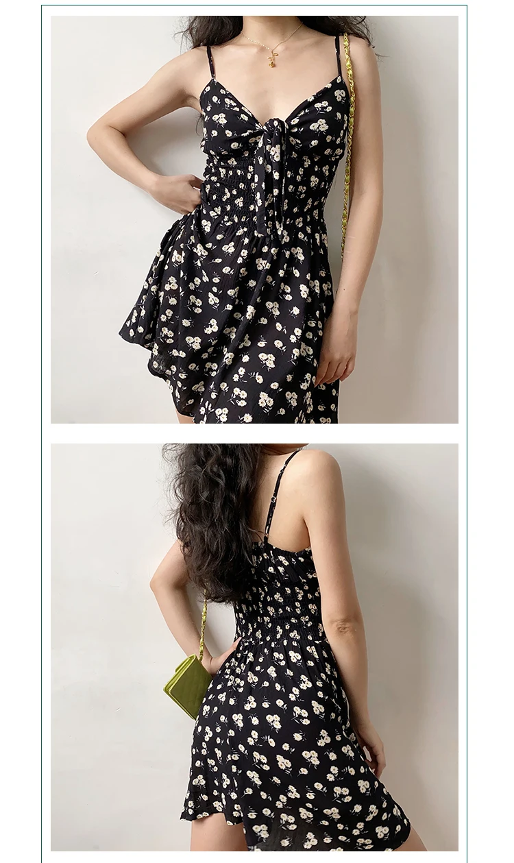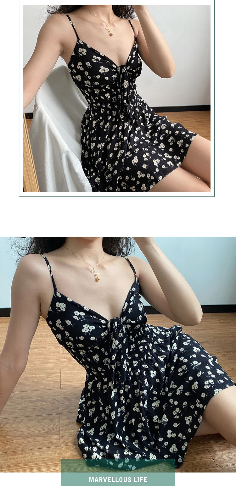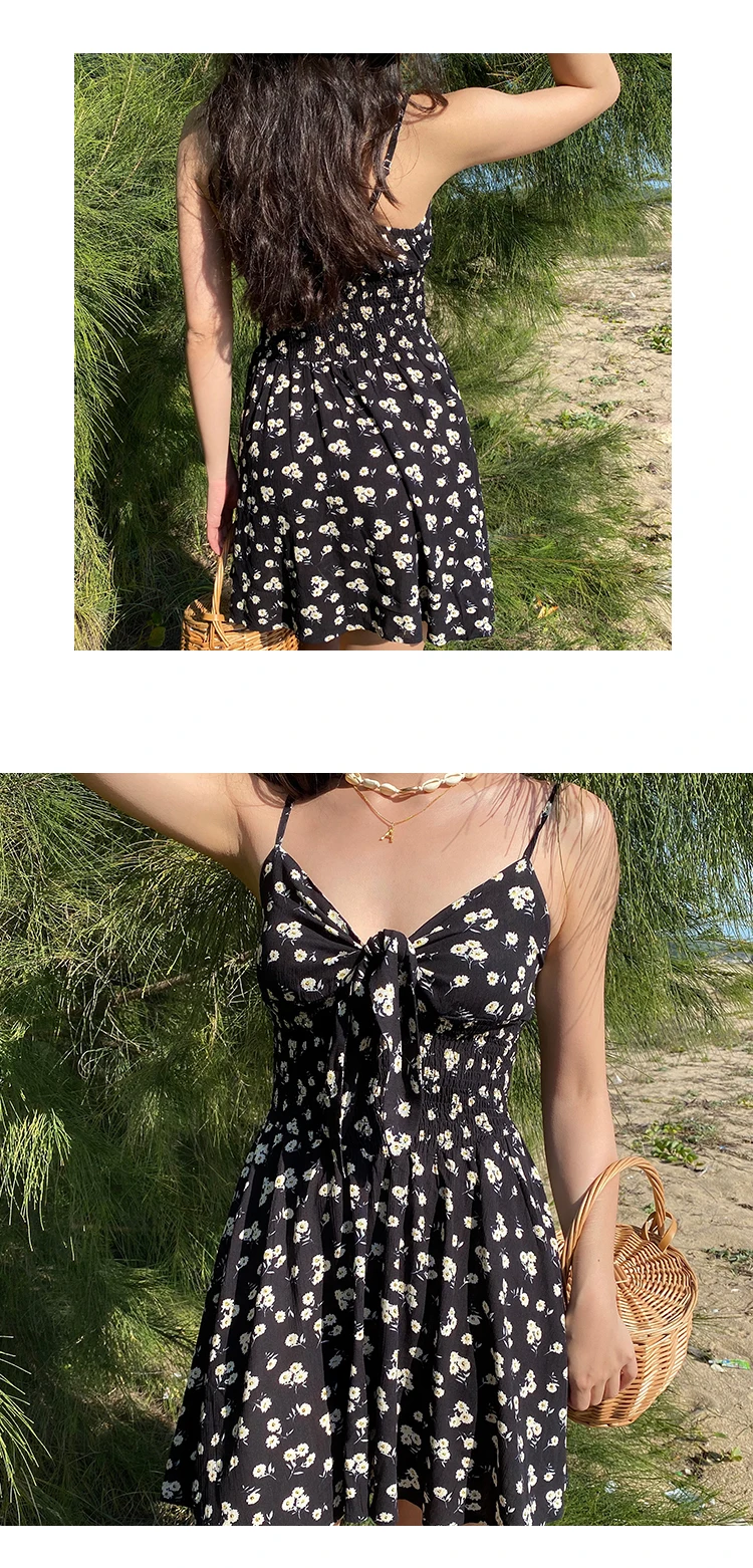 Summer Dress Retro Boho Women Tie Neck Floral Print Floral Mini Sexy Black Dress Elegant Spaghetti Straps Dresses Vestidos 2021