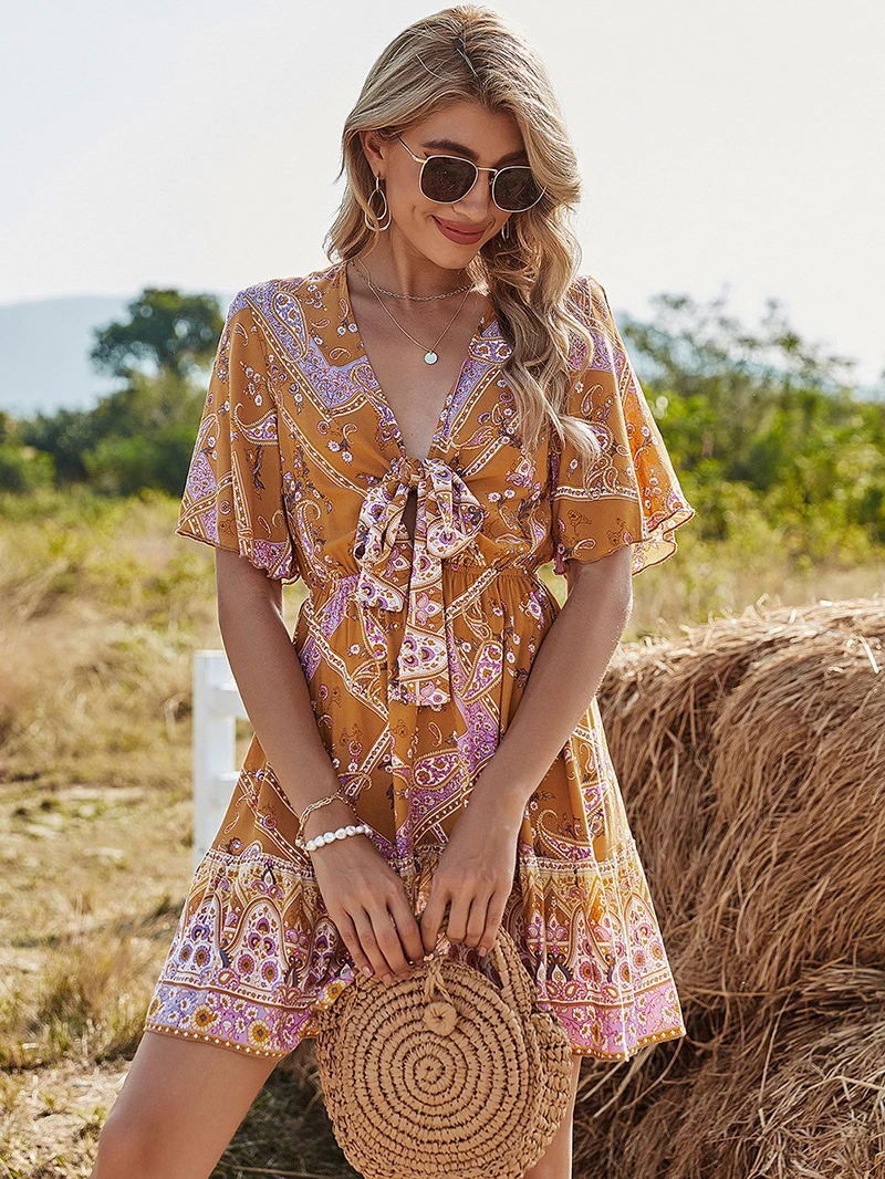 ♥This new summer dress bohemian party dress is decorated with small elastic bands and lace on the front, showing an elegant figure.