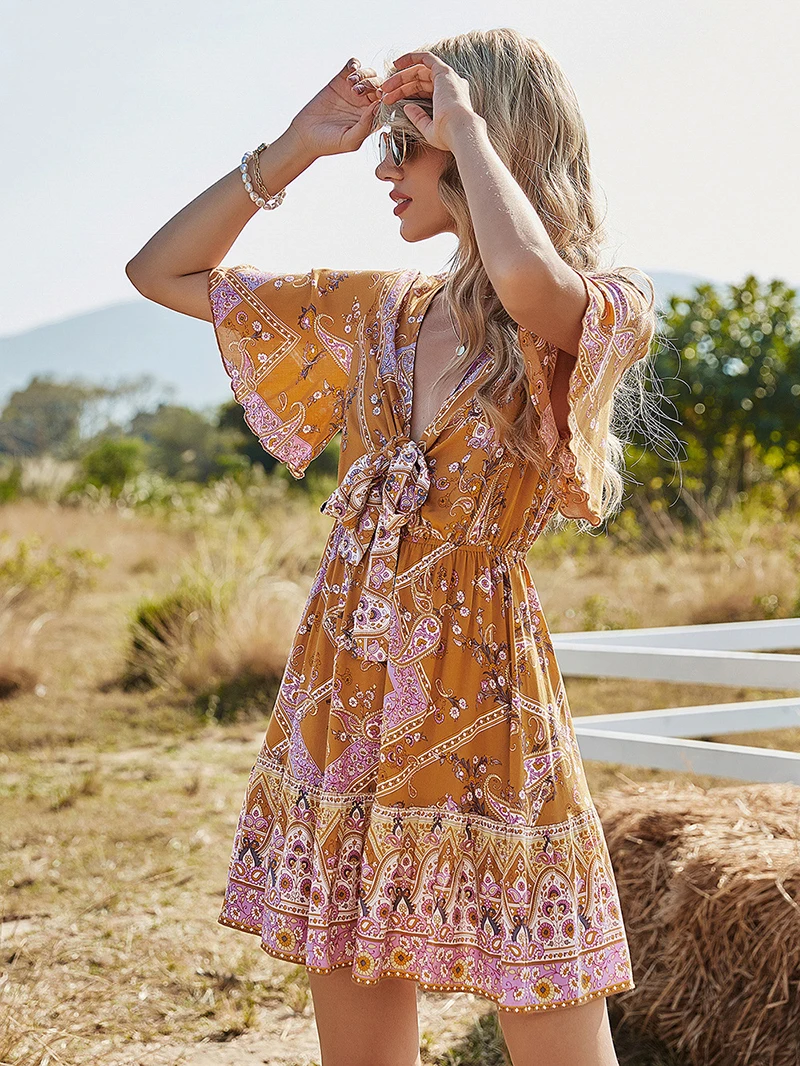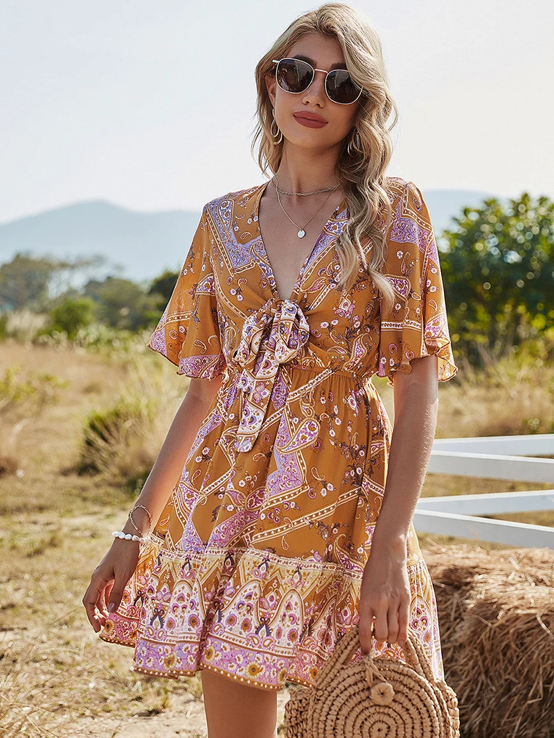 ♥Thisdressisdesignedwithfreshfloralprints,andthewaistisappearance.Features:Vneck,shortsleeved/half-sleeved, single-line flowing, floral mid-length dress.