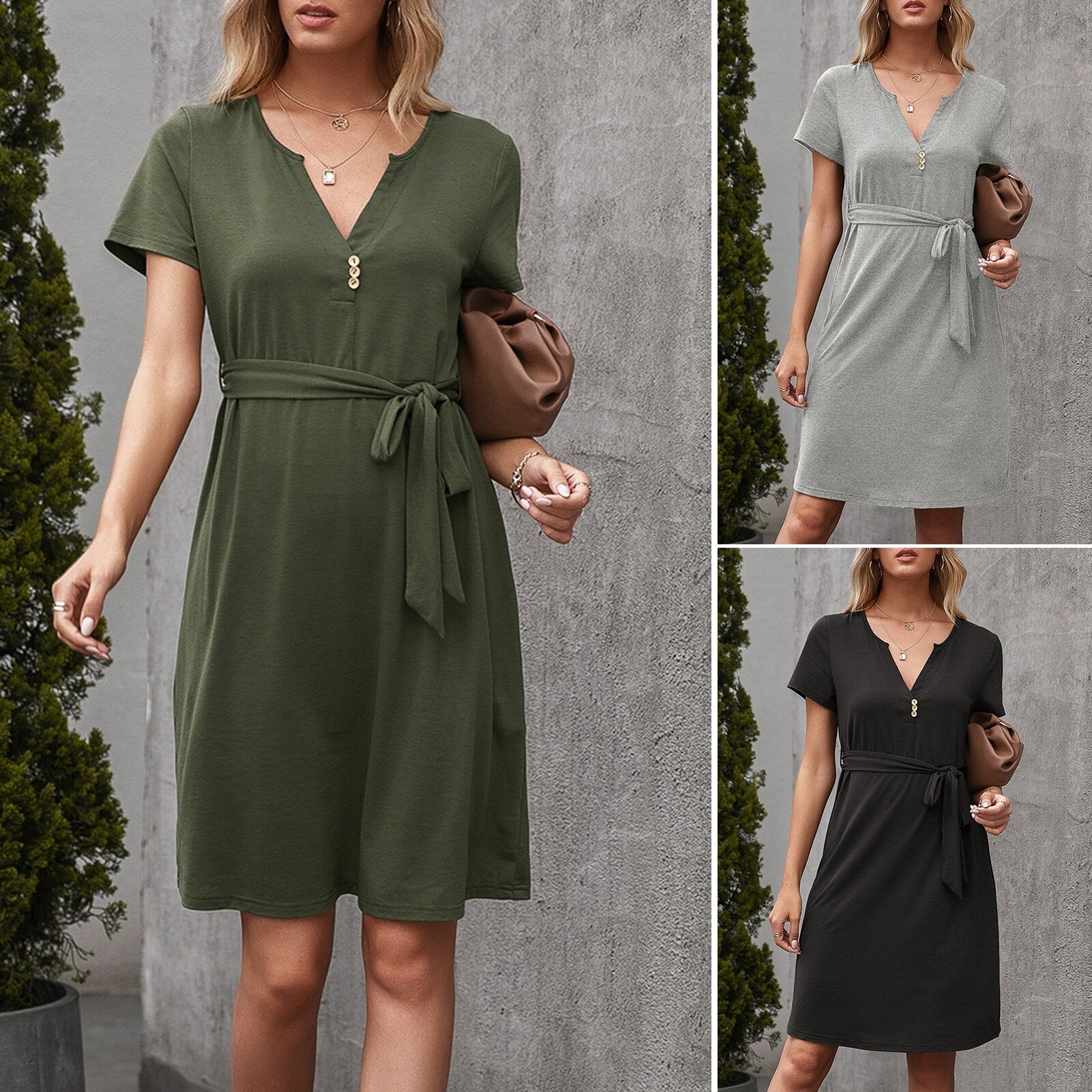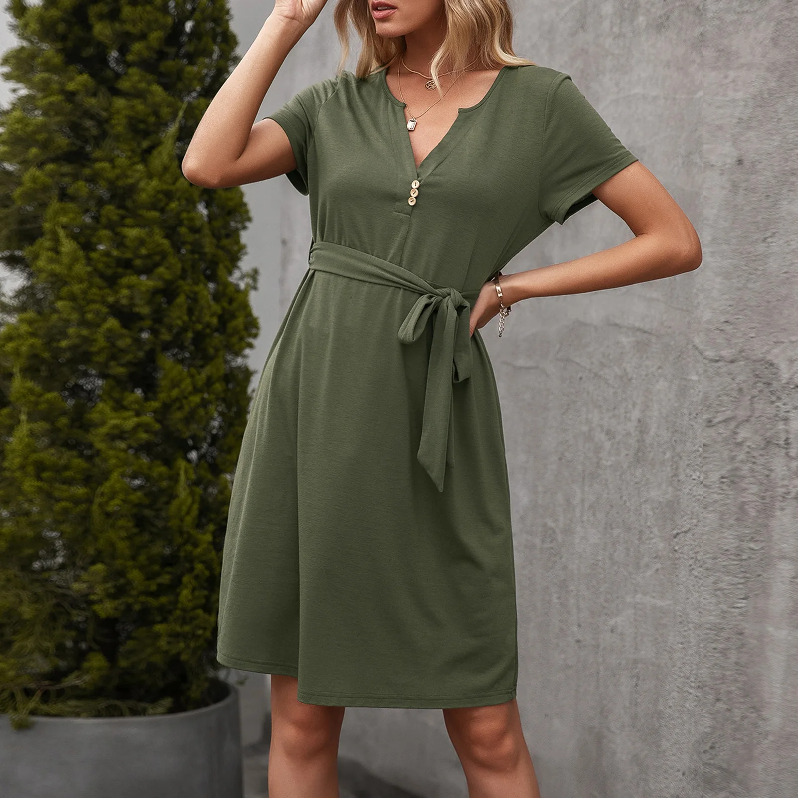 Solid shift dress with self-tie waist strap for streets and holiday. It has V neck, short sleeve and high waistline, bringing a chic and casual style for summer.