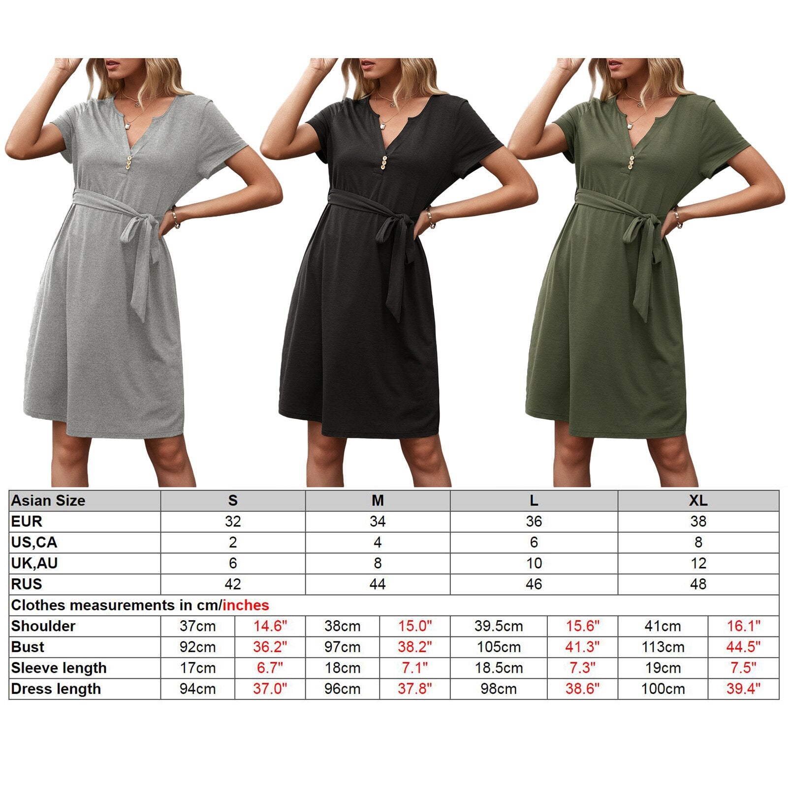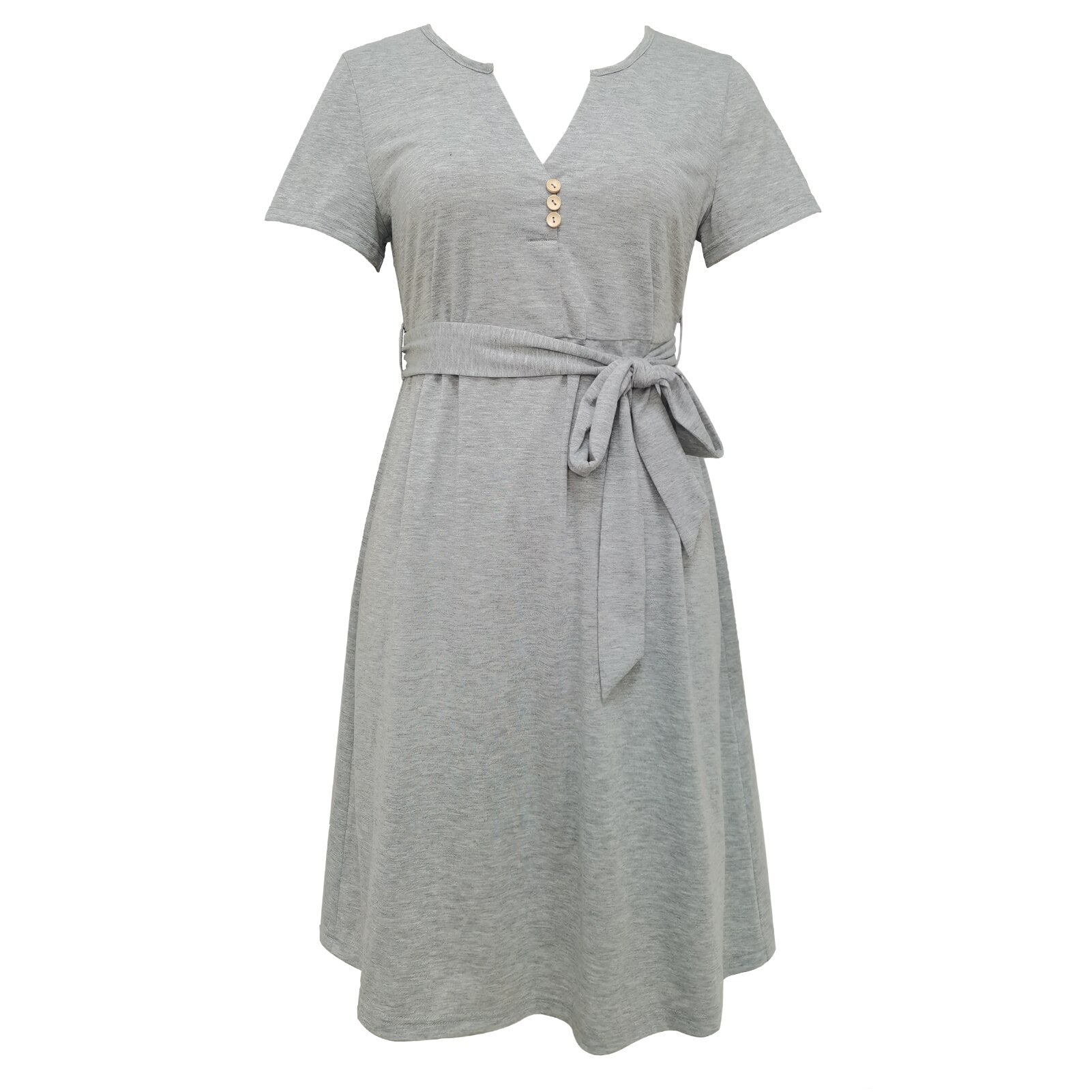 Solid finish with short sleeves, V-neck, and buttons decoration at the front.