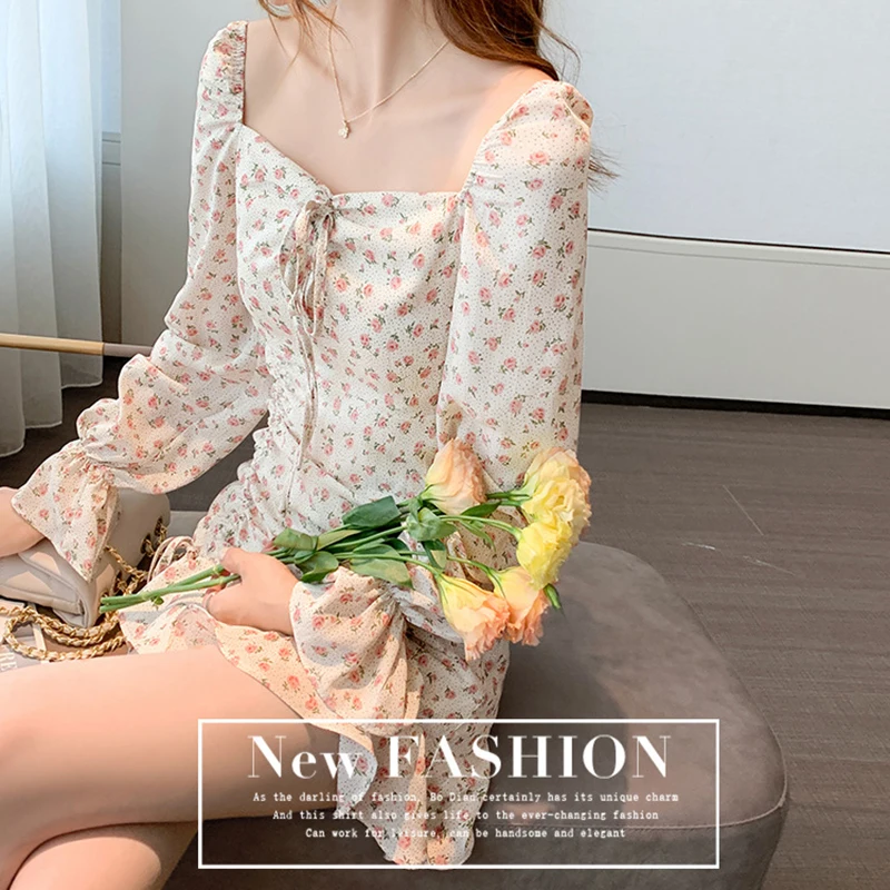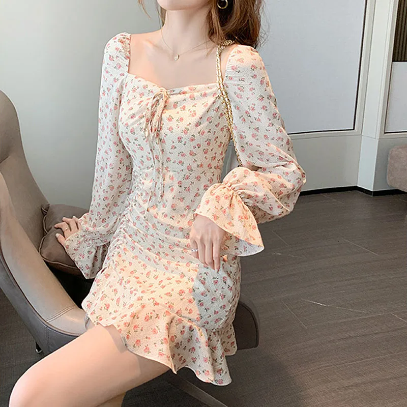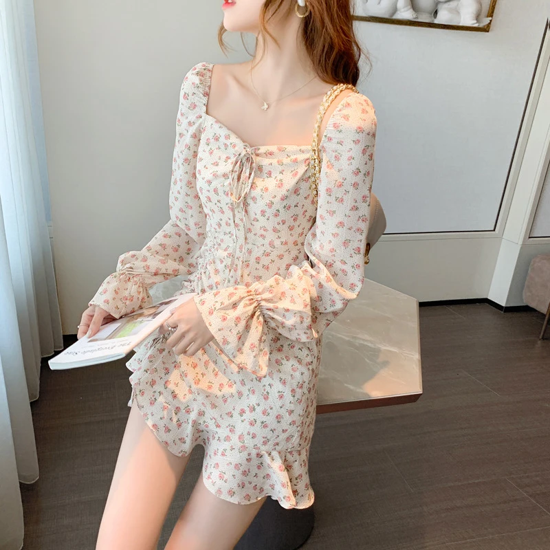 Women Retro Floral Dress Fashion French Fairy Gentle Chiffon Long-Sleeve Dresses Autumn Temperament Sexy Dress Short Skirt