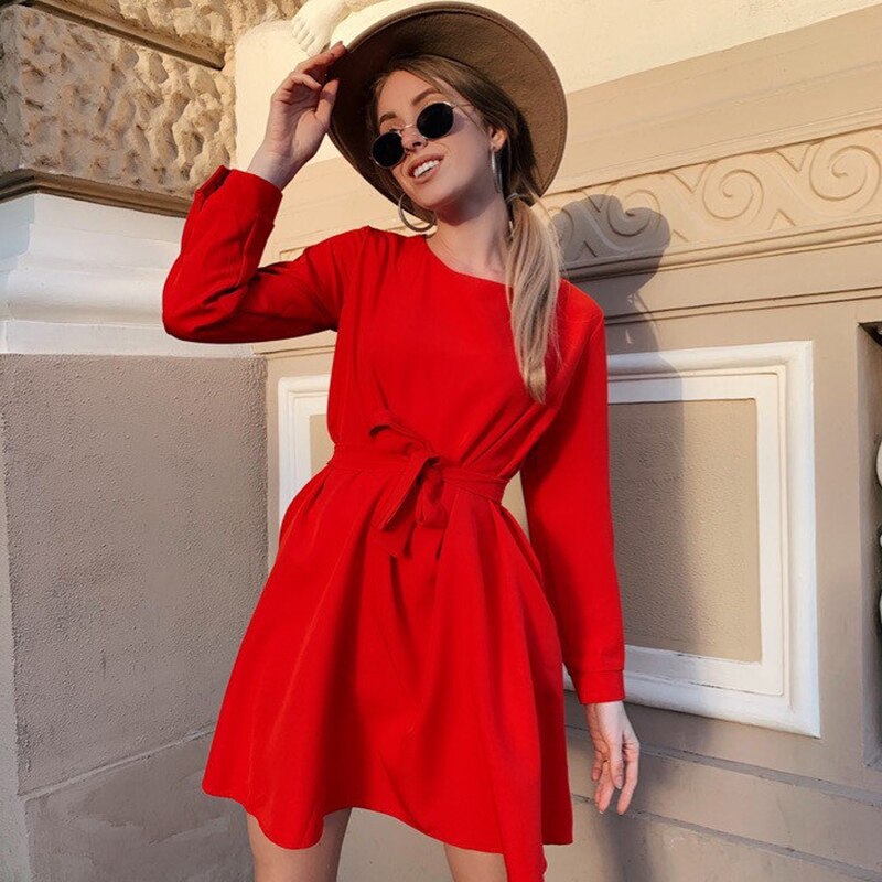 Women Sashes Mini A Line Dress Office Ladies O Neck Long Sleeve Dress 2021 Spring New Fashion Casual Solid Color Sweet Dresses