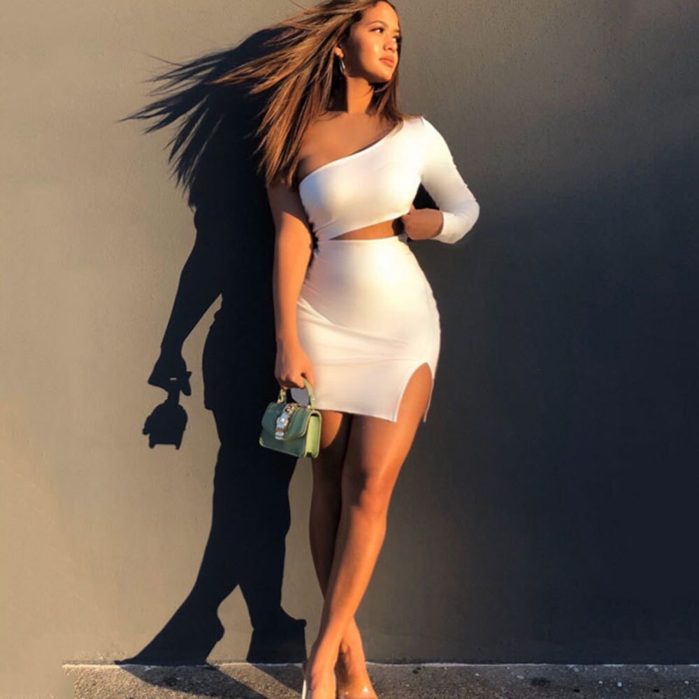 Women Sexy One Shoulder Hollow White Mini Summer Dress Fashion Solid Slit Bodycon Dresses For Women 2021 Club Vestido De Mujer