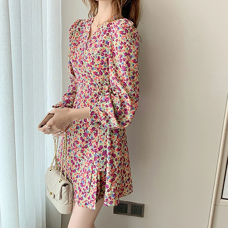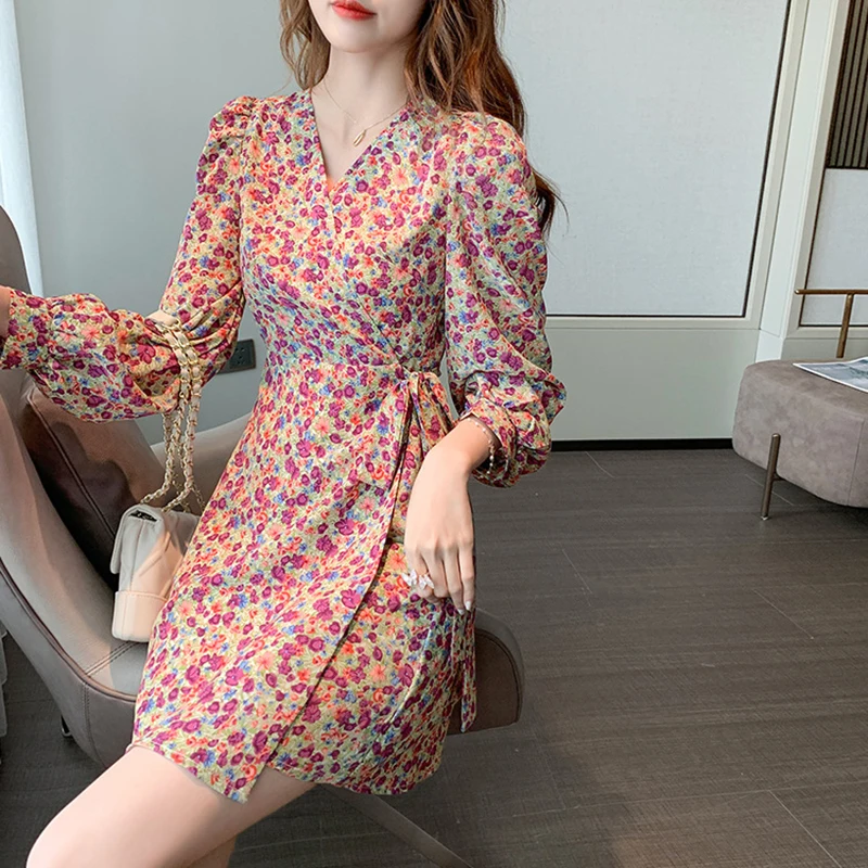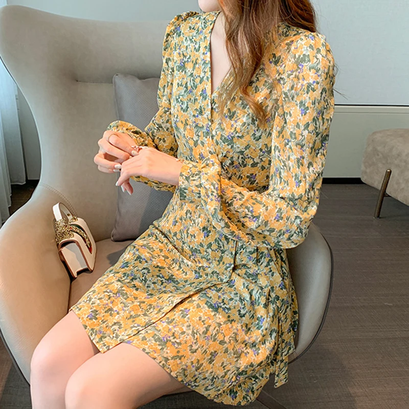 Women V-neck Floral Dress Chiffon Sweet Sexy Short Skirt Spring Autumn Fashion Temperament Dresses Korean Long-Sleeve Dress