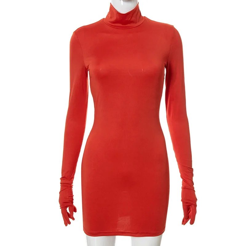 Y2K Elegant Red Long Sleeve with Gloves Solid Mini Dress Autumn Birthday Party Club Women's Bodycon Dresses Outfits