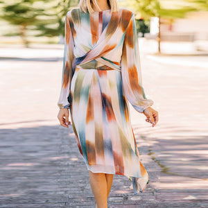 Fashion Elegant Striped Printed Lace-up Bohe Long Dress V-Neck Women Party Club Dress Casual Long Sleeve High Split Maxi Dresses  - Regular price