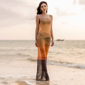 2022 Elegant Print Sexy Mesh Perspective Maxi Dress Club Party Outfits for Women Summer Sleeveless Dresses Casual Vacation