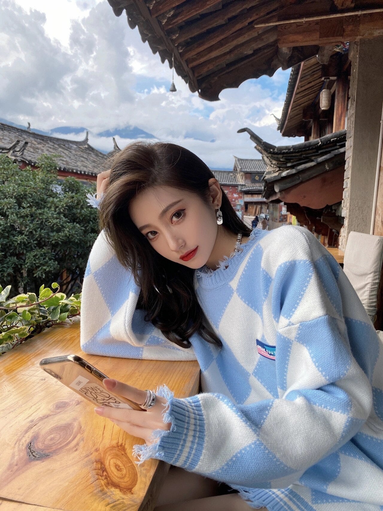 Blue Pink Kawaii Autumn Winter Sweater Women Plaid Ripped Knitted Jumpers Loose Long Sleeve Casual Pullovers Oversized Boyfriend