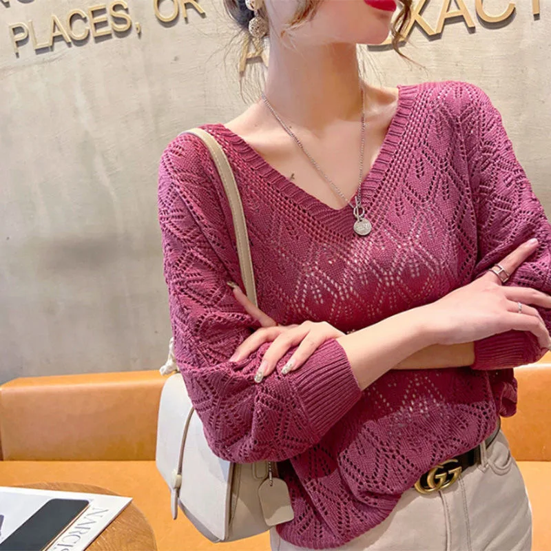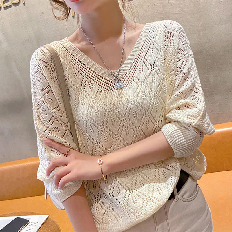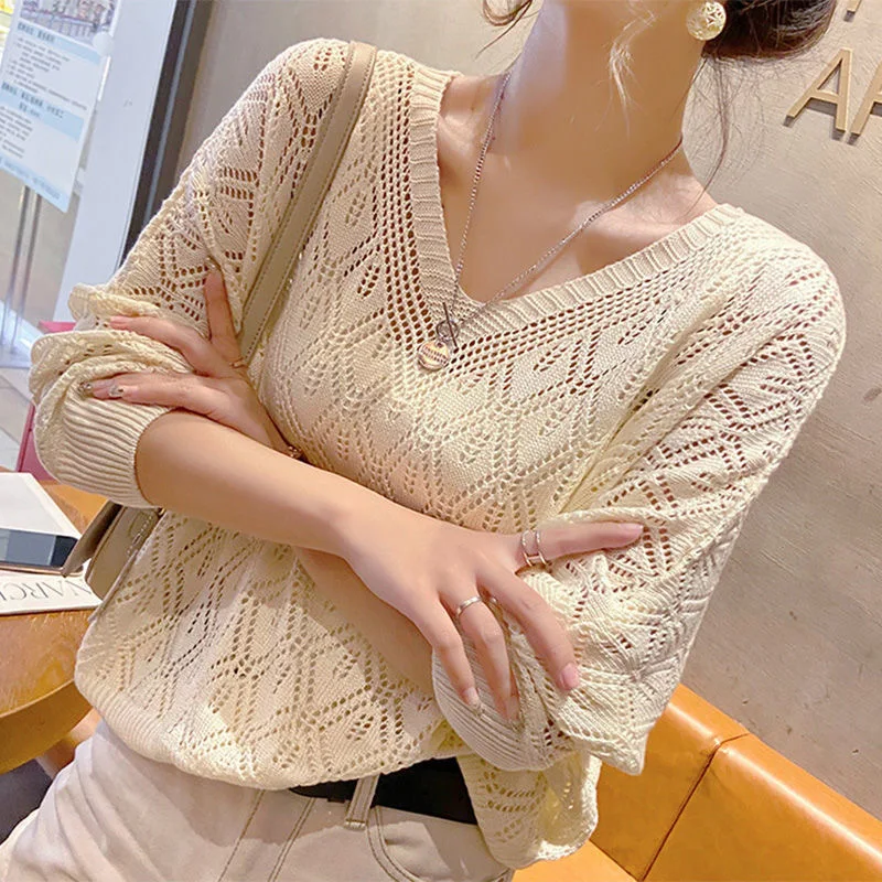 Casual V-neck Crocheted Hollow Knit Sweater Blouse For Women Long-sleeved Thin Autumn Loose Bat Sun Protection Shirt Short Top
