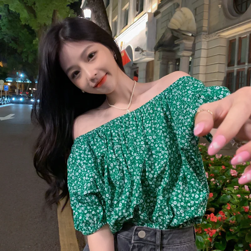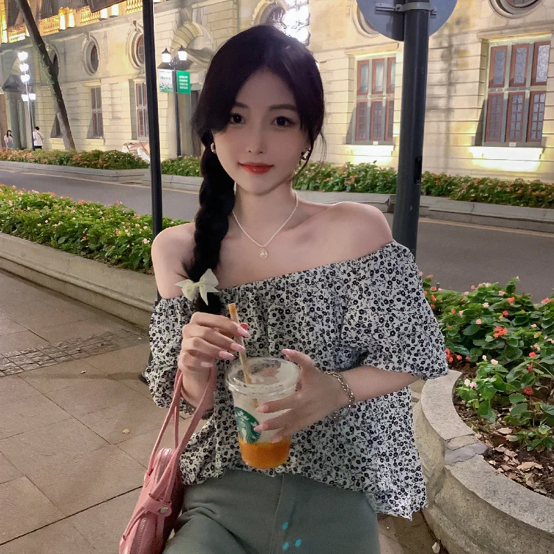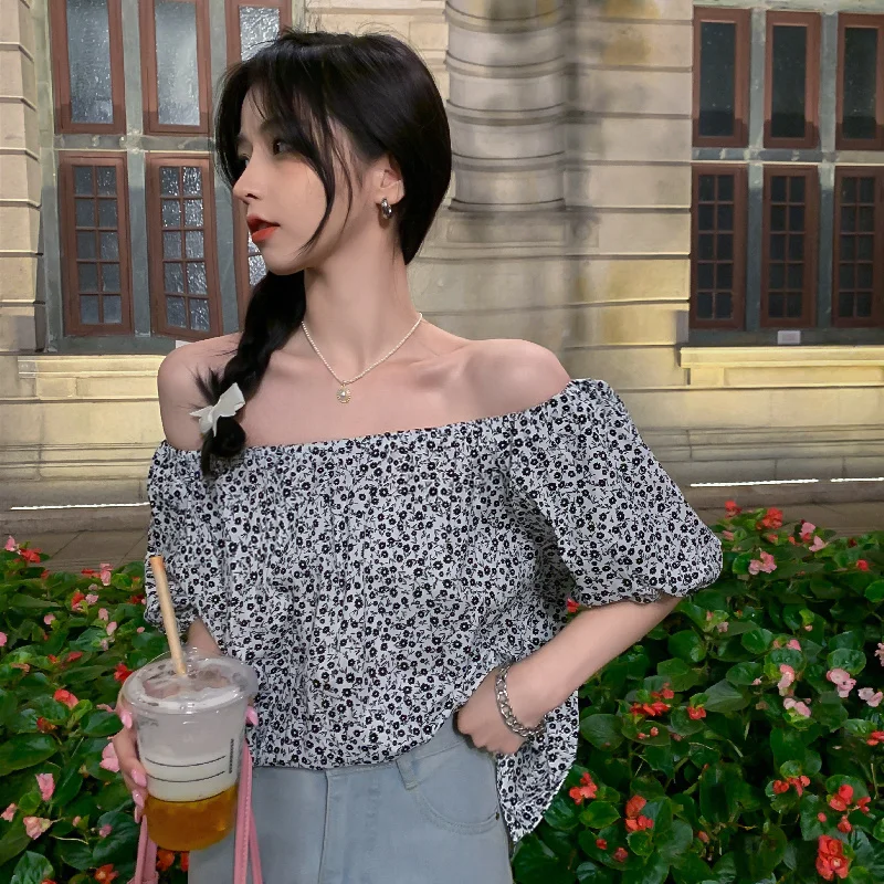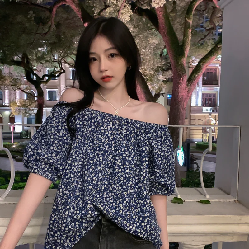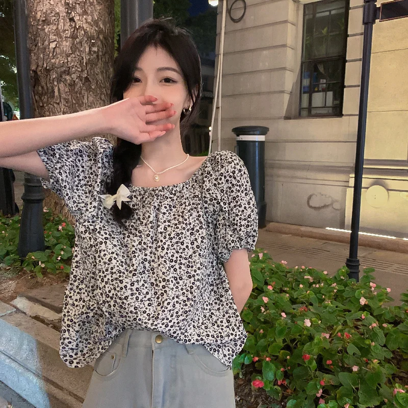 Chiffon Retro French Floral Collar Design Sensibility Blouse Women Fashion Summer Short Sleeve Tee Sexy Sweet Korean Style Cloth