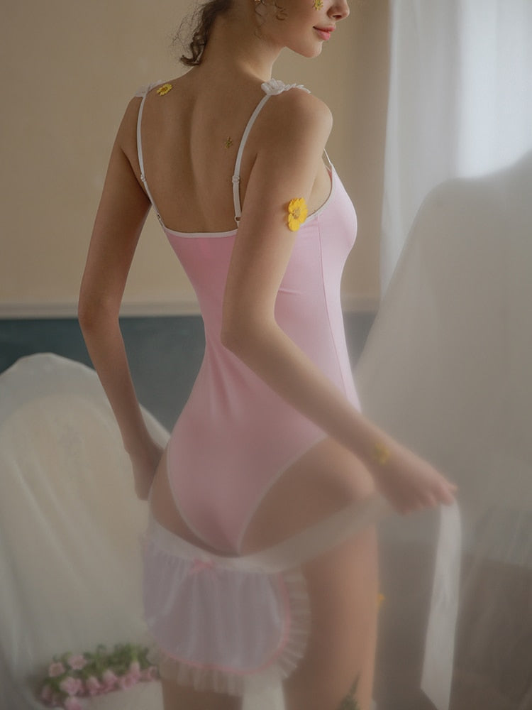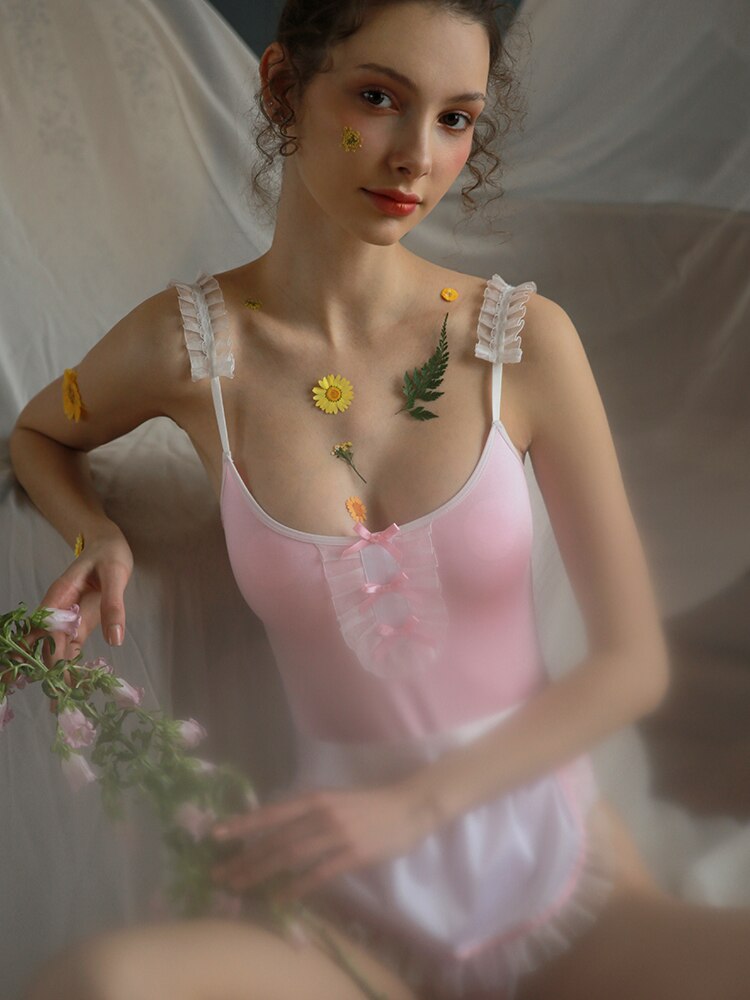 Cute Pink Maid Uniforms Sexy Lace Sling Leotard with Ruffles Aprons Women Rabbit Bunny Cosplay Costume Erotic Lingerie Outfit
