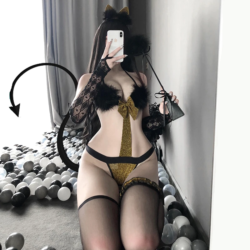 Package includes: Kitty Headband + Collar with bell+ Bra and panties set