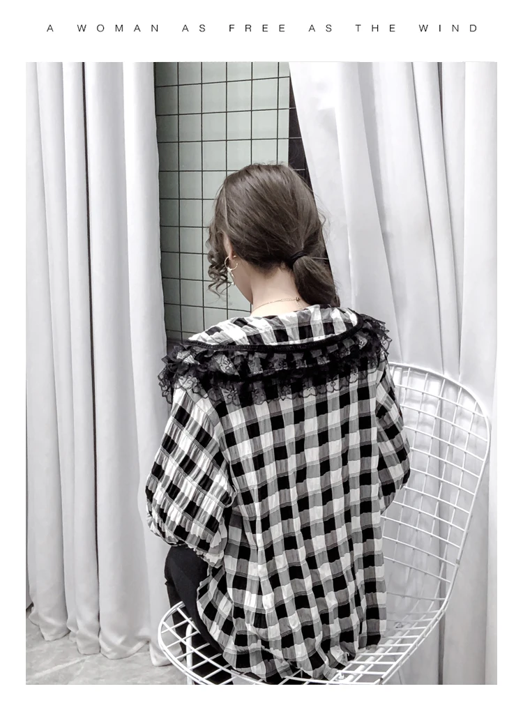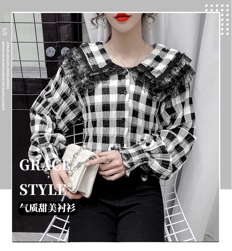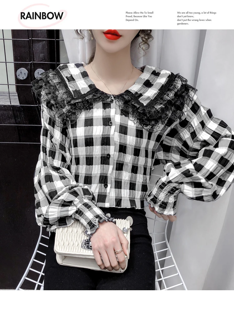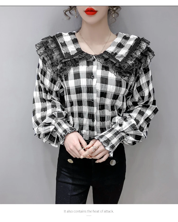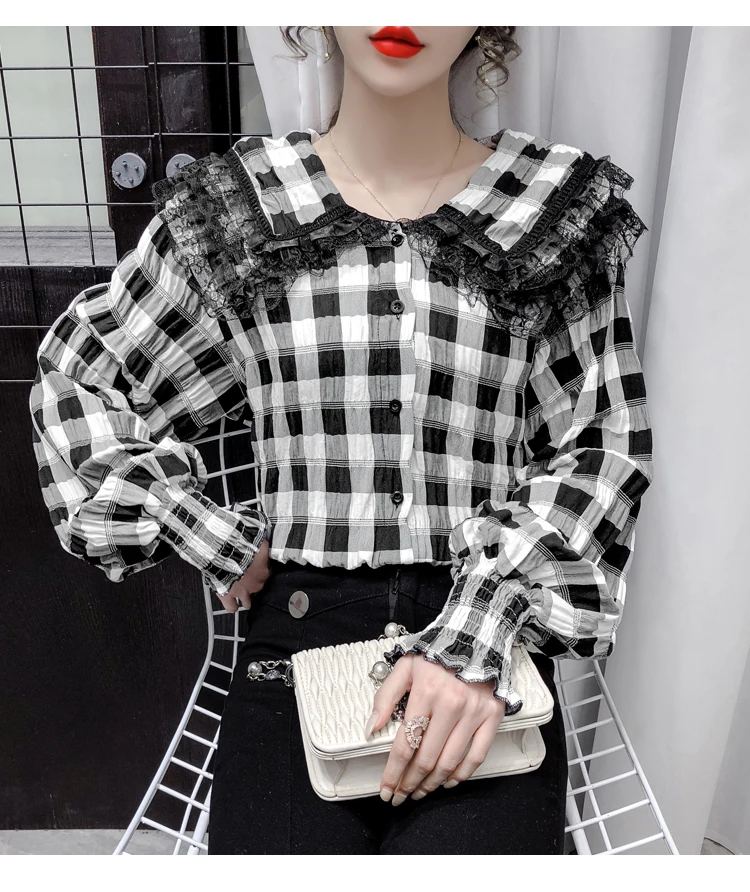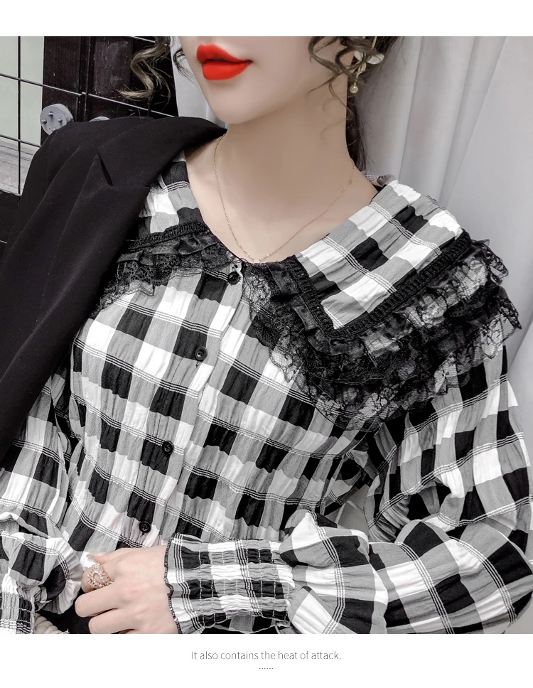 Doll Collar Plaid Lace Shirt New 2021 Spring Long Sleeve Women's Blouse Shirt Elegant Slim Office Lady Tops Blusas