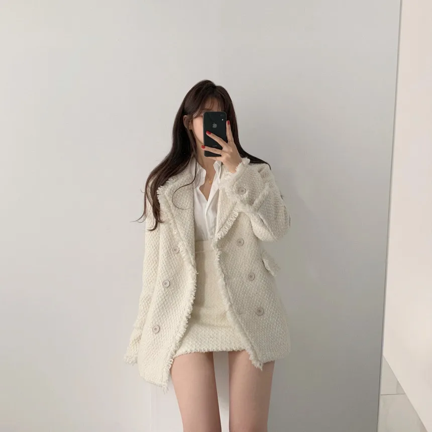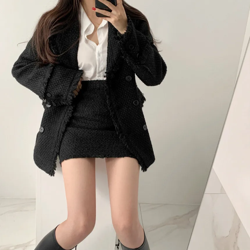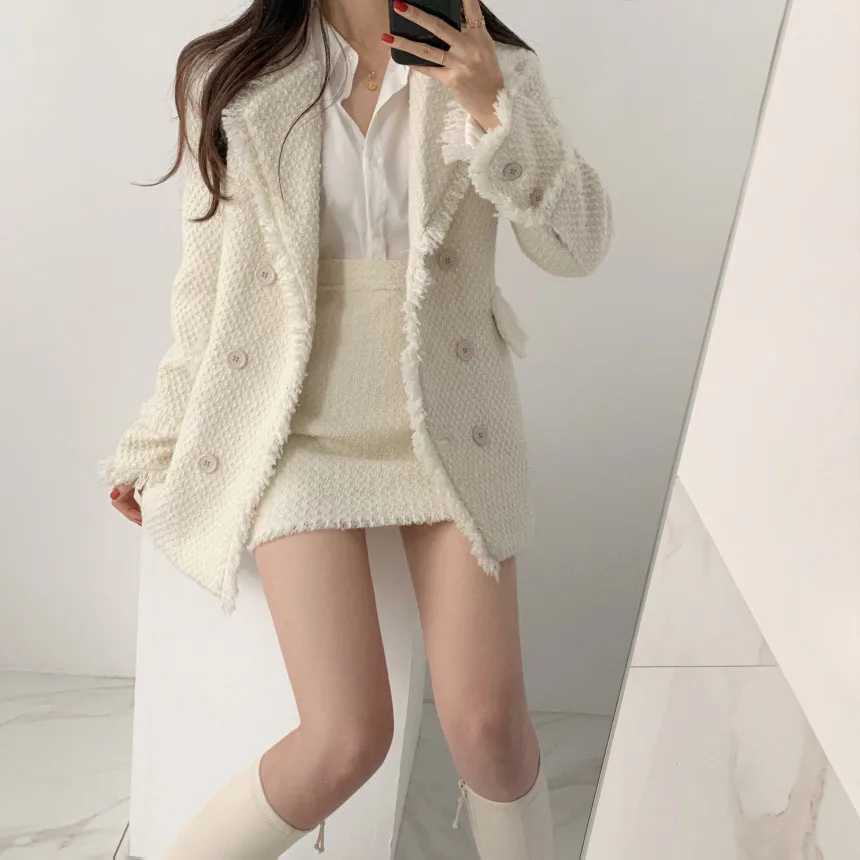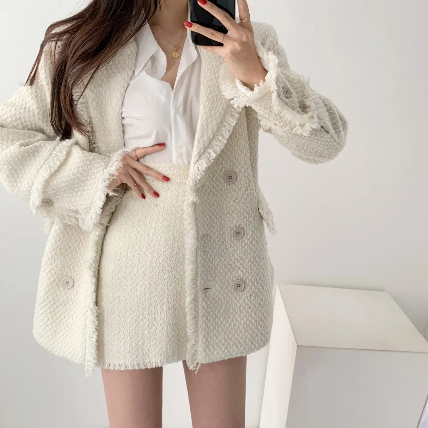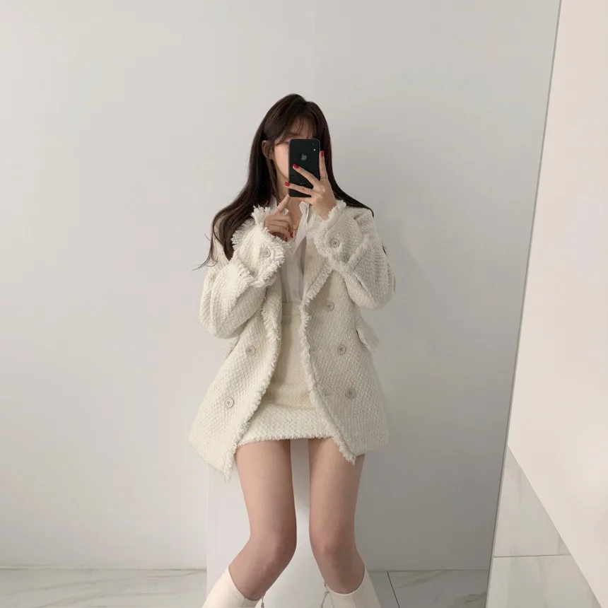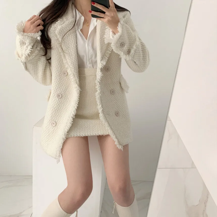 Fall Clothes For Women 2 Piece Outfits Fashion Set Female Chic Retro Double-breasted Furry Thicken Coat Tweed Coat Skirt OL Set