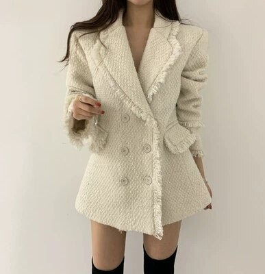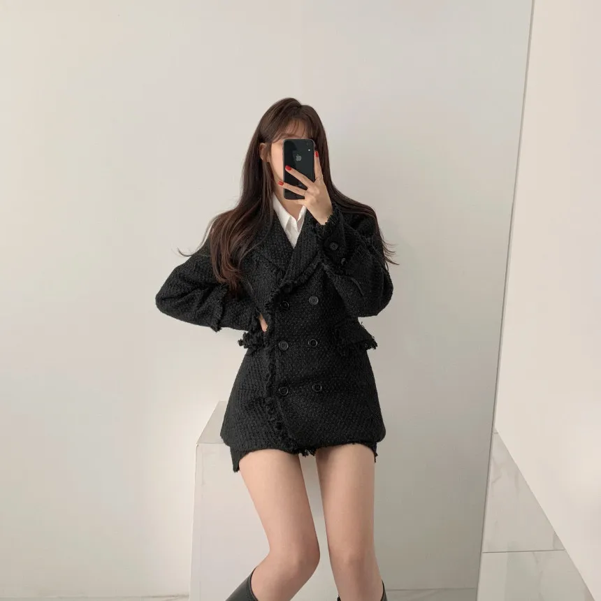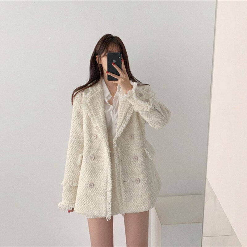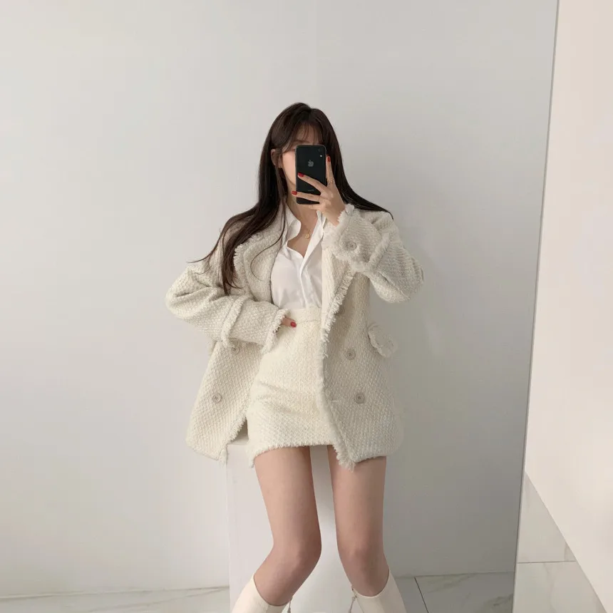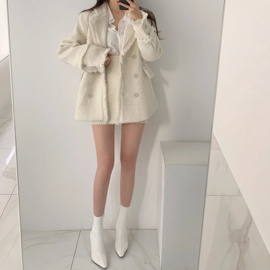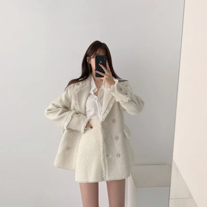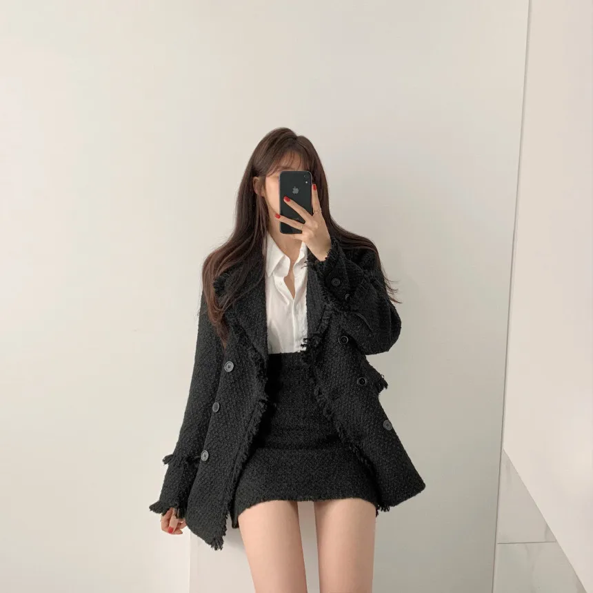 Fall Clothes For Women 2 Piece Outfits Fashion Set Female Chic Retro Double-breasted Furry Thicken Coat Tweed Coat Skirt OL Set