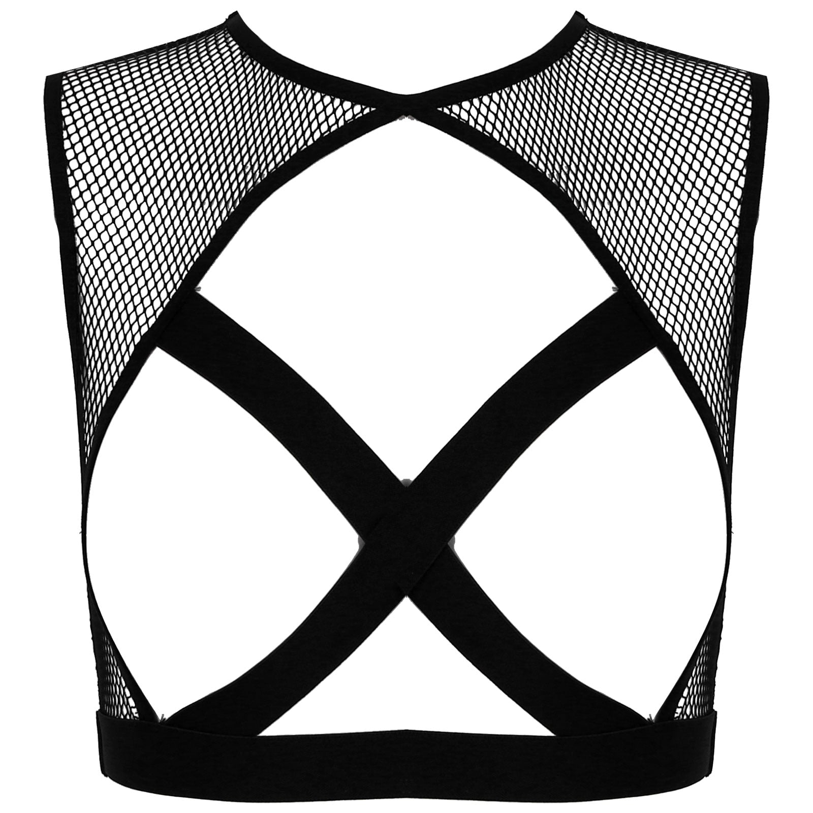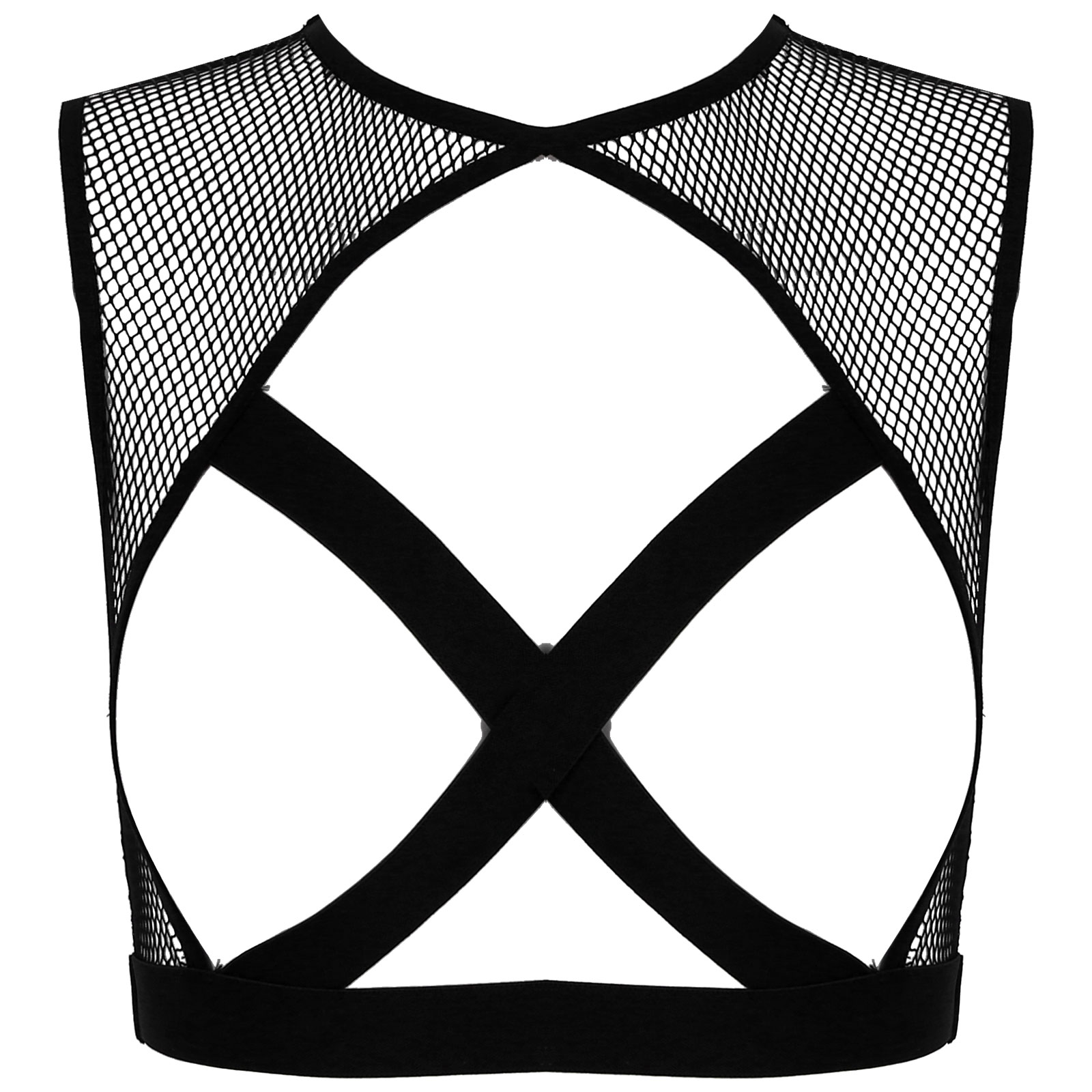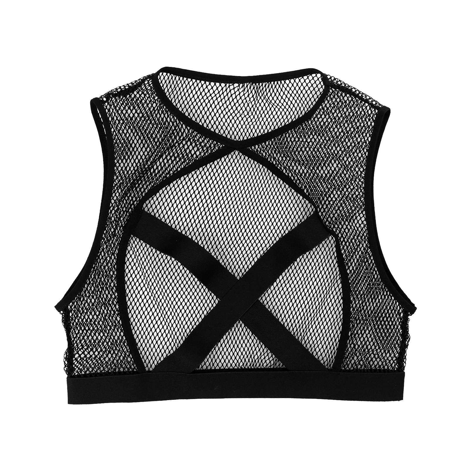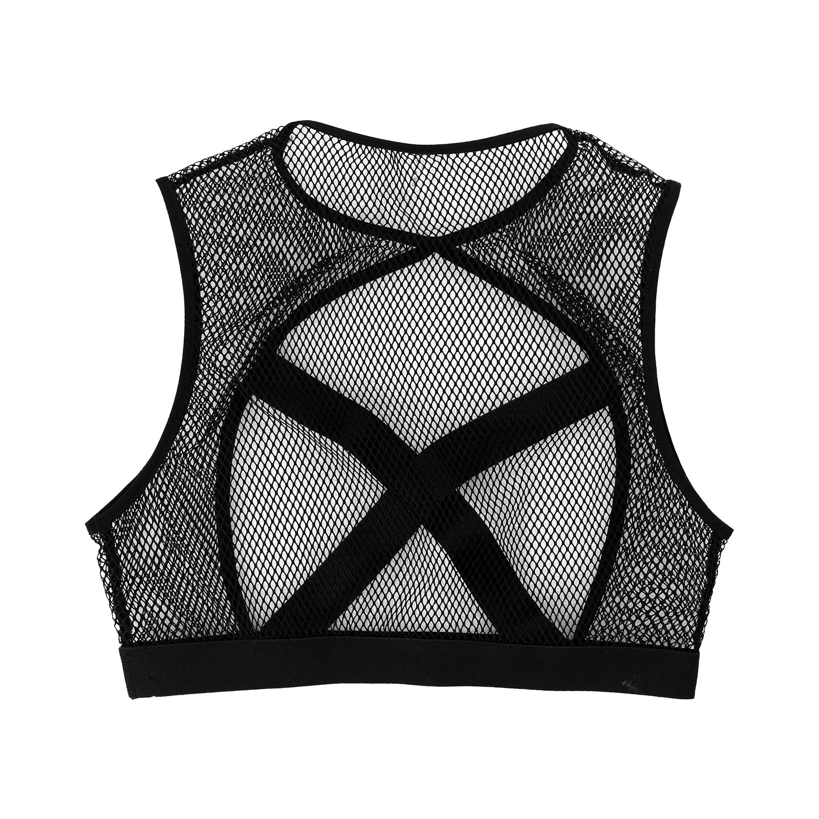 Featuring with hollow out fishnet, sleeveless, elastic crisscross front details, cropped length.