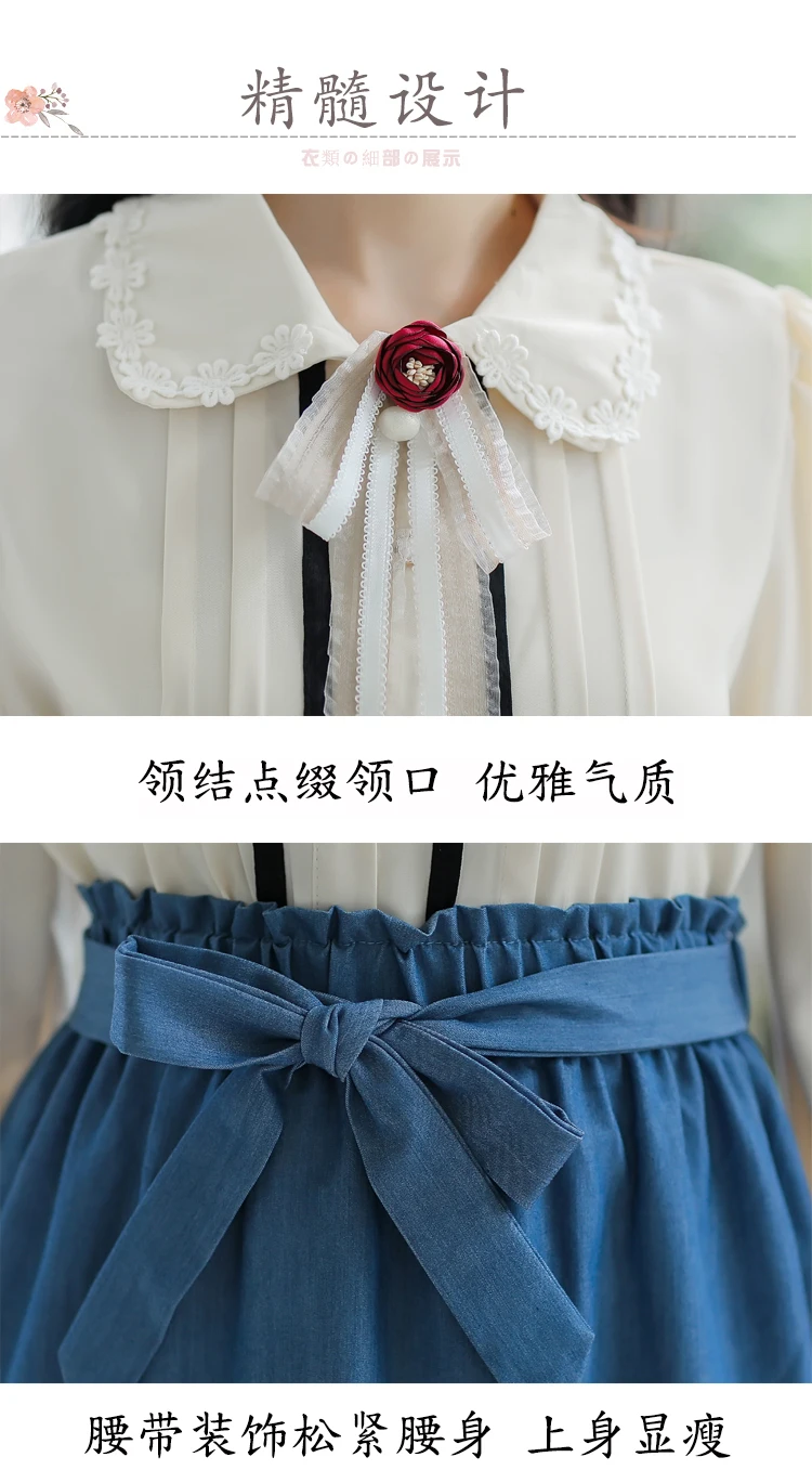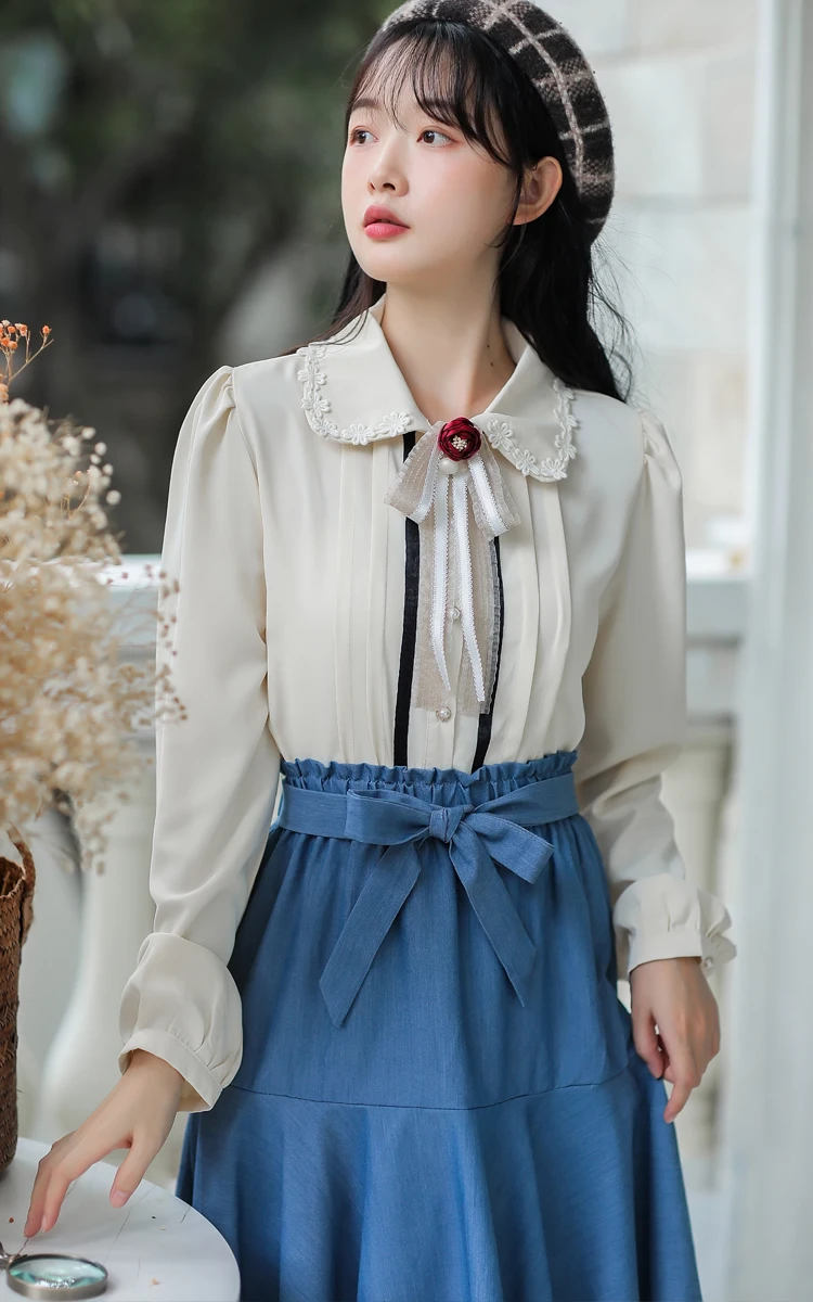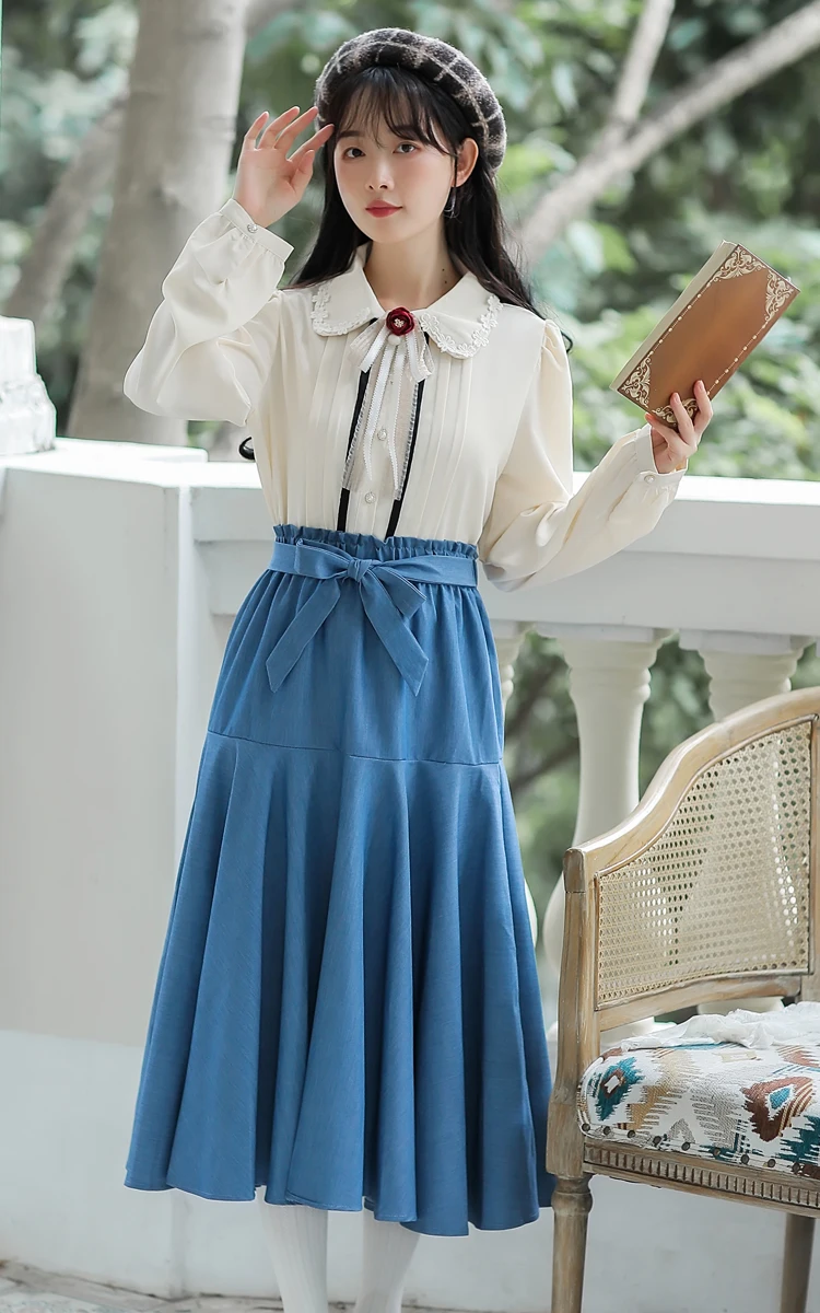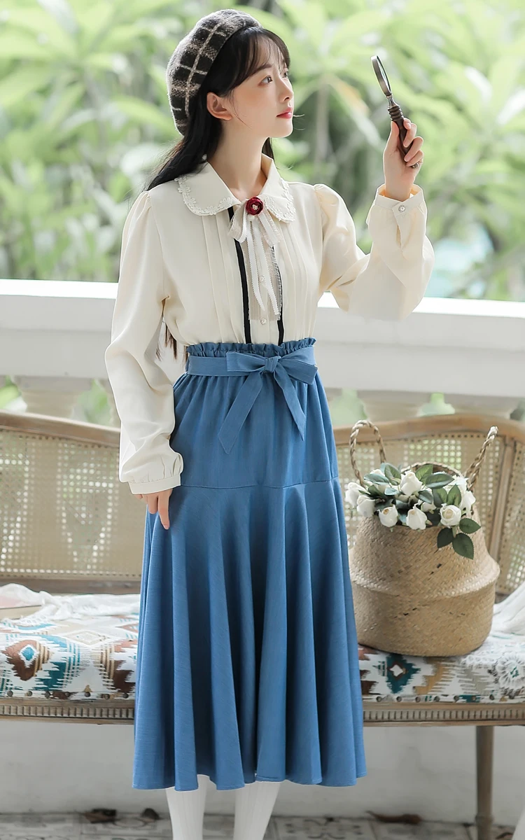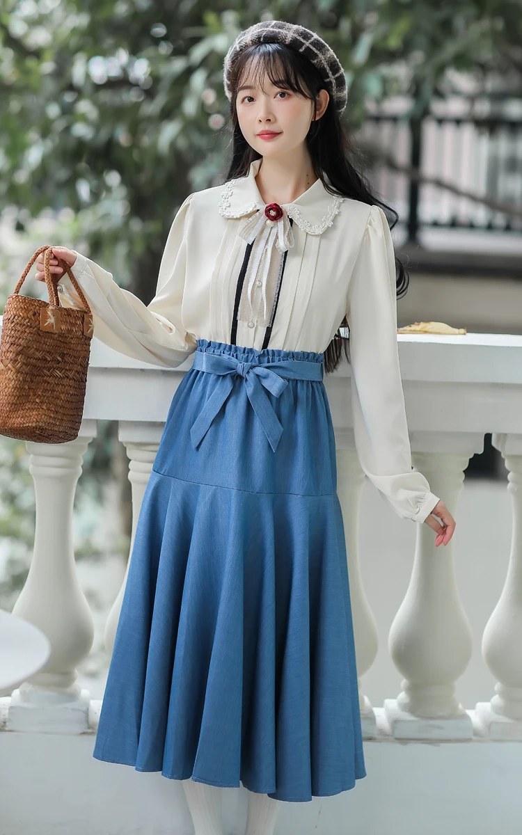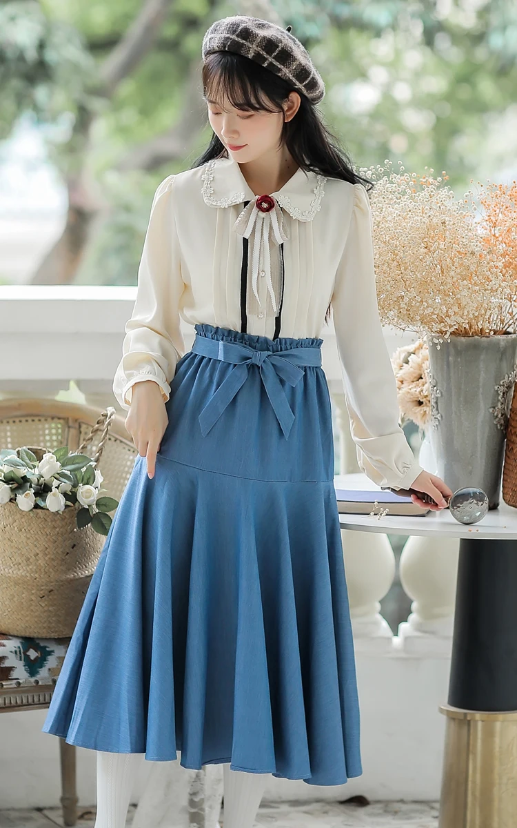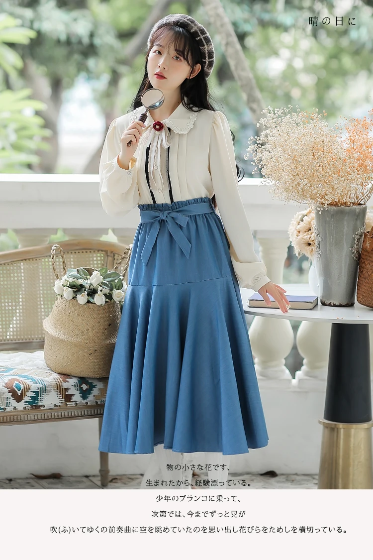 French Elegant Shirt Skirt Suit Fall Female Flowers Bow Chic Doll Collar Cute Blouse+Blue Bow Bandage Skirt 2 Piece Set Women