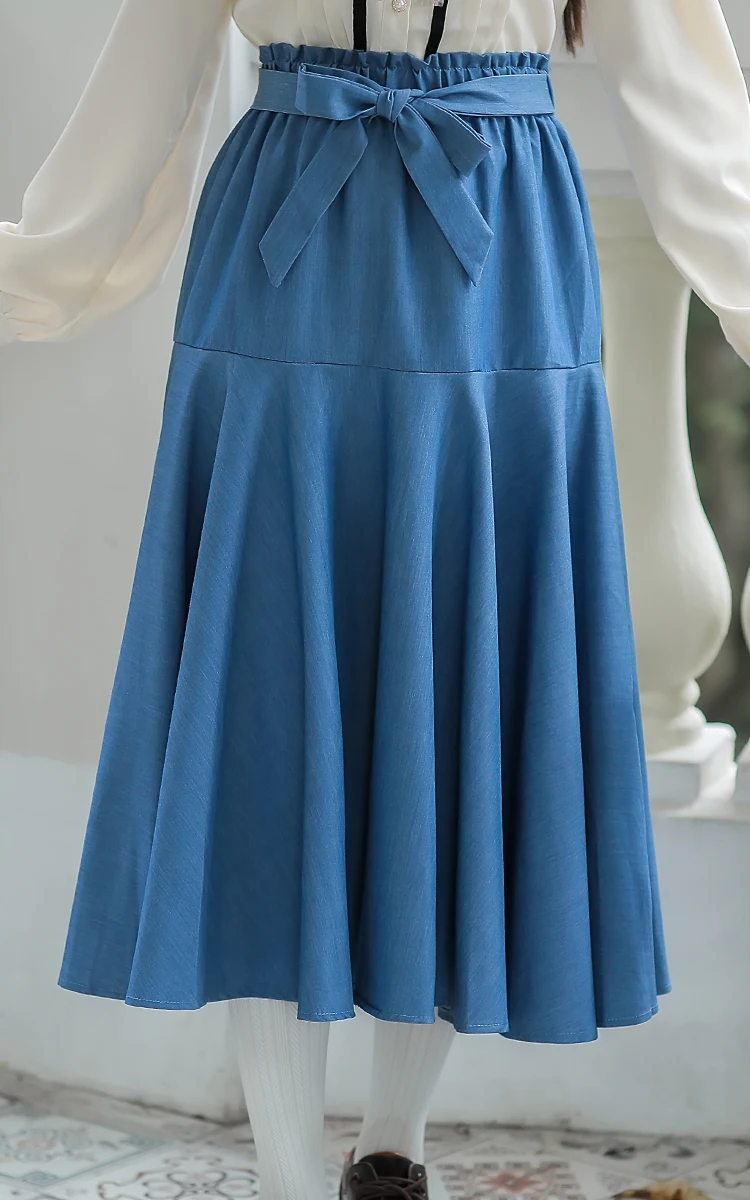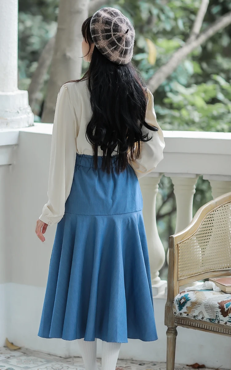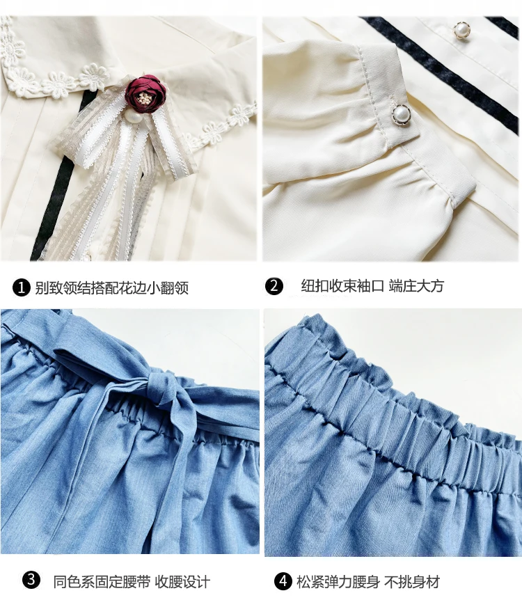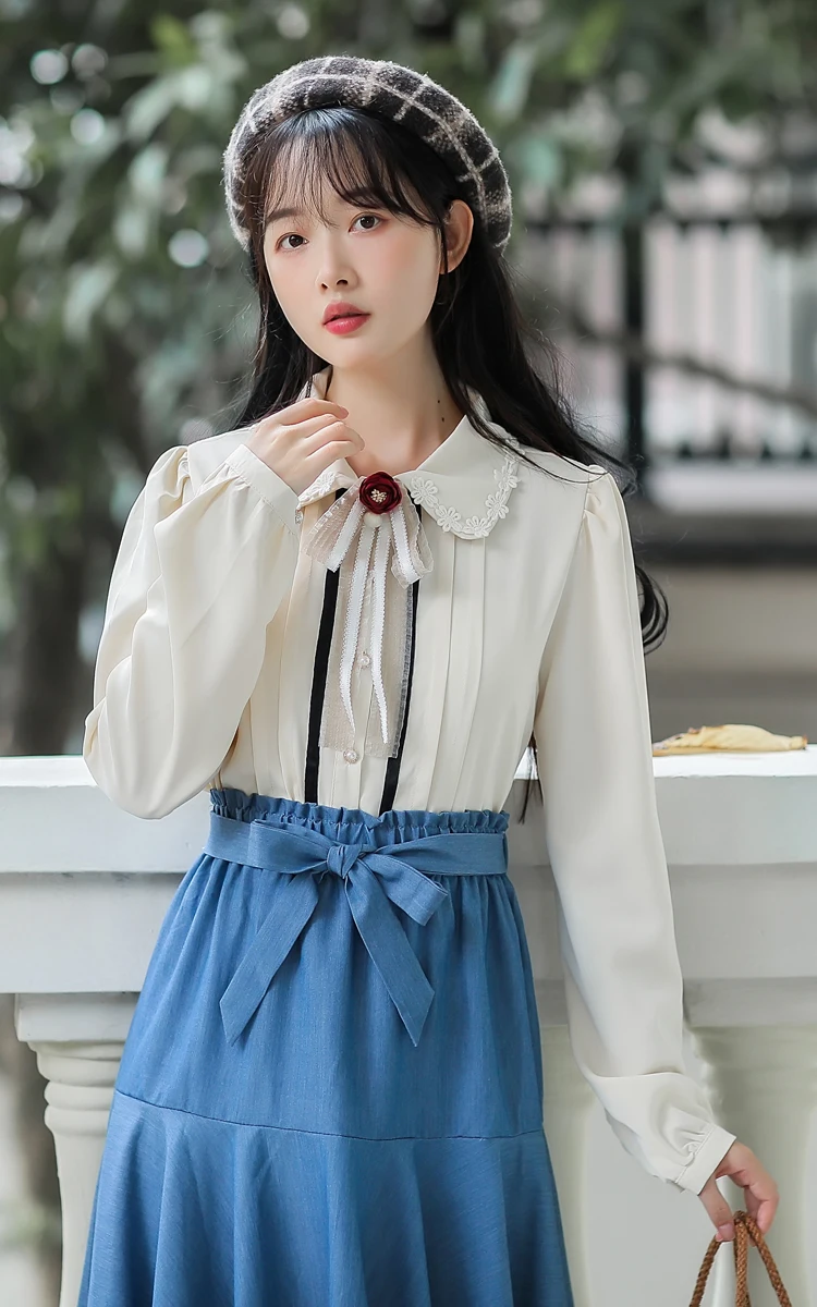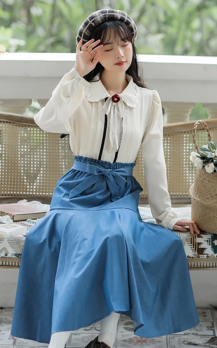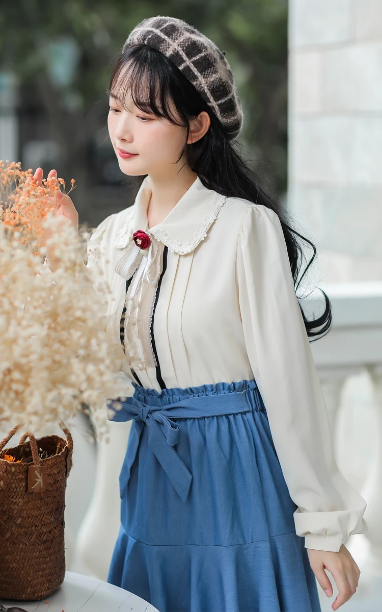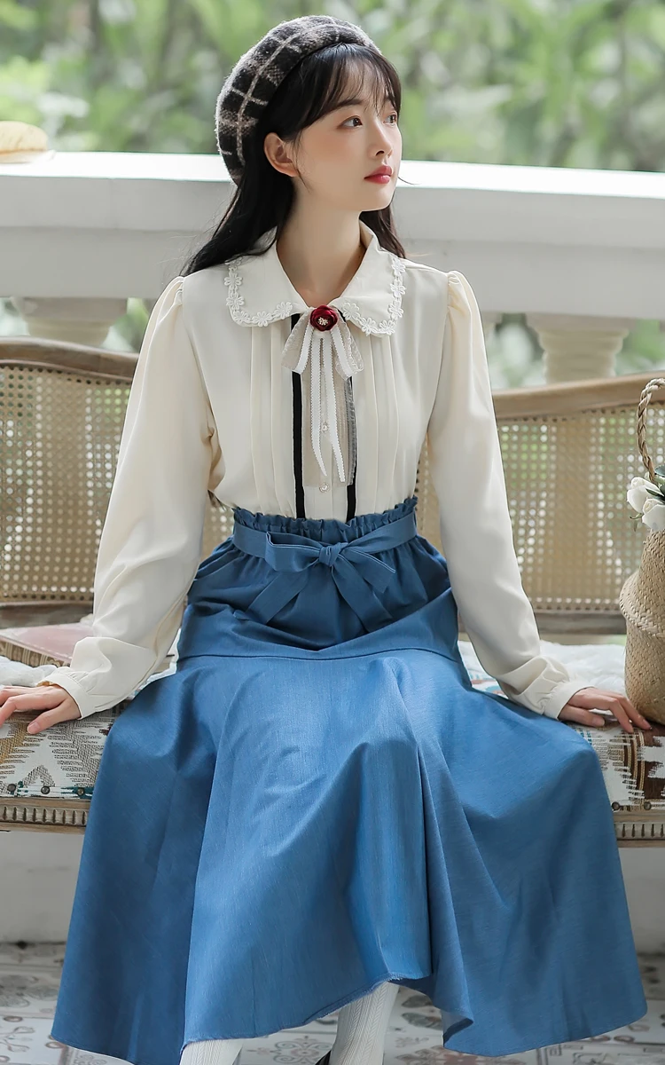 French Elegant Shirt Skirt Suit Fall Female Flowers Bow Chic Doll Collar Cute Blouse+Blue Bow Bandage Skirt 2 Piece Set Women
