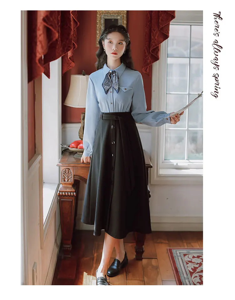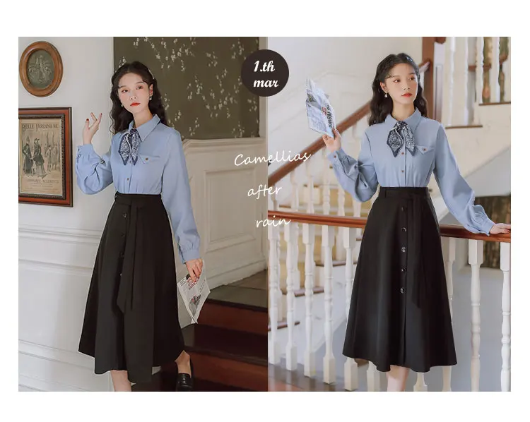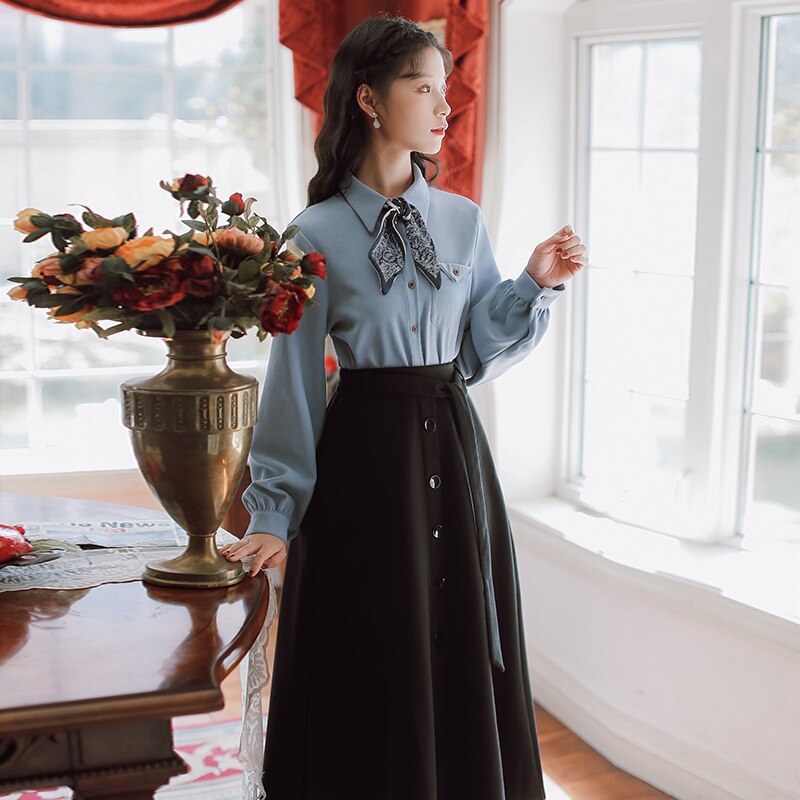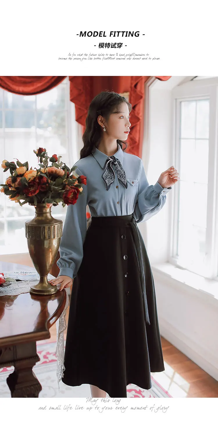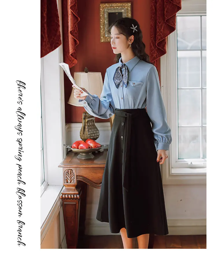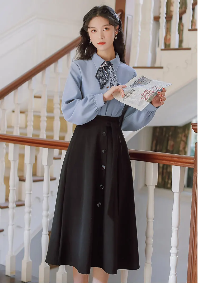 French Literary Elegance 2 Piece Set Women Outfits Bowknot Silk Scarf Tie Print Blue Lapel Shirt +Black Tie Skirt Retro OL Suit