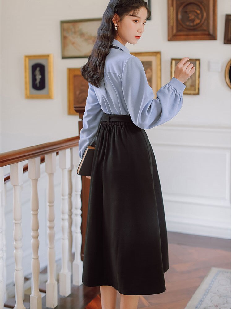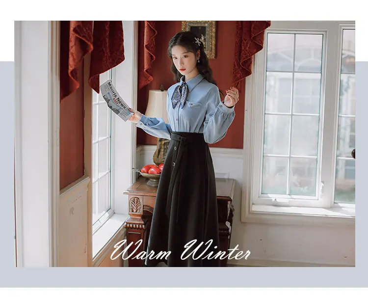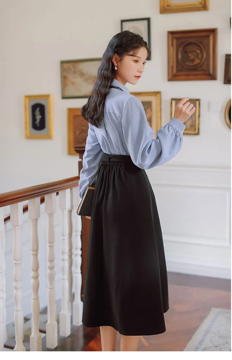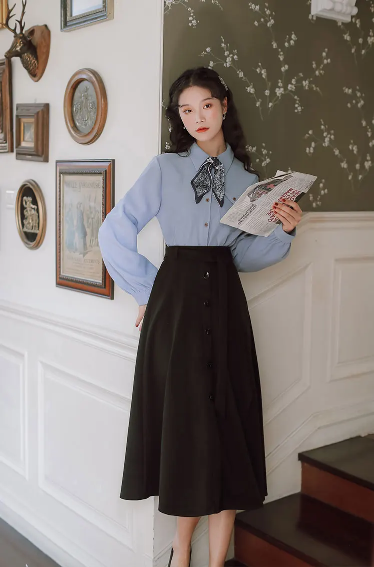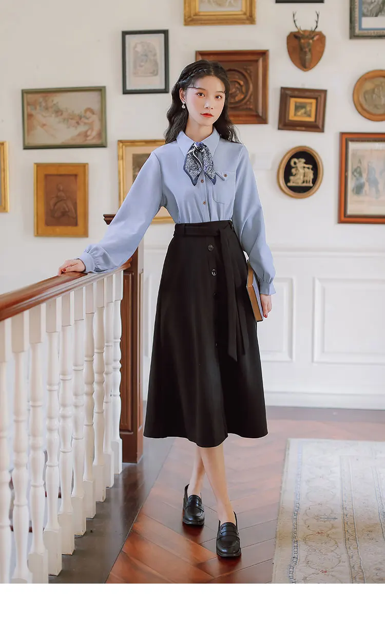 French Literary Elegance 2 Piece Set Women Outfits Bowknot Silk Scarf Tie Print Blue Lapel Shirt +Black Tie Skirt Retro OL Suit