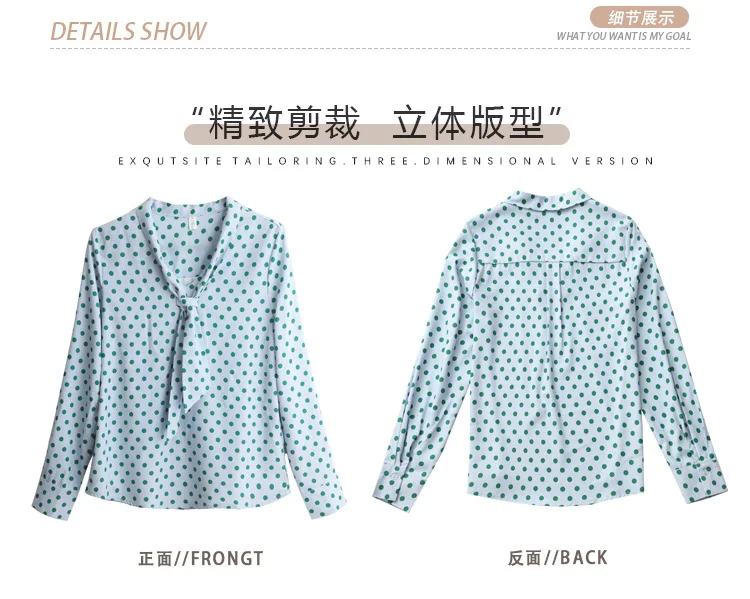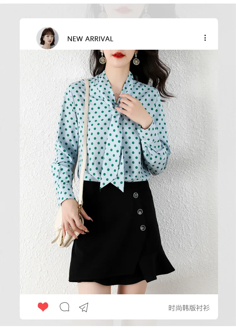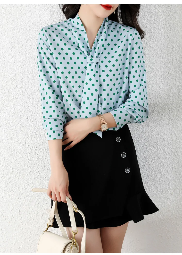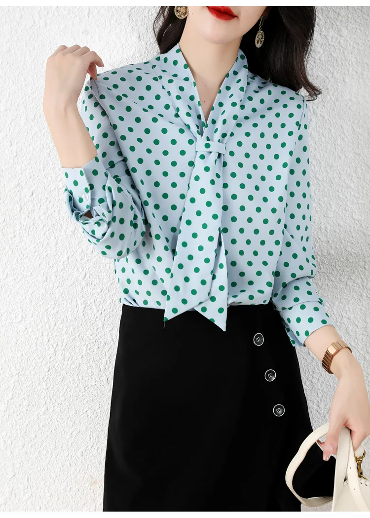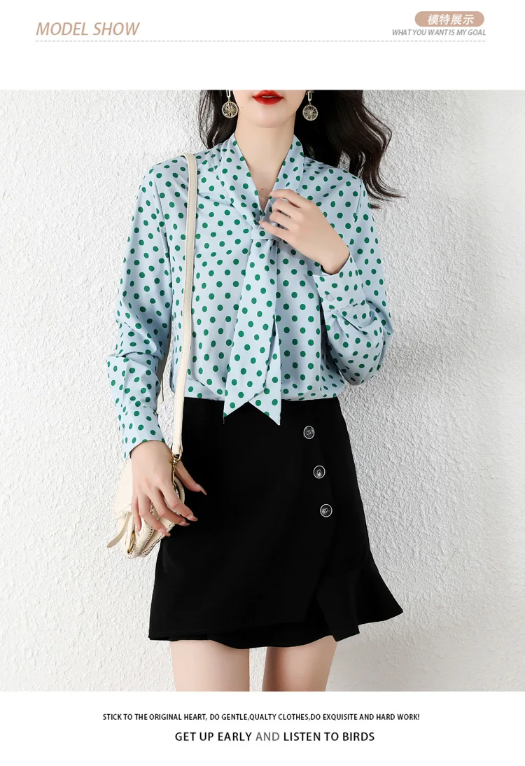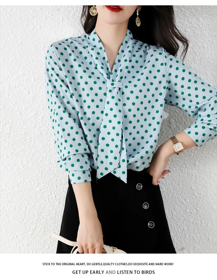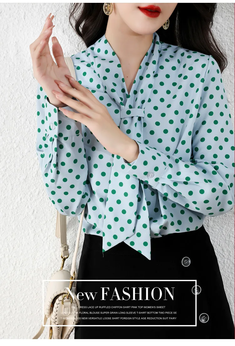 High-end Autumn Women Chiffon Blouse Fashion Polka Dot Long Sleeves Bow Loose Office Lady Shirt Elegant Slim Clothing