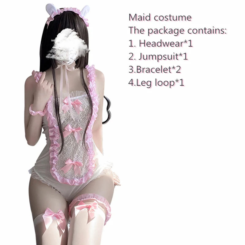 Hot Japanese Cosplay Costume Kawaii Maid sexy lingerie Pink Cute Lace Bodysuit With Tail Anime Erotic Outfit Women Maid Jumpsuit