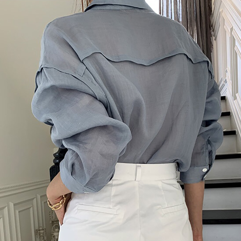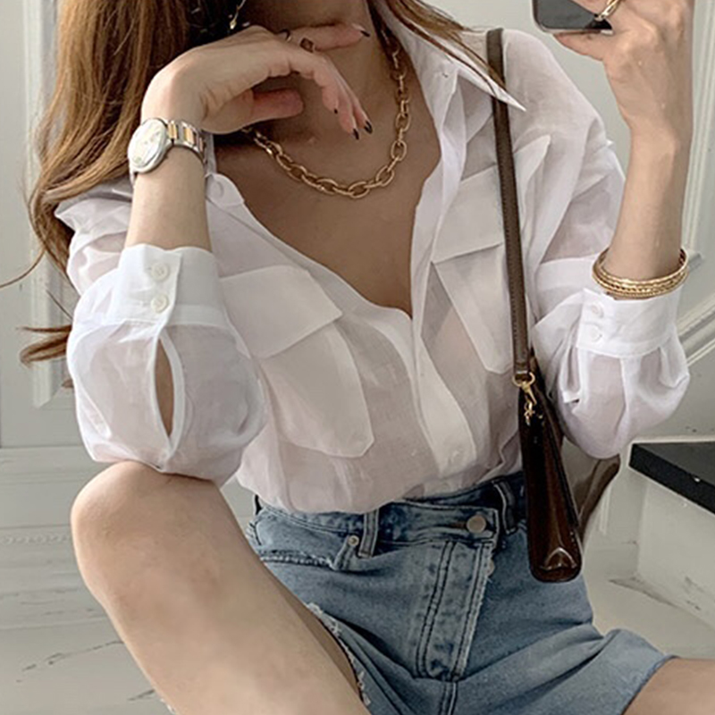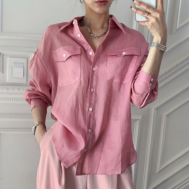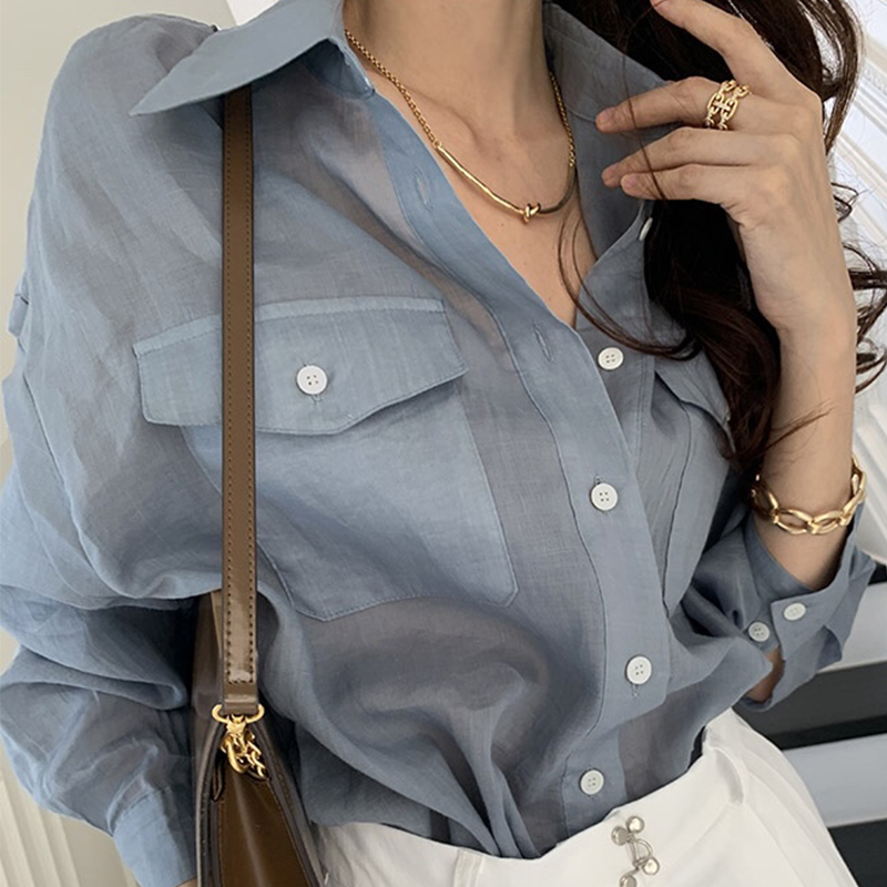 Korean Chic Summer Niche Temperament Polo Collar Single-Breasted Double Pockets Loose Thin Long-Sleeved Anti-Sei Shirt Women