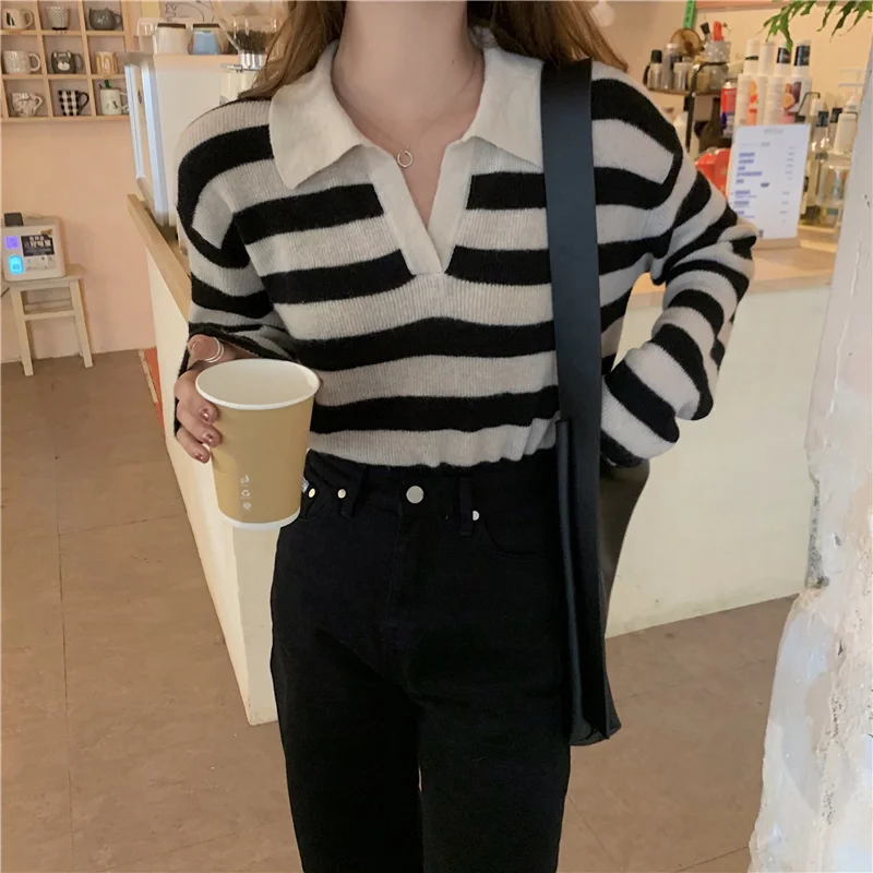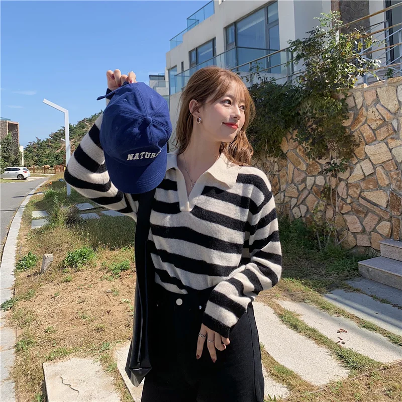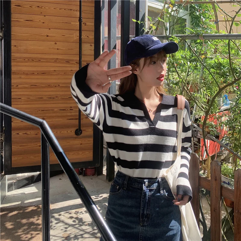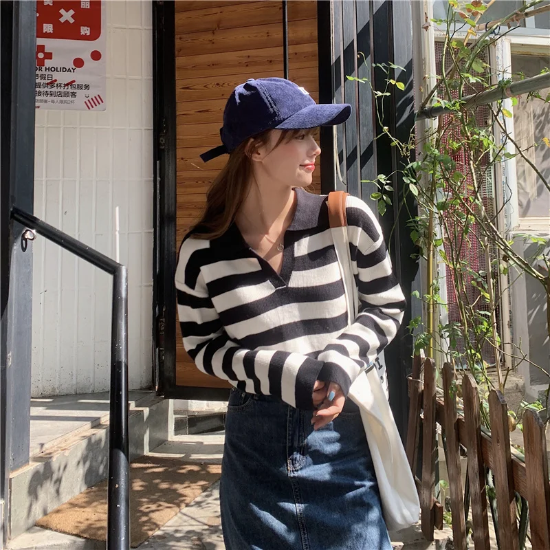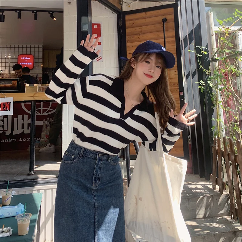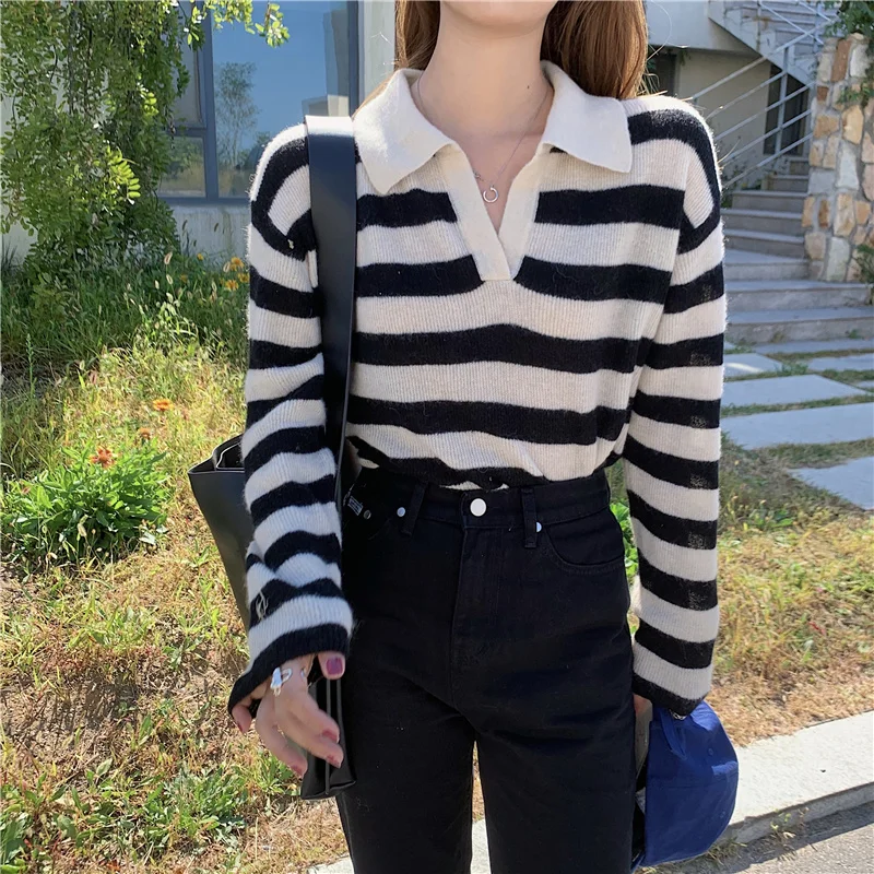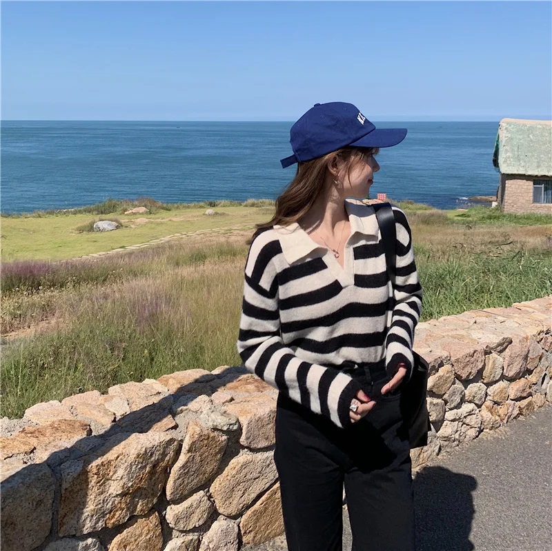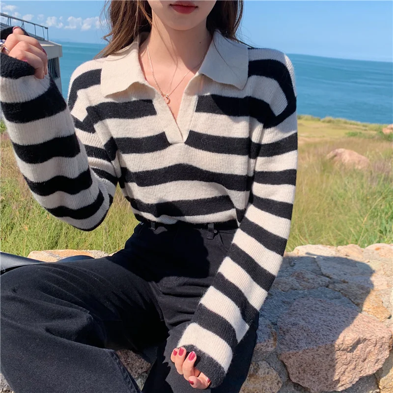 Lapel Striped Pullover Sweater Female Korean Spring Loose Student Soft Waxy Long Sleeve Sweater Top