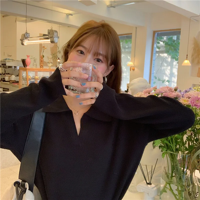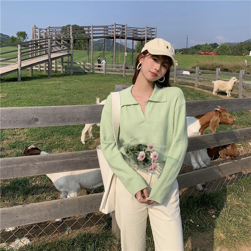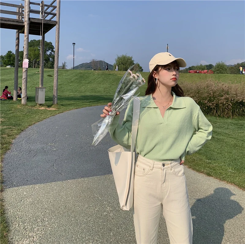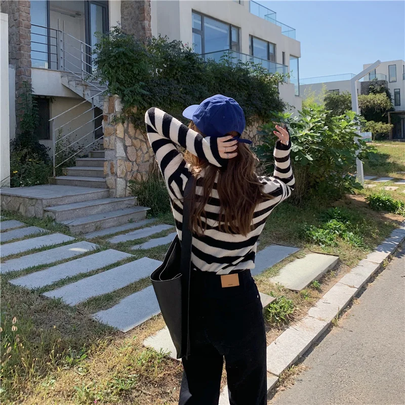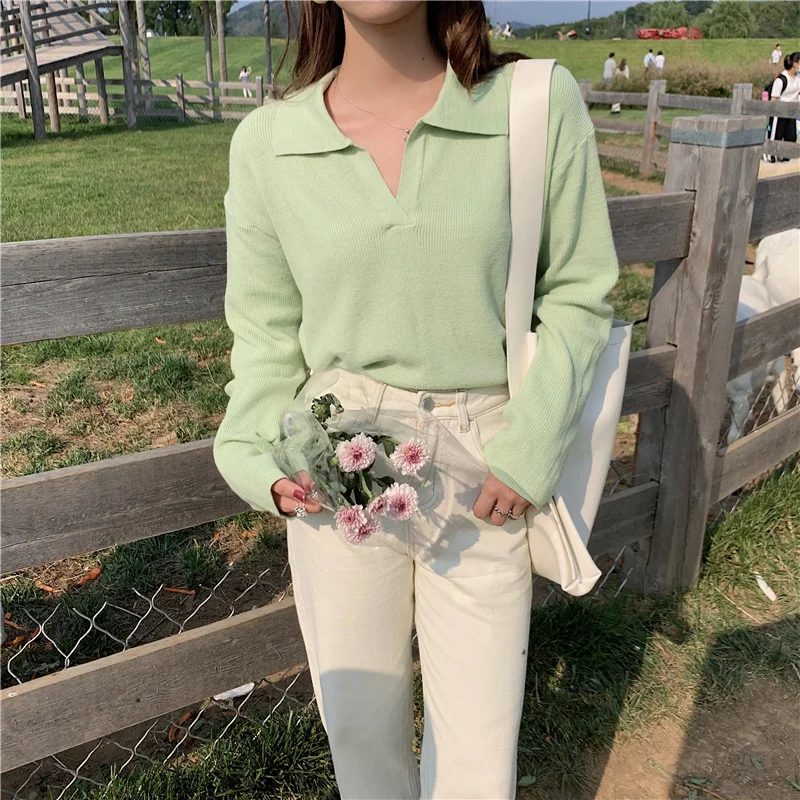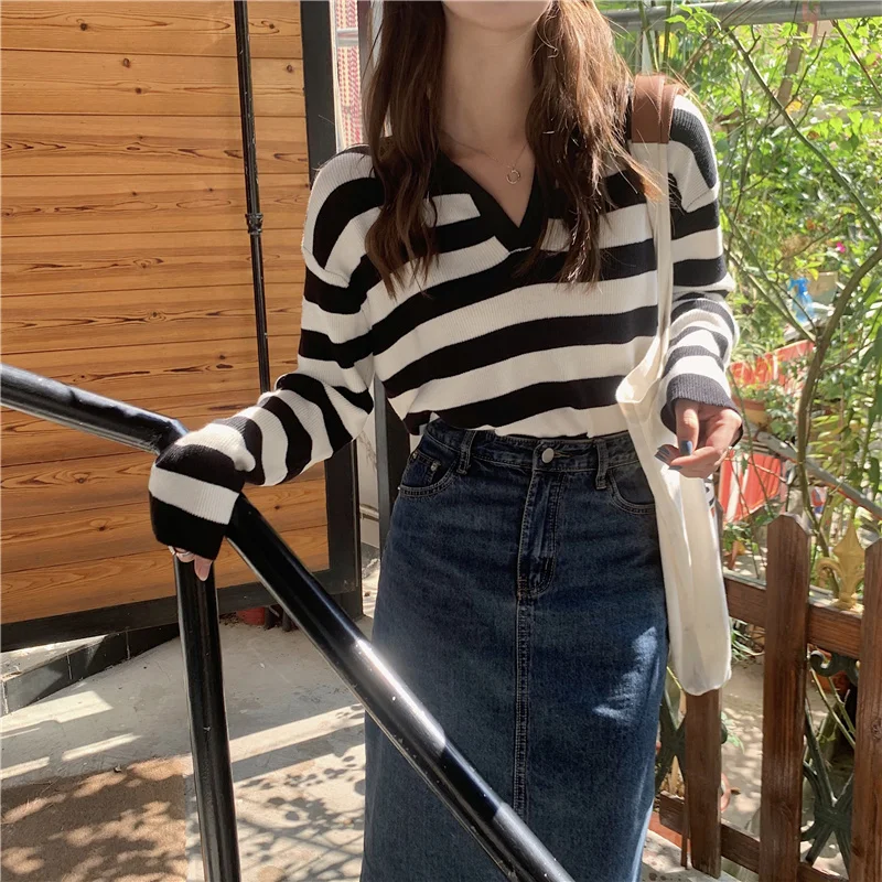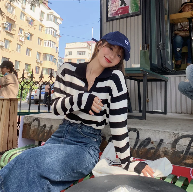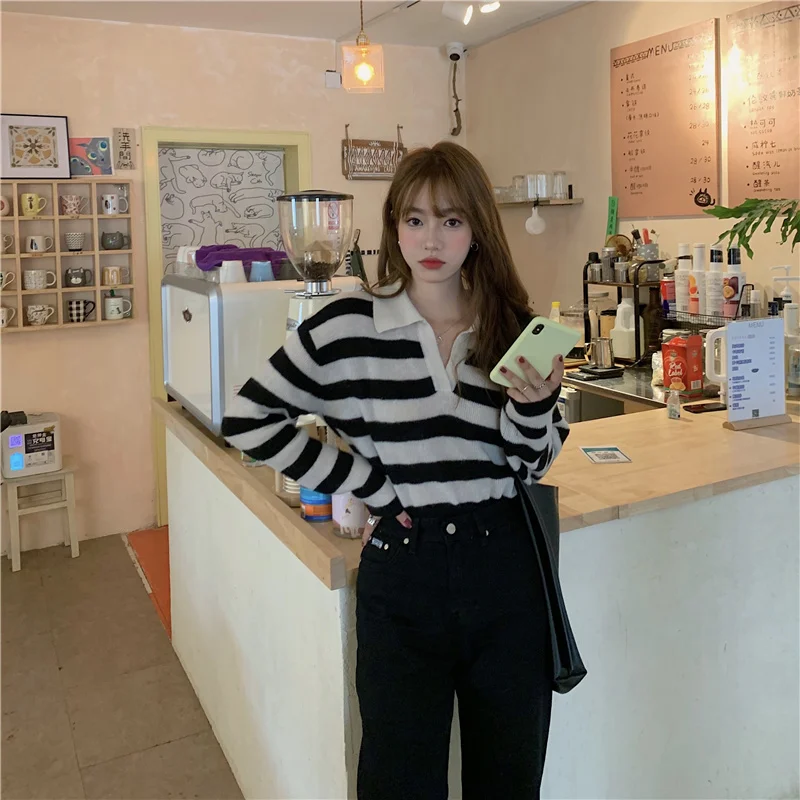 Lapel Striped Pullover Sweater Female Korean Spring Loose Student Soft Waxy Long Sleeve Sweater Top