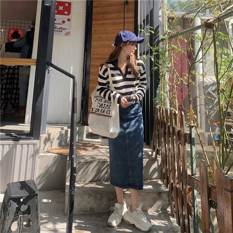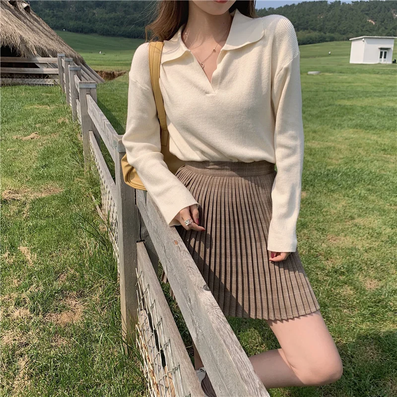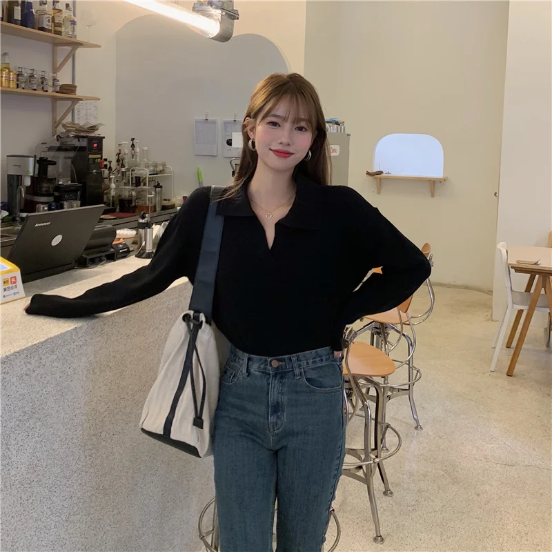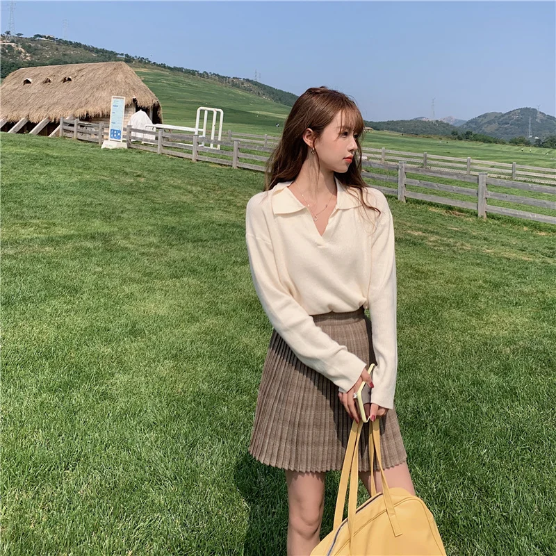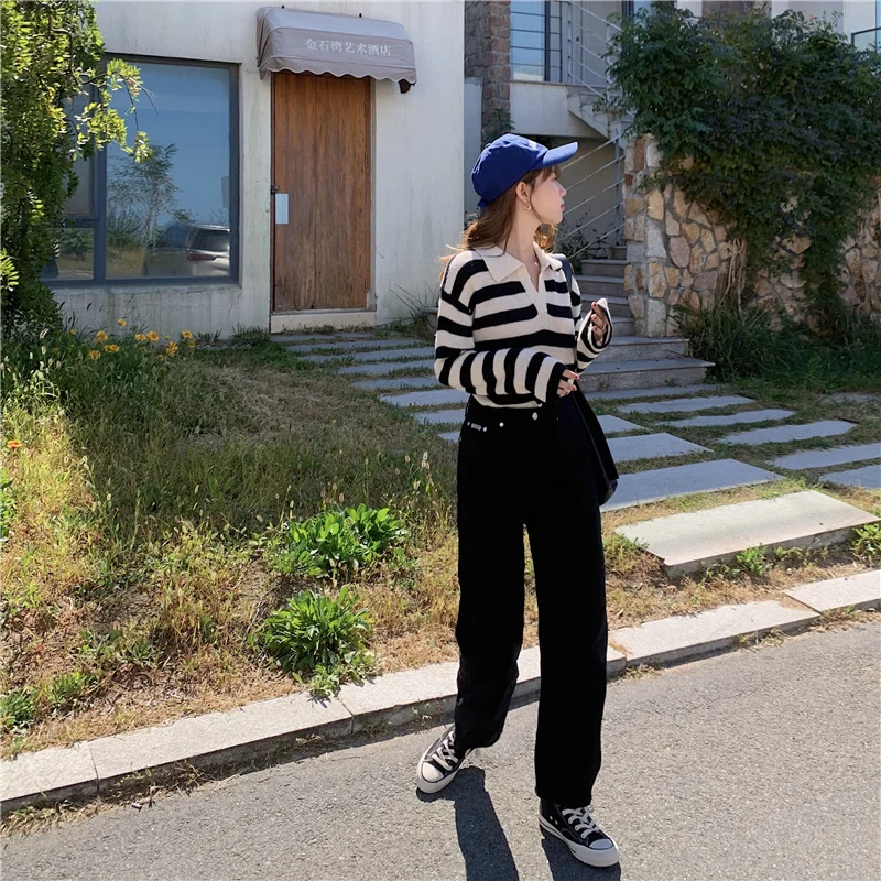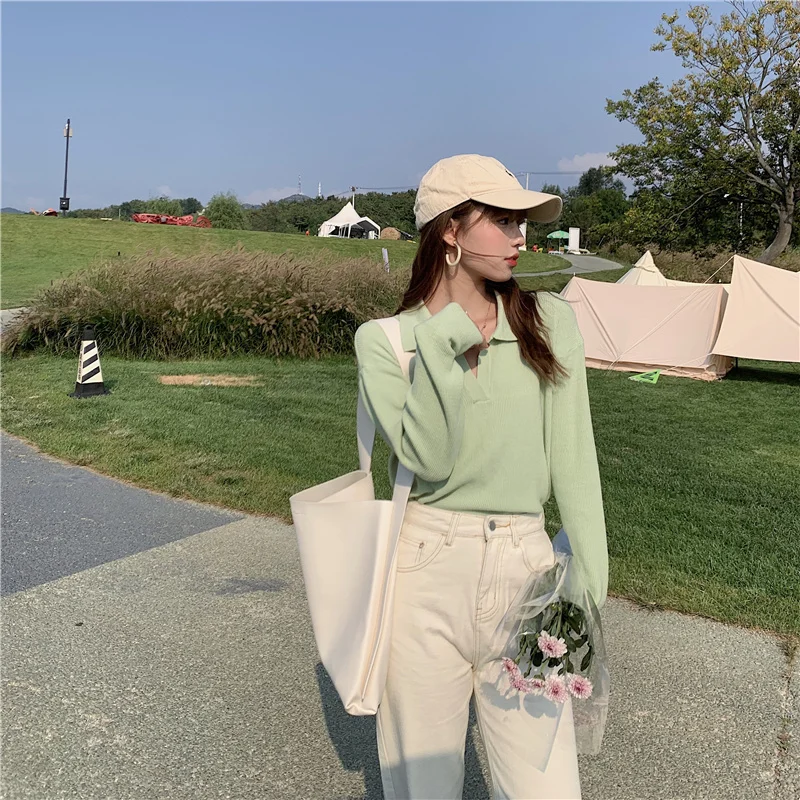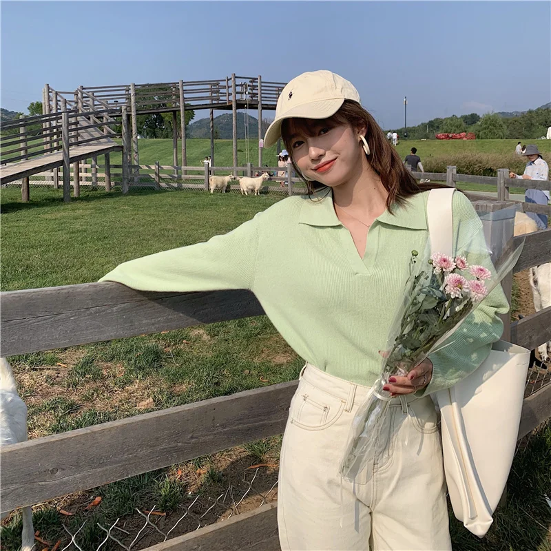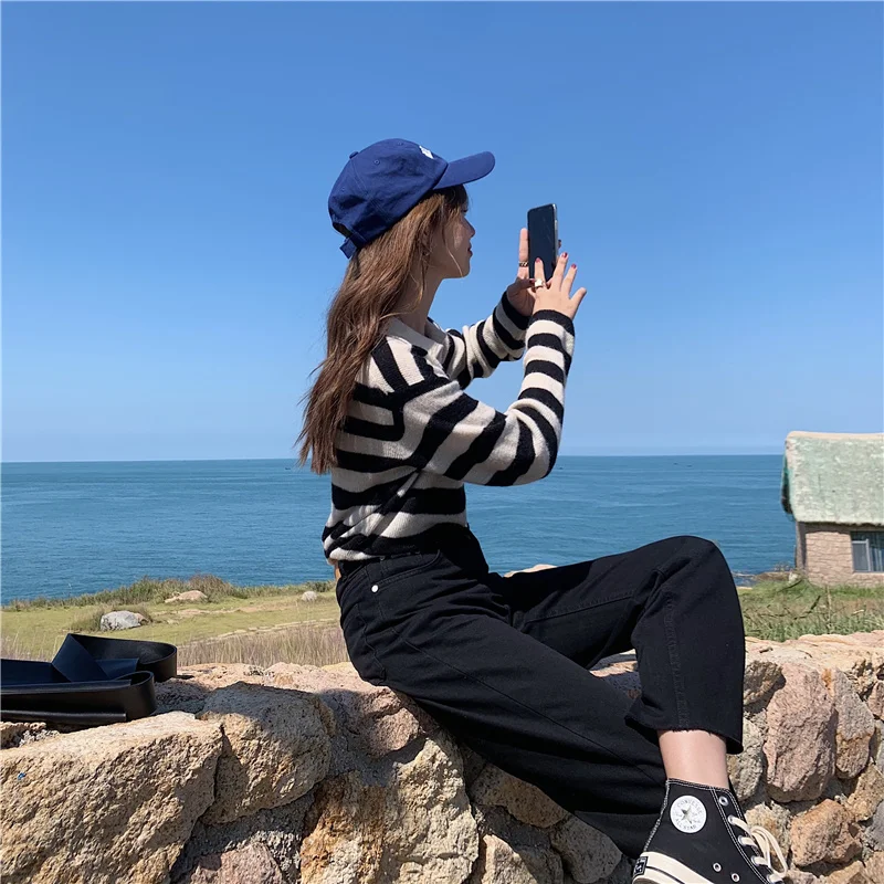 Lapel Striped Pullover Sweater Female Korean Spring Loose Student Soft Waxy Long Sleeve Sweater Top