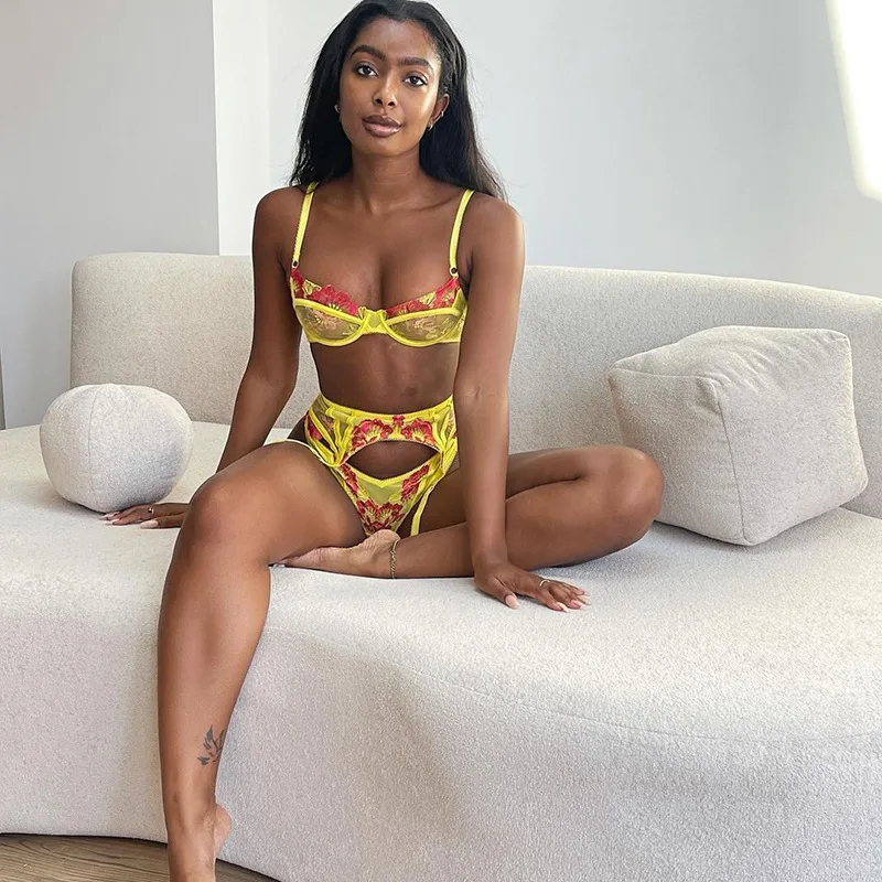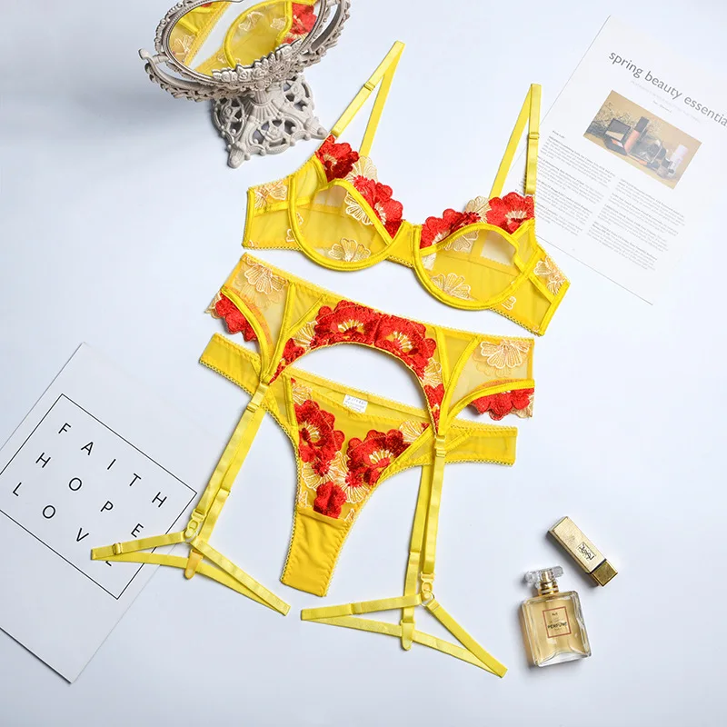 Lingerie Sexy Set Lace Bra And Panty Perspective Classic Embroidered Lace Sexy Push Up Underwear With Steel Rings Four-piece Set