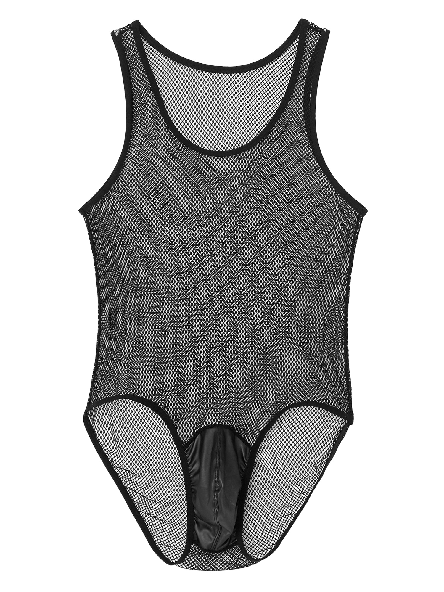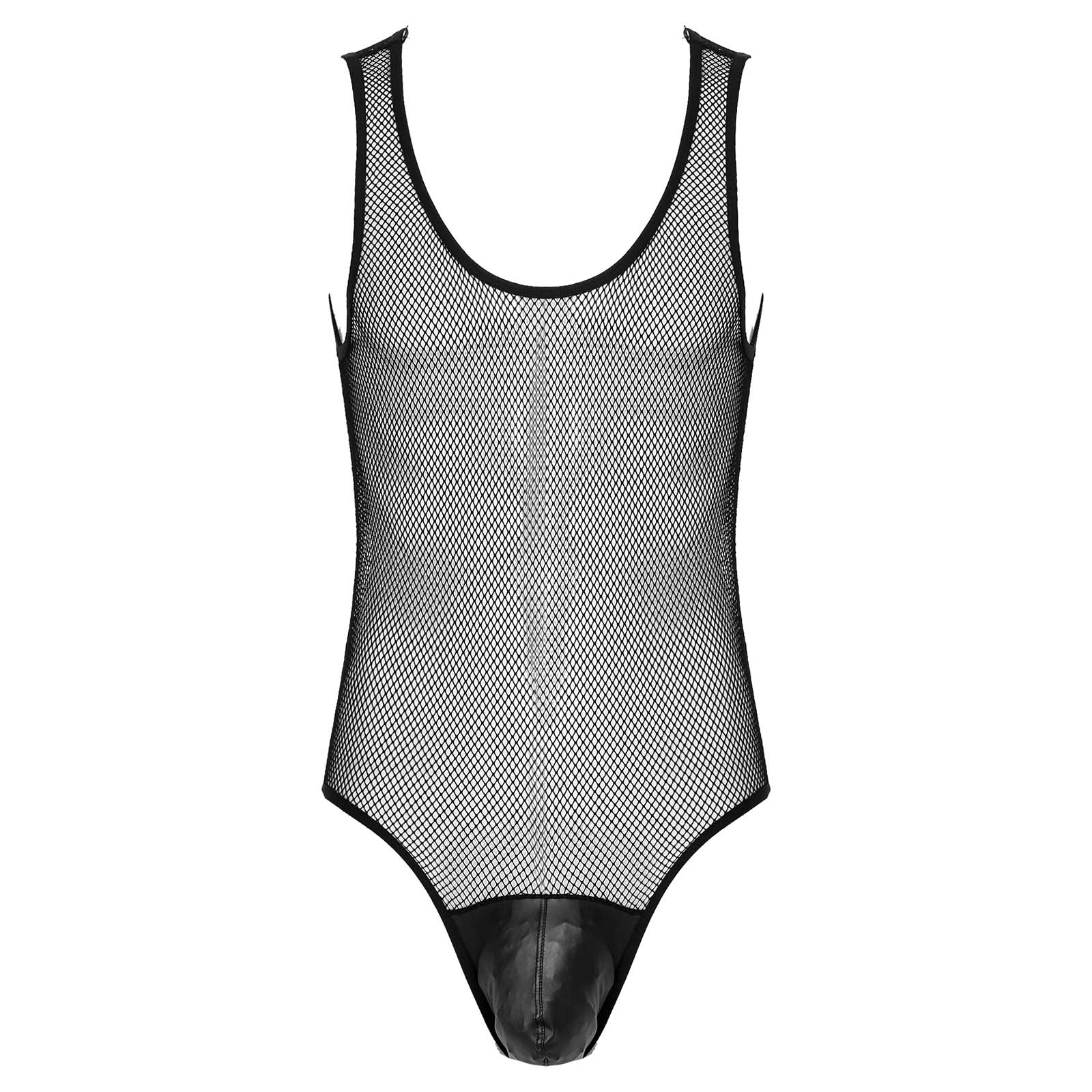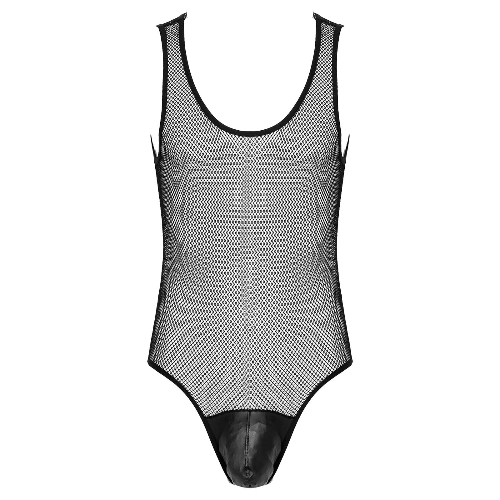 Men See-through Hollow Out Mesh Bodysuit Faux Leather Bulge Pouch Leotard Sleeveless Playsuit.