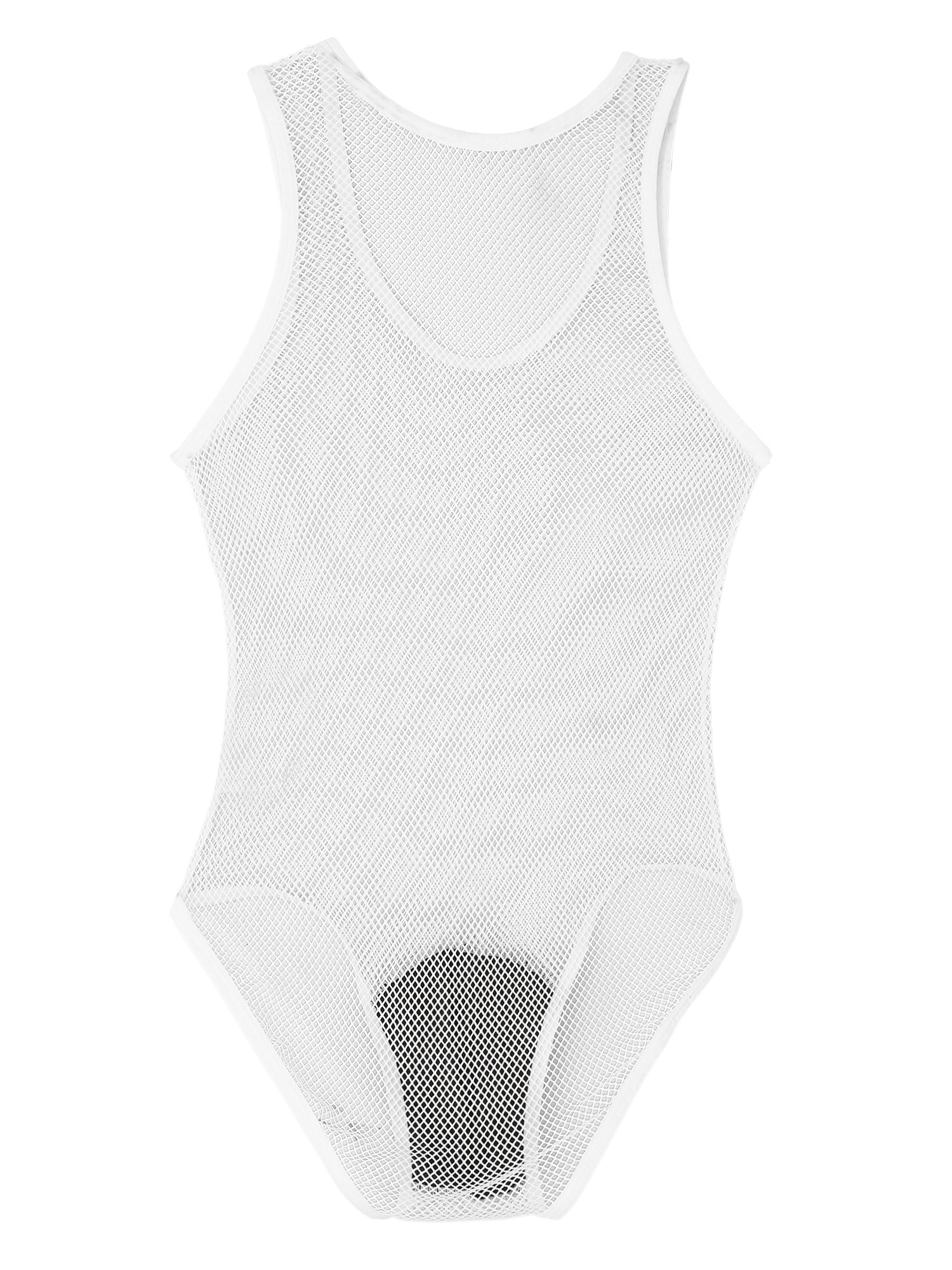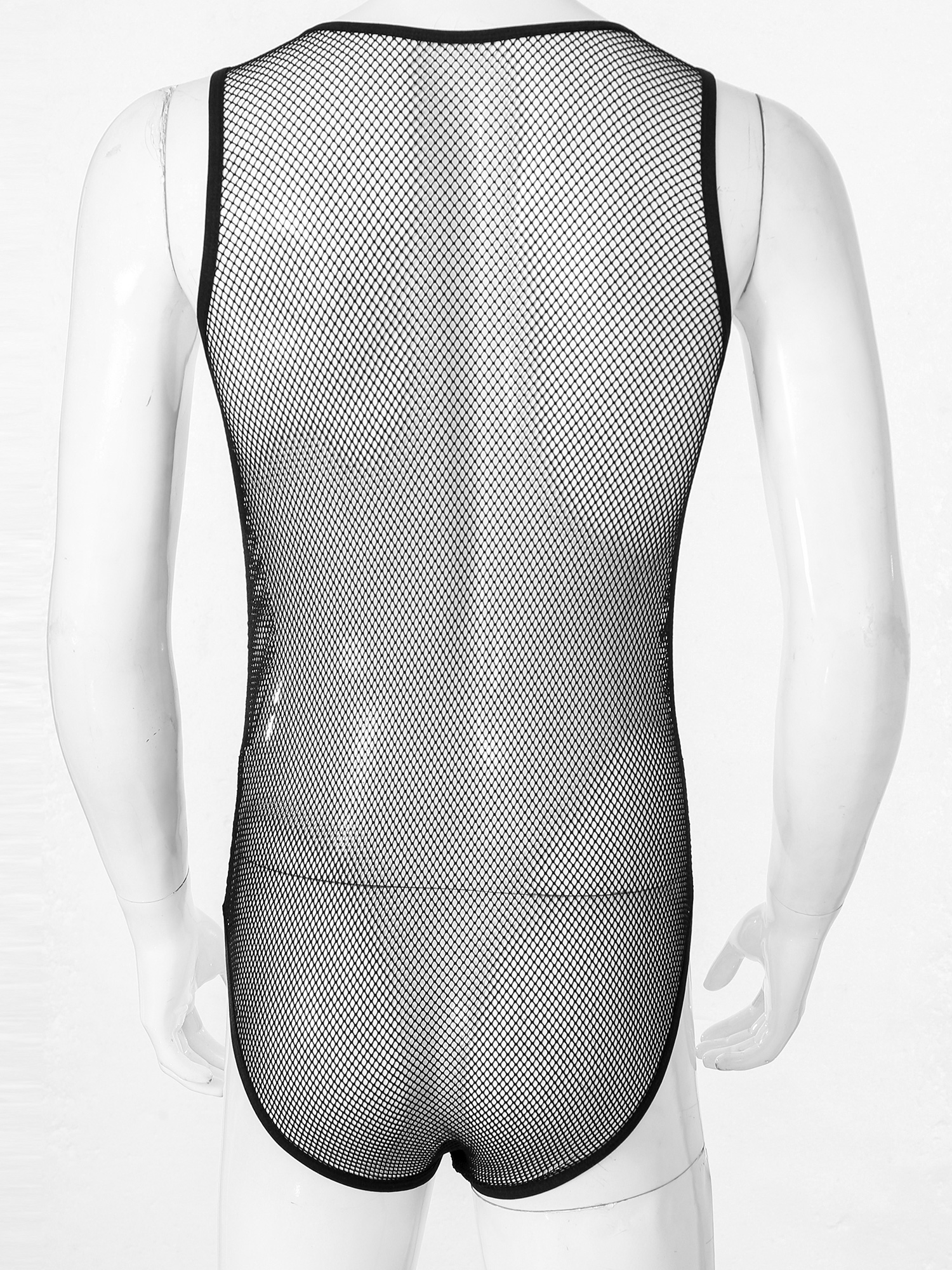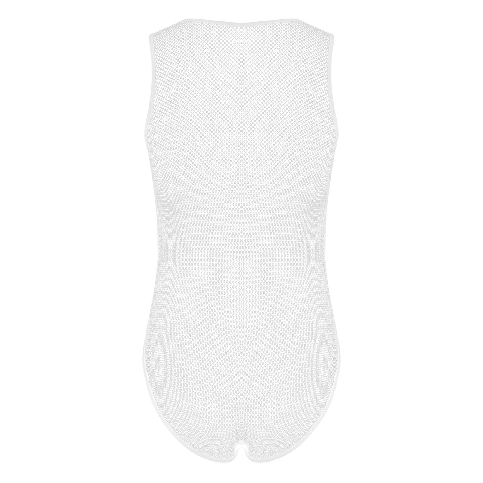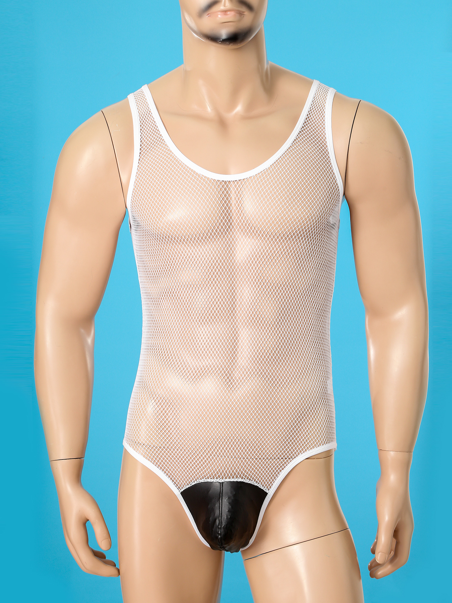 Men See-through Hollow Out Mesh Bodysuit Faux Leather Bulge Pouch Leotard Sleeveless Playsuit.