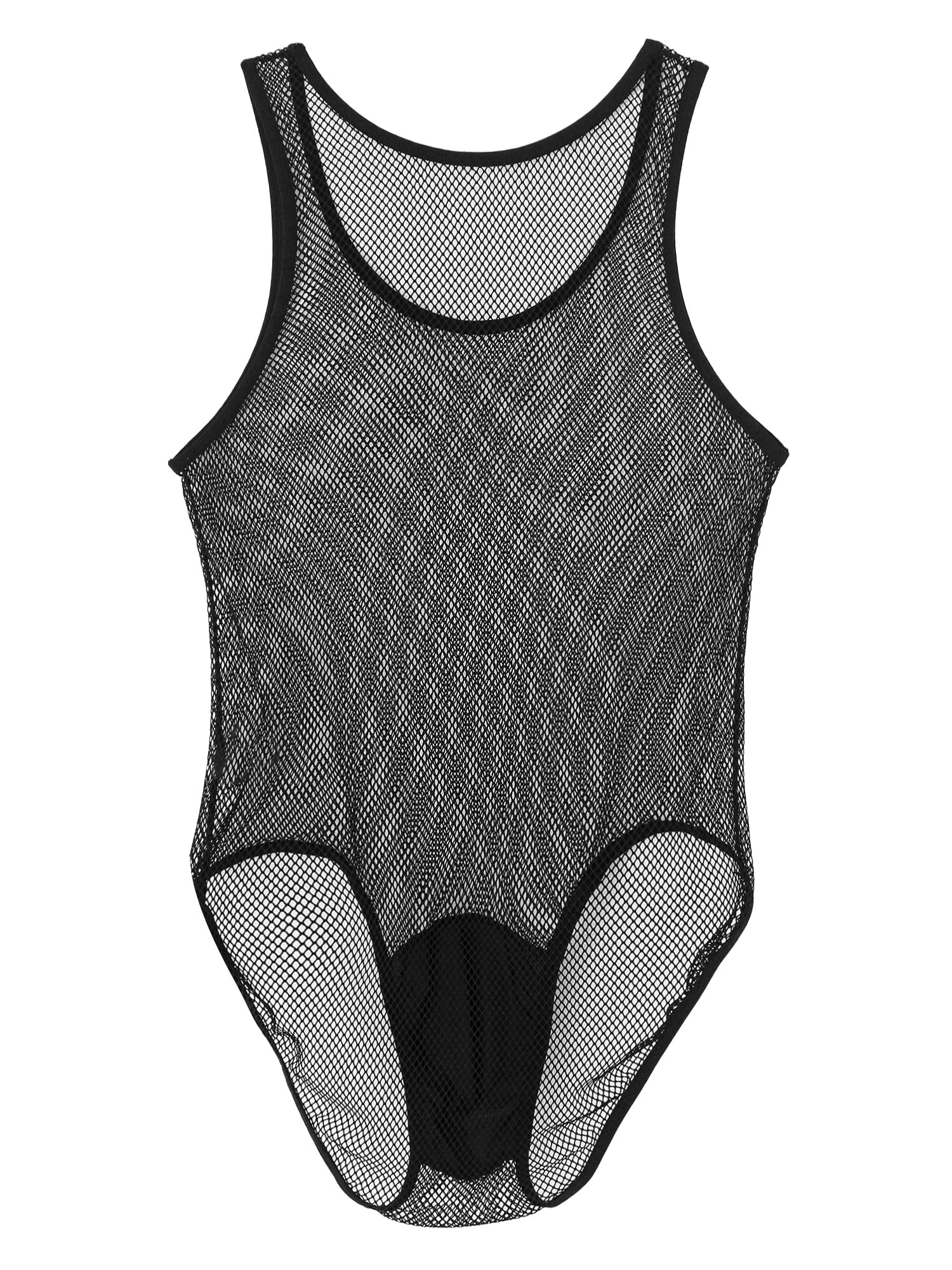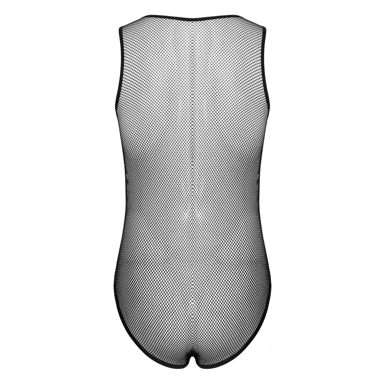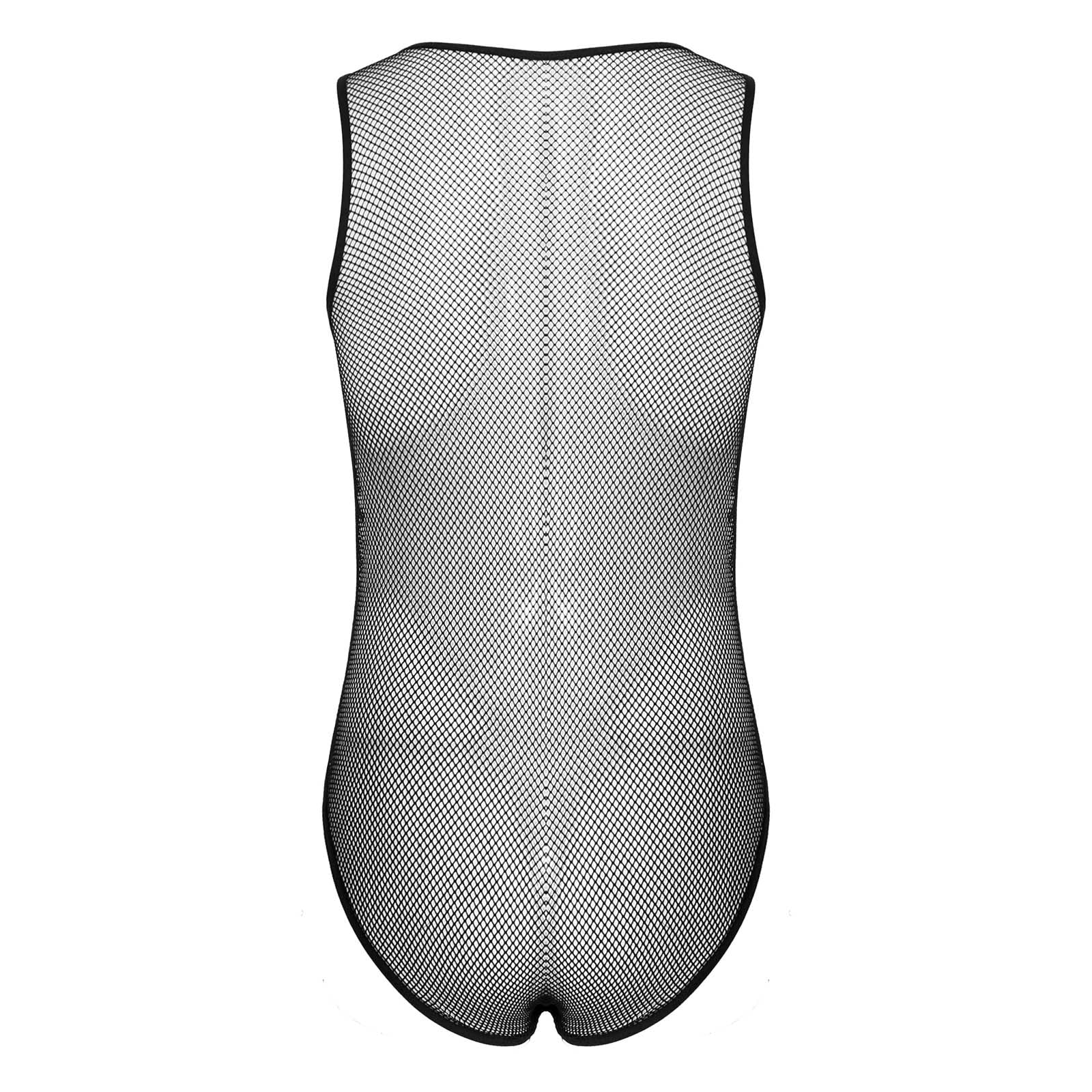Mens Hollow Fishnet Leotard Bodysuit Adult Sexy Lingerie U Neck Sleeveless Leather Bulge Pouch Jumpsuit Clubwear Exotic Costumes