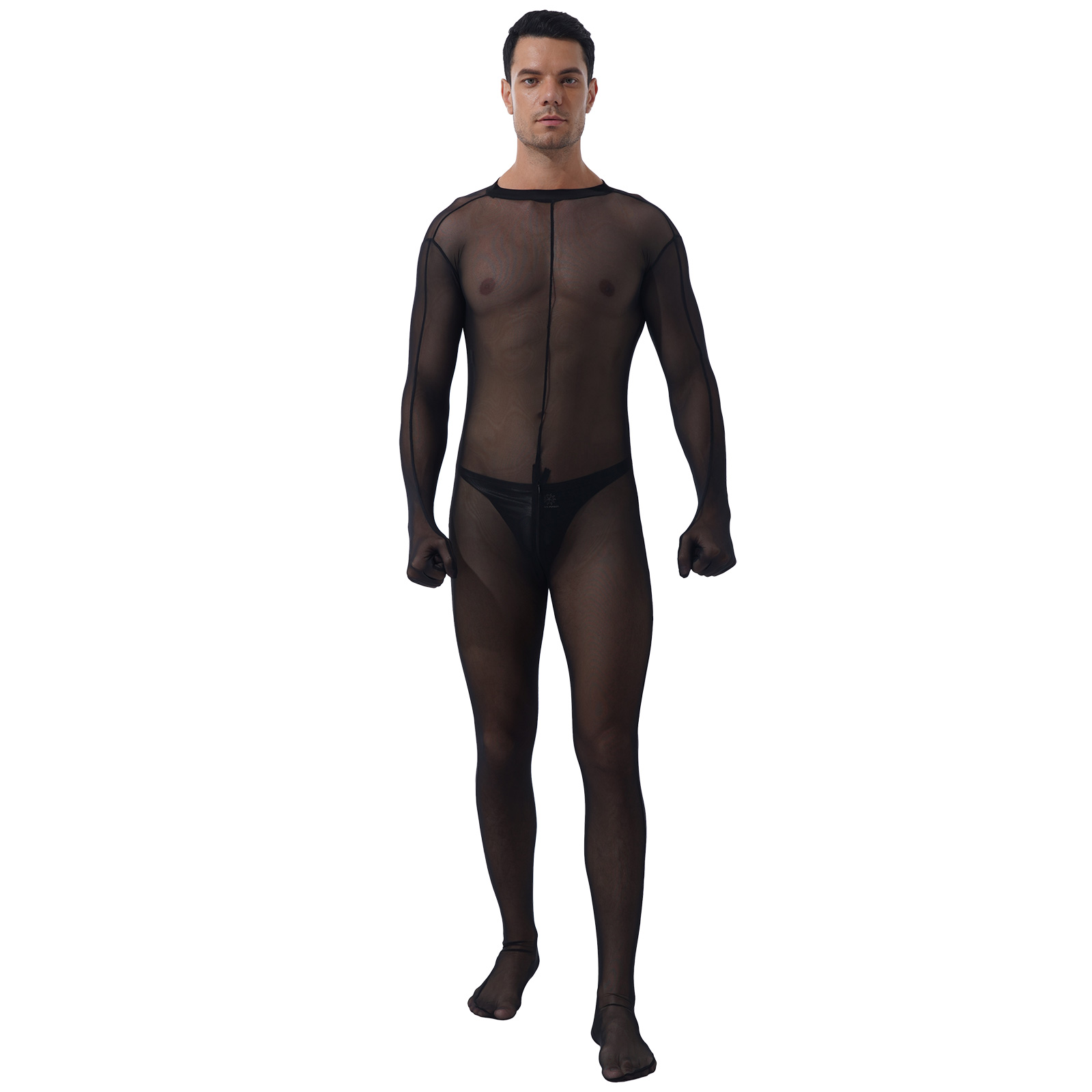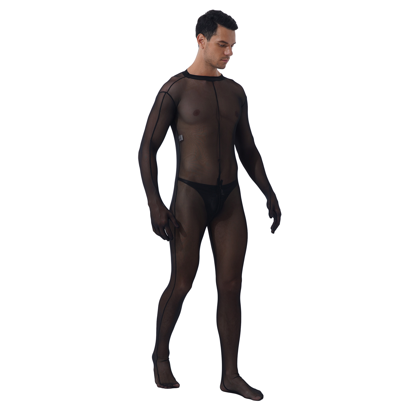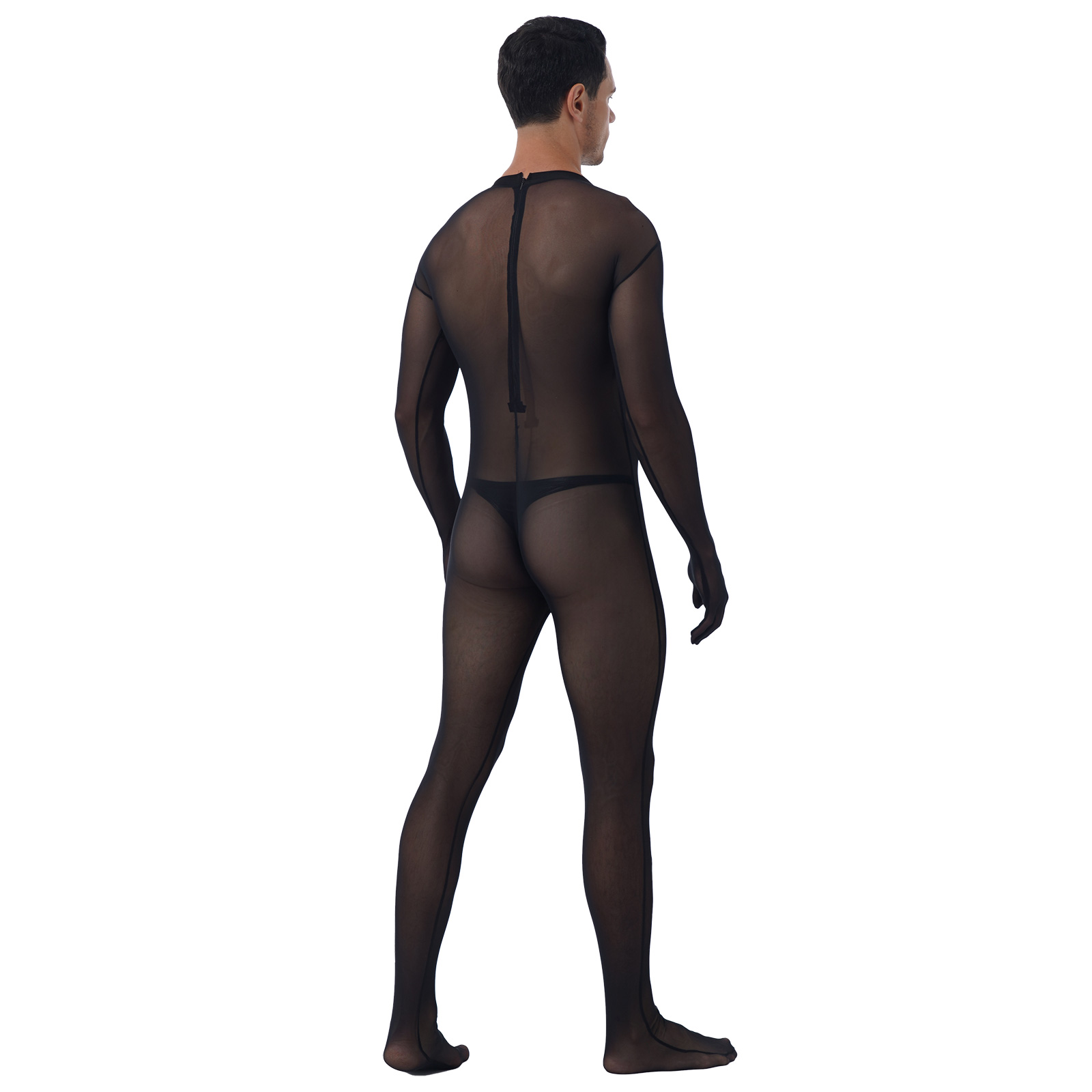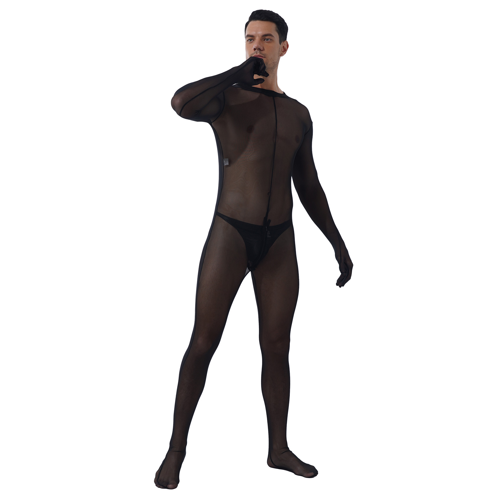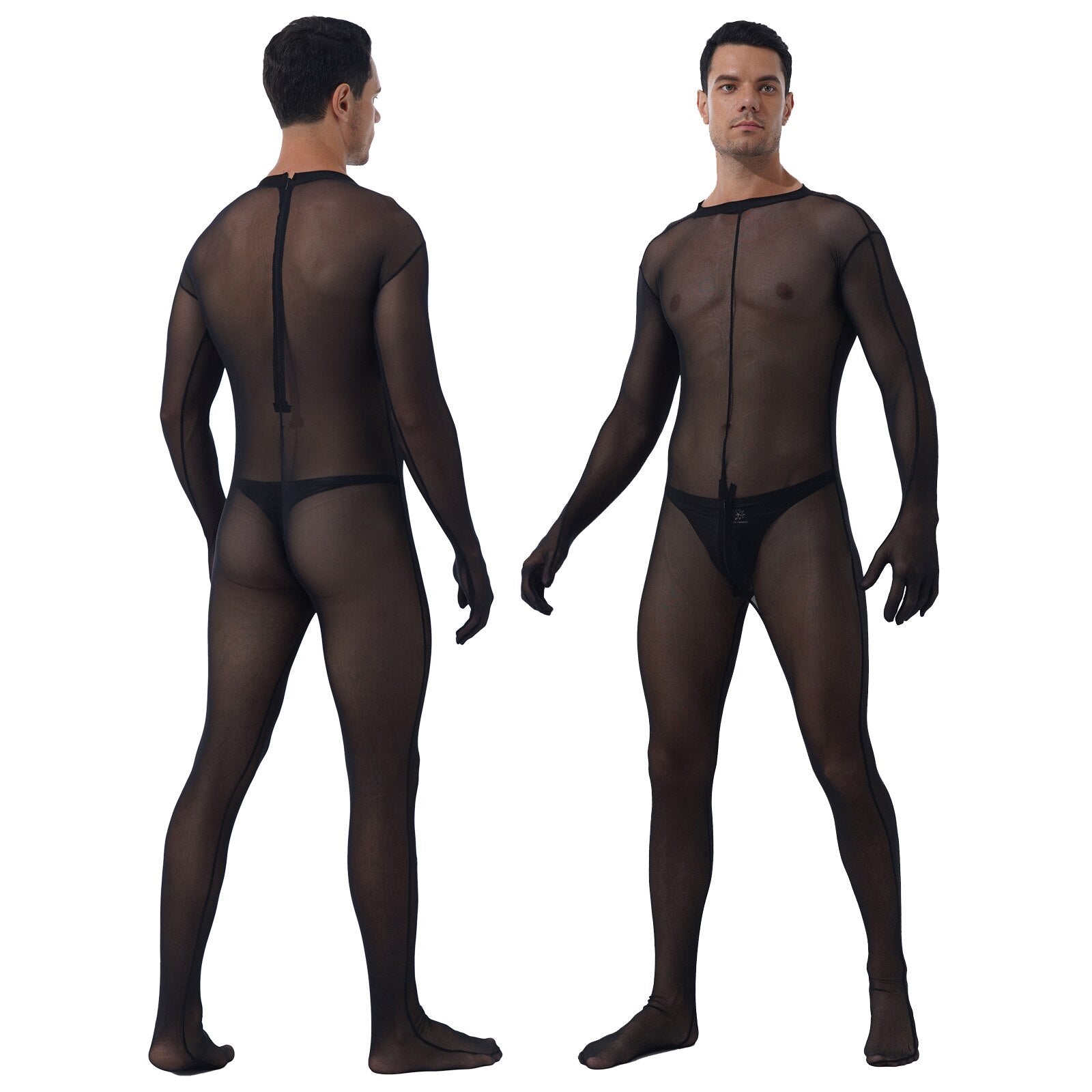 Sheer full body design, long sleeve, zipper closure in back and crotch. Match with a patent leather bulge pouch.