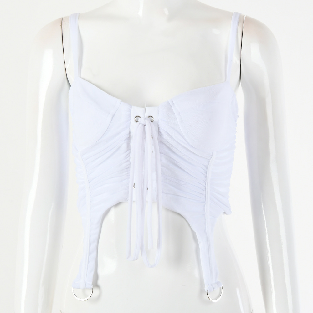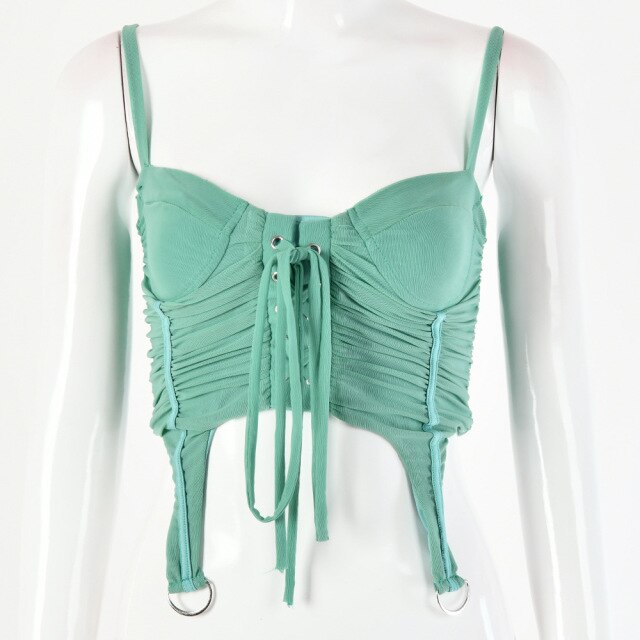 Mesh Ruched Lace Up Sleeveless Tie Front Top Solid Camis Bustier Crop Tops Women Sexy Backless Corset Top Cropped 2022 New
