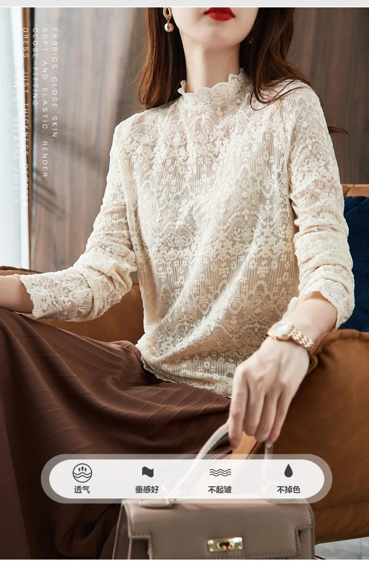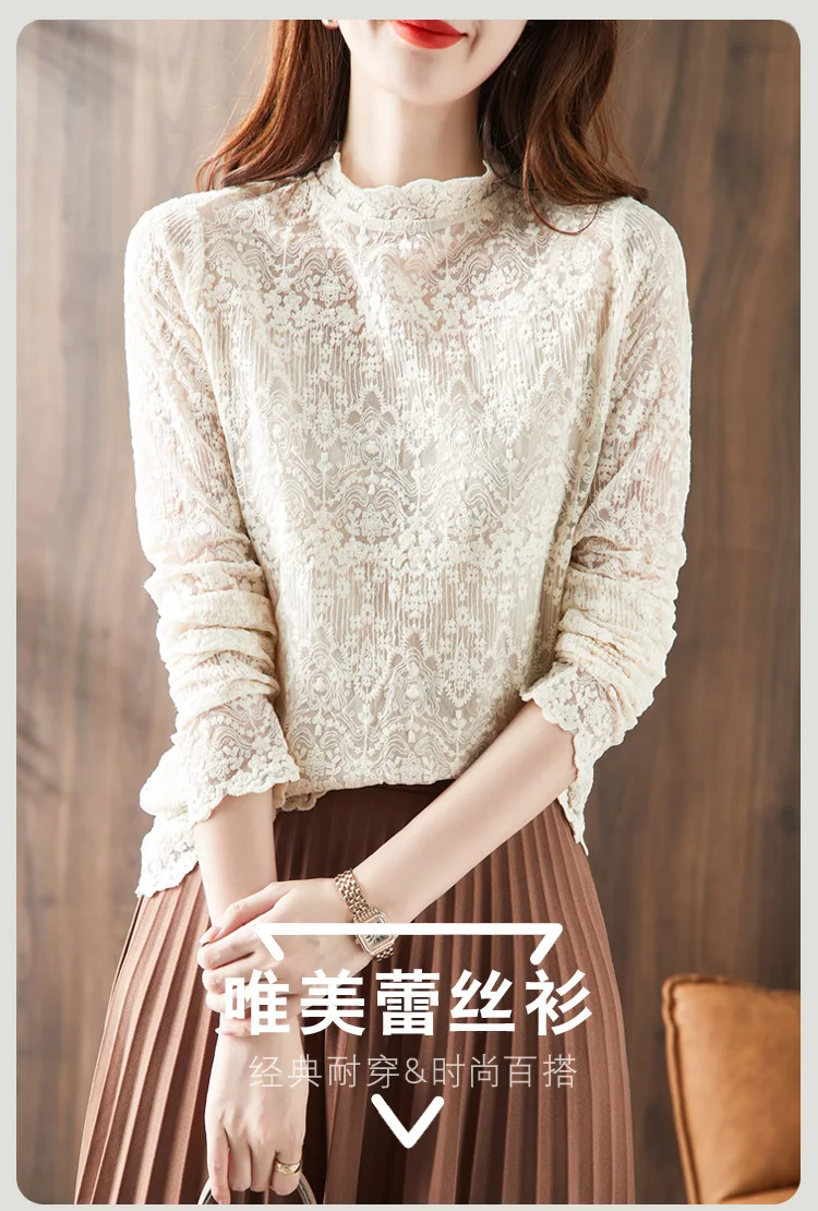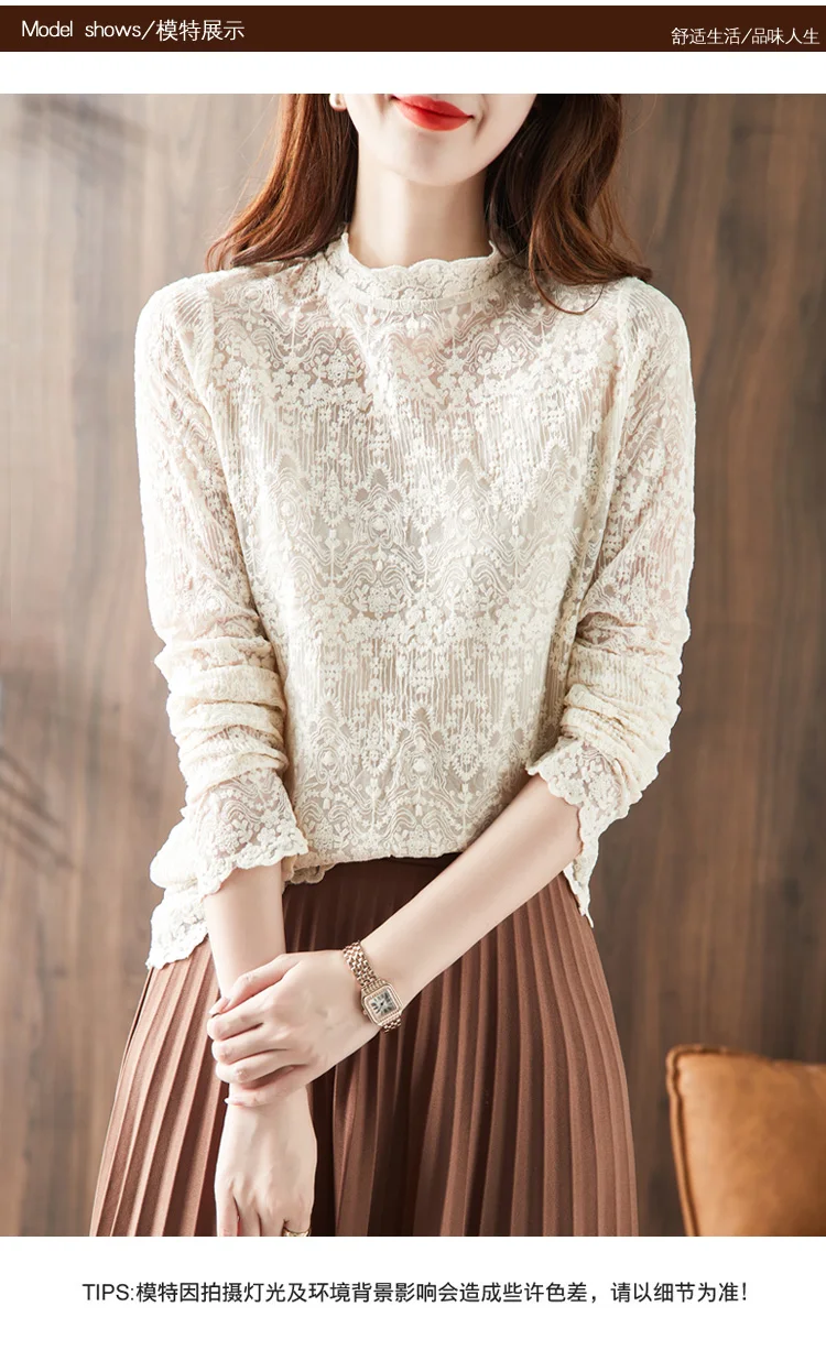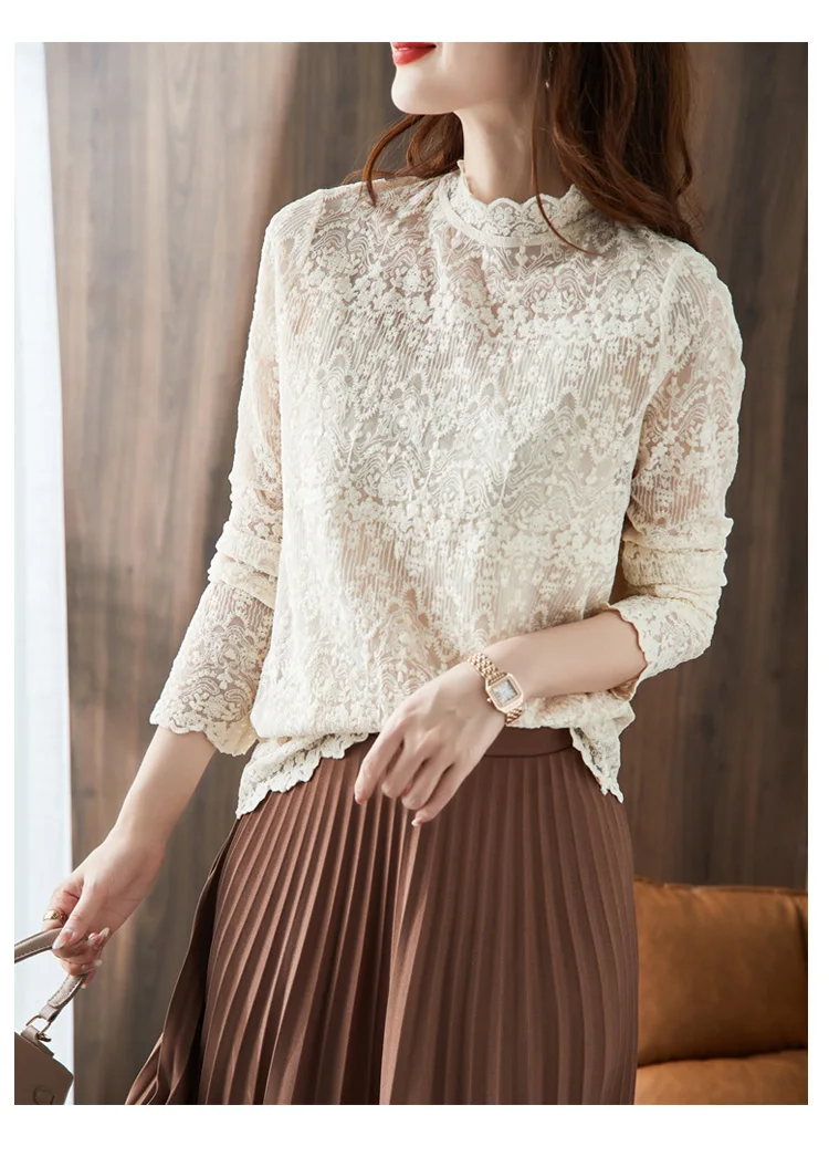 New 2021 Autumn Thin Stand Collar Lace Tops Fashion Casual Long Sleeve Hollow Out Women Blouse Shirt 3XL