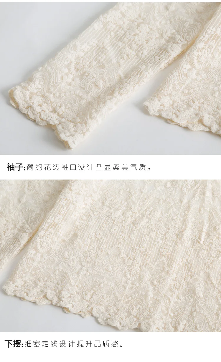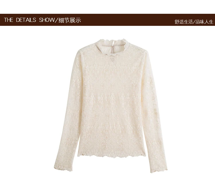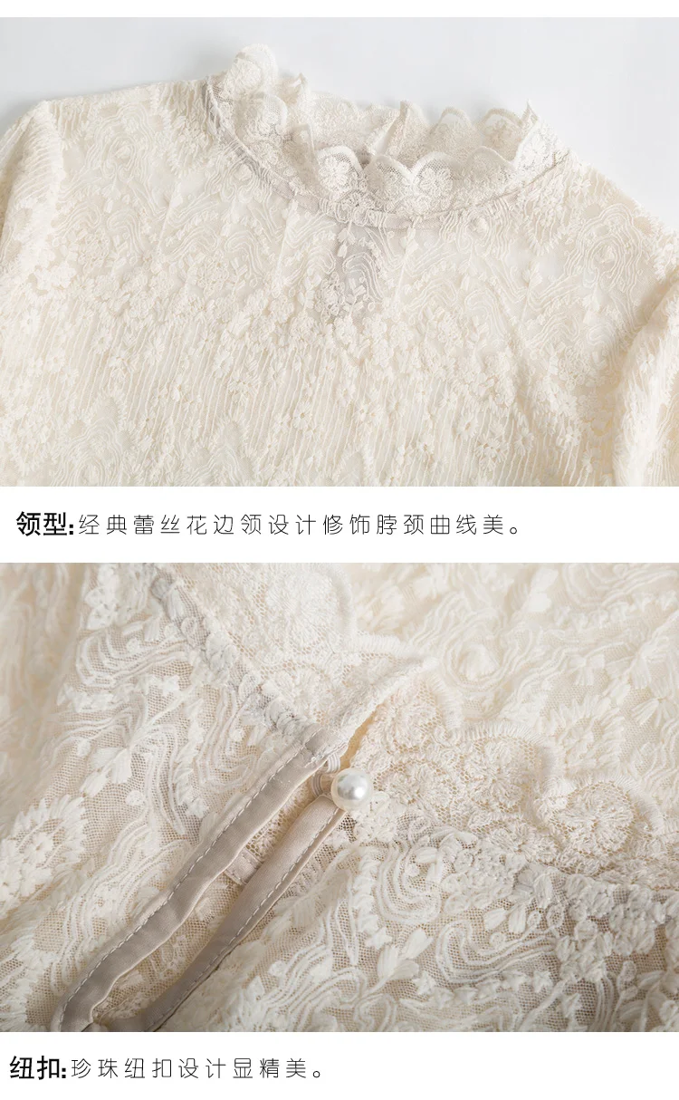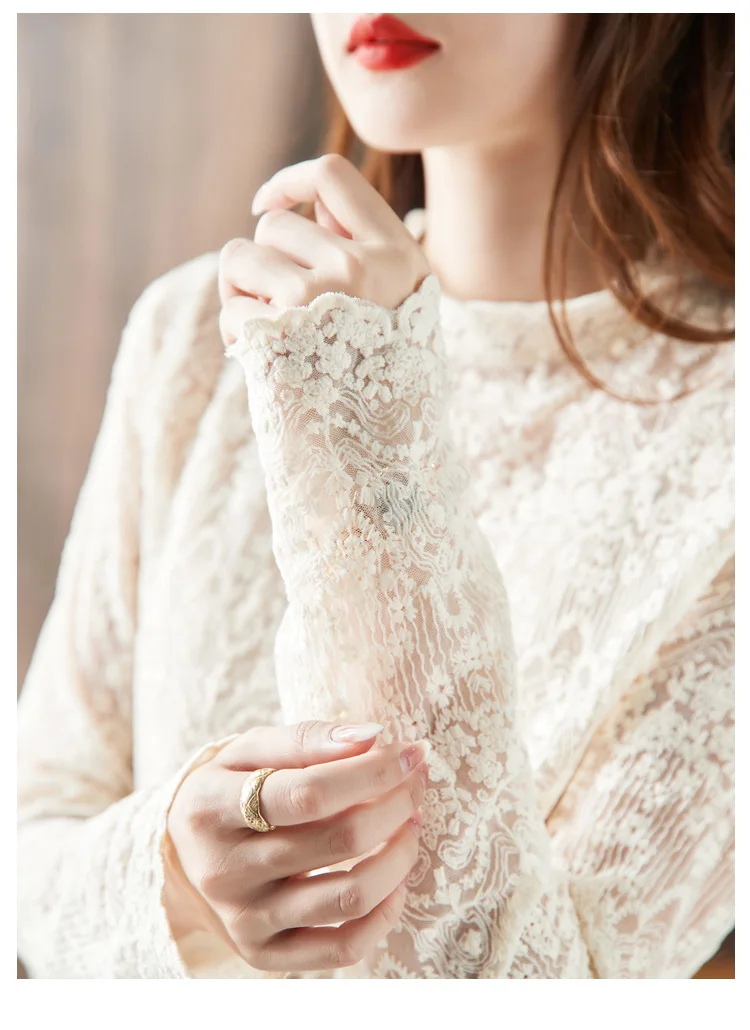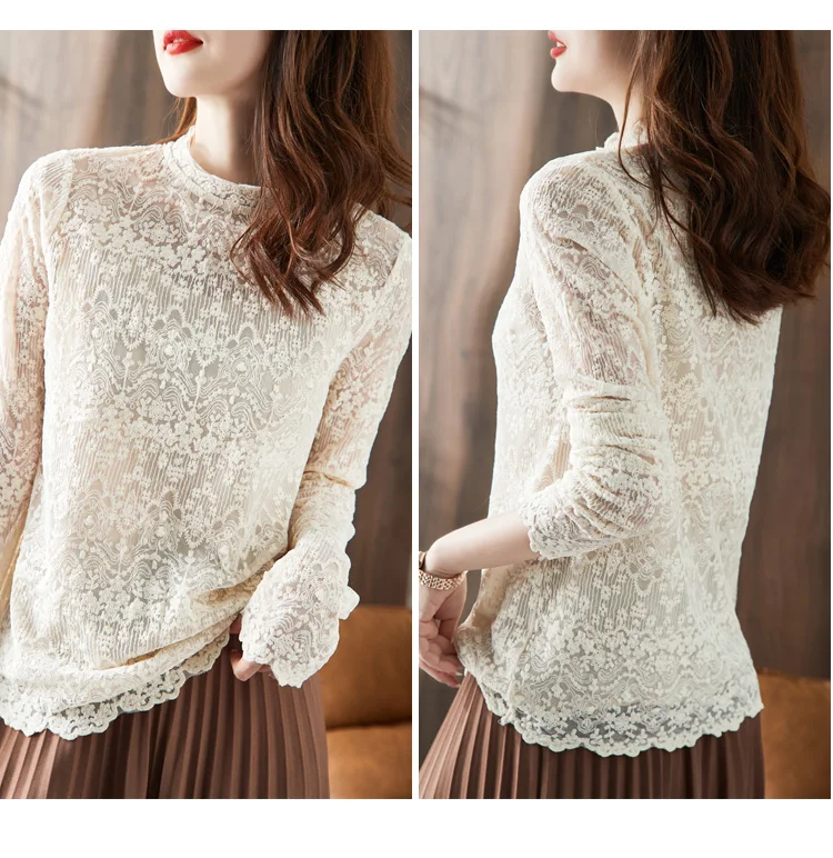 New 2021 Autumn Thin Stand Collar Lace Tops Fashion Casual Long Sleeve Hollow Out Women Blouse Shirt 3XL